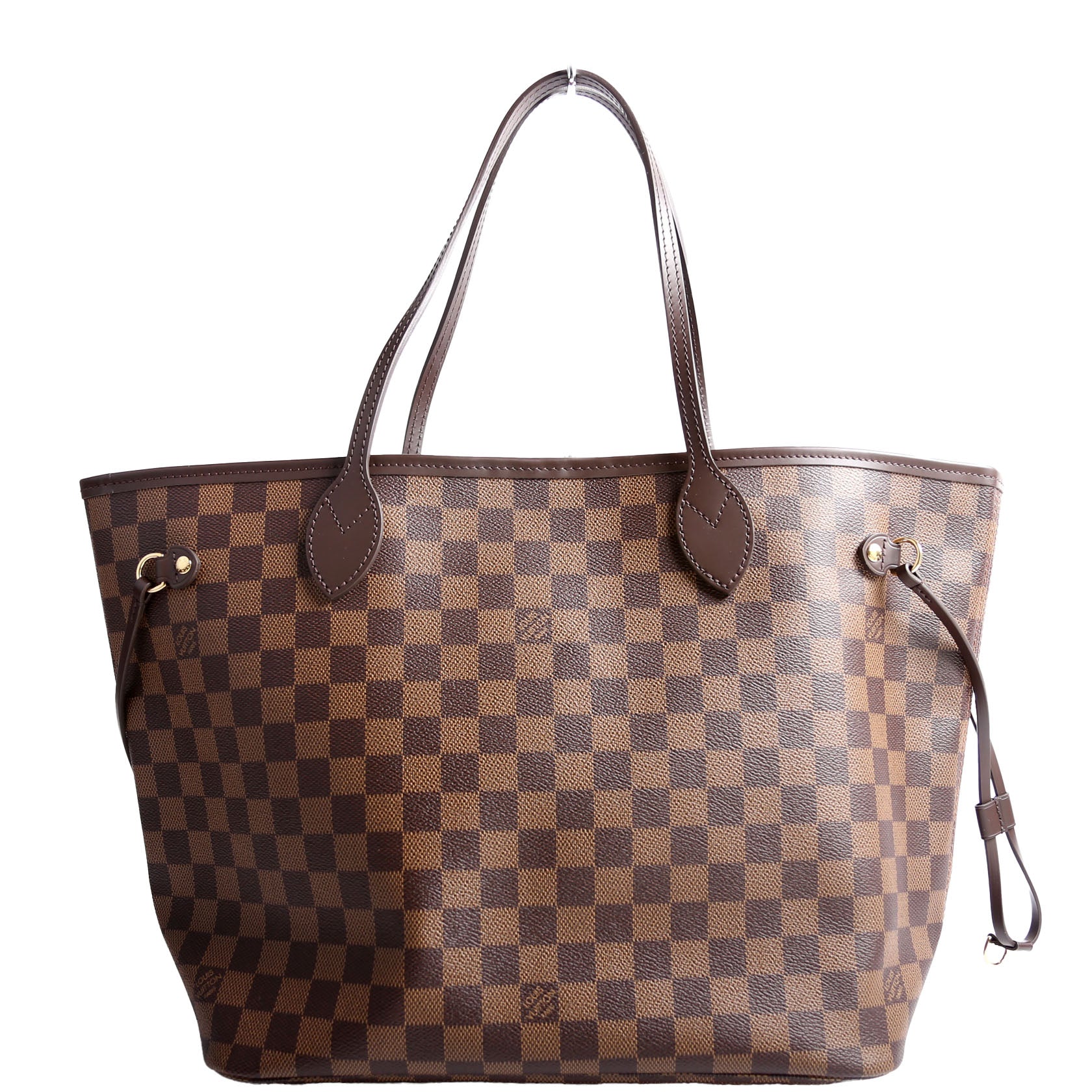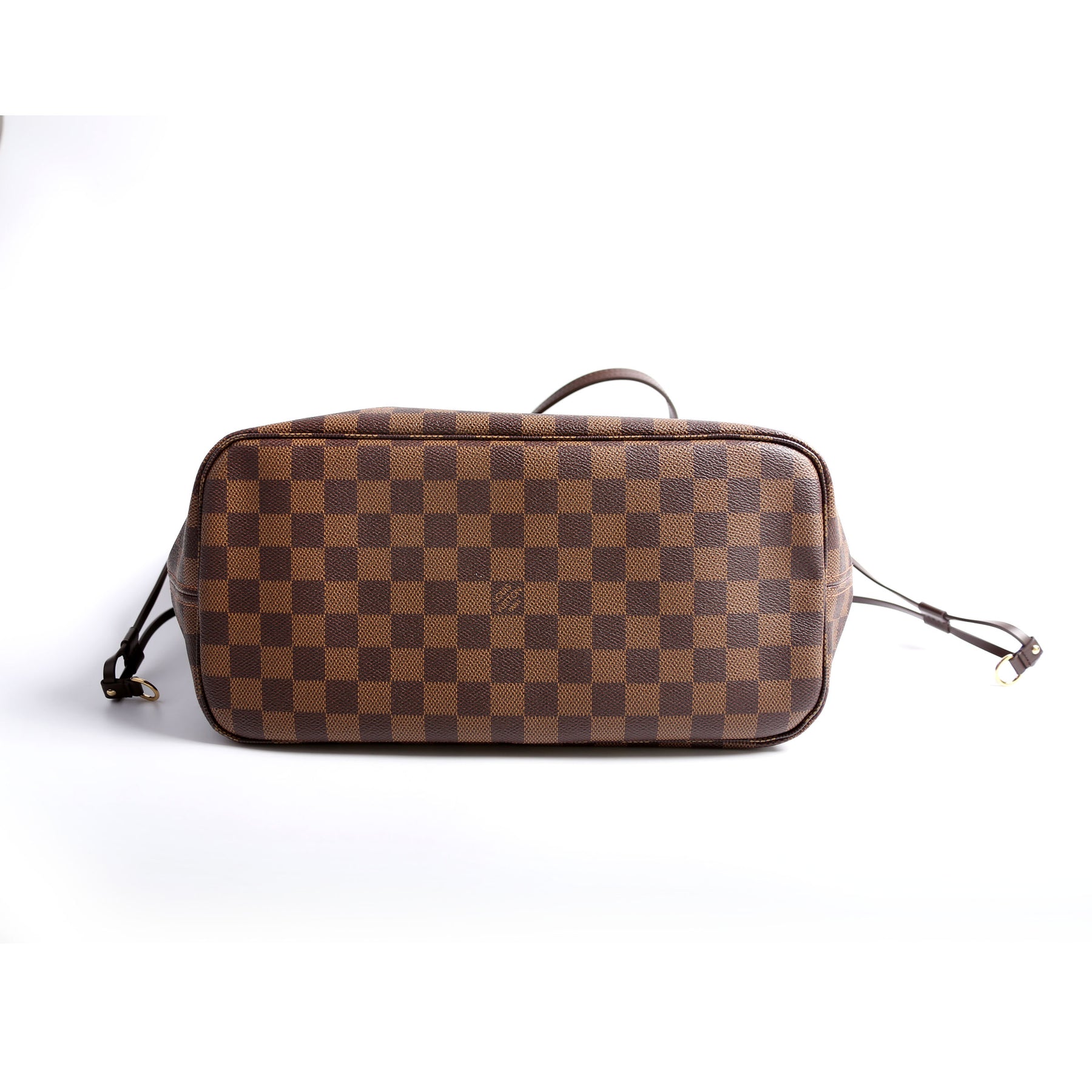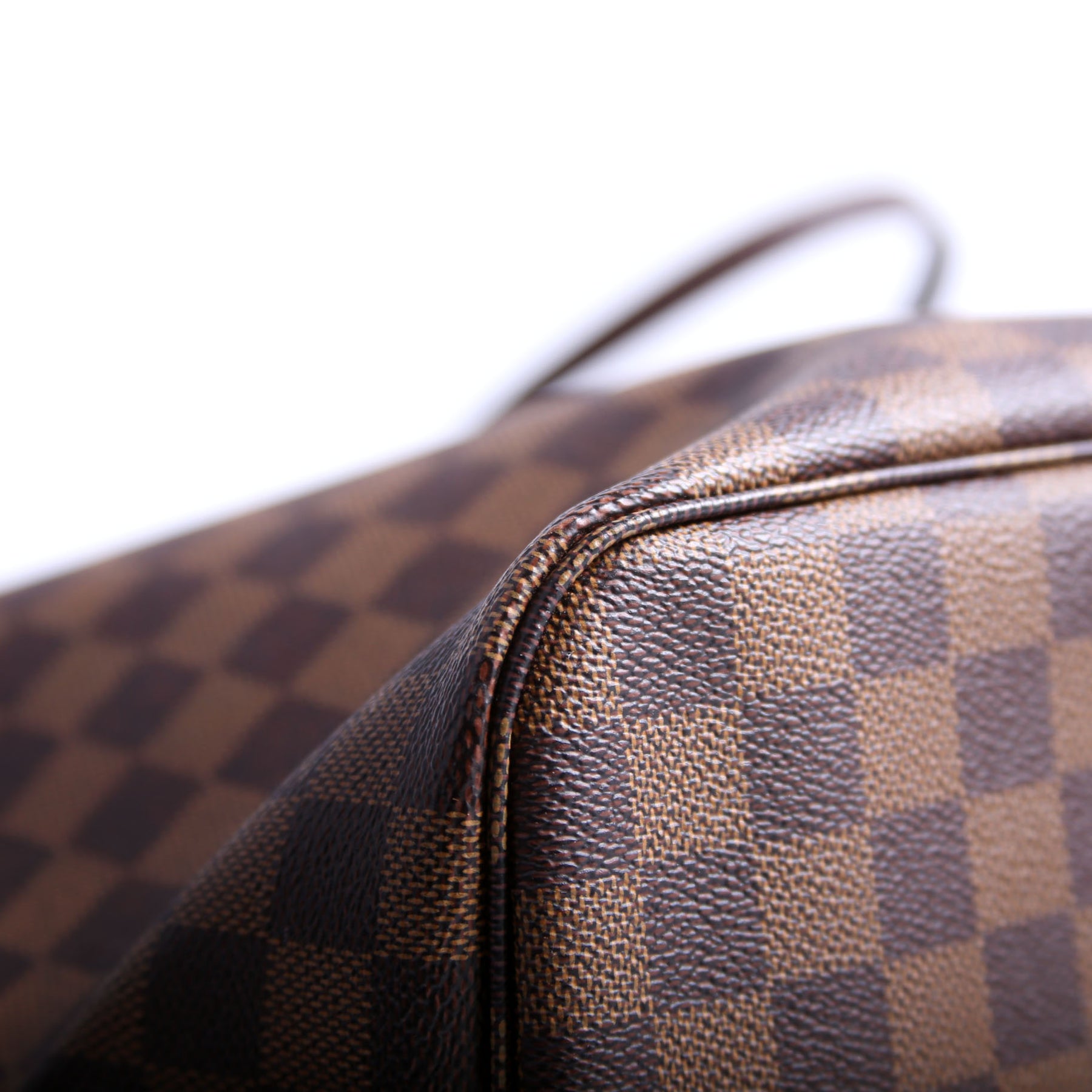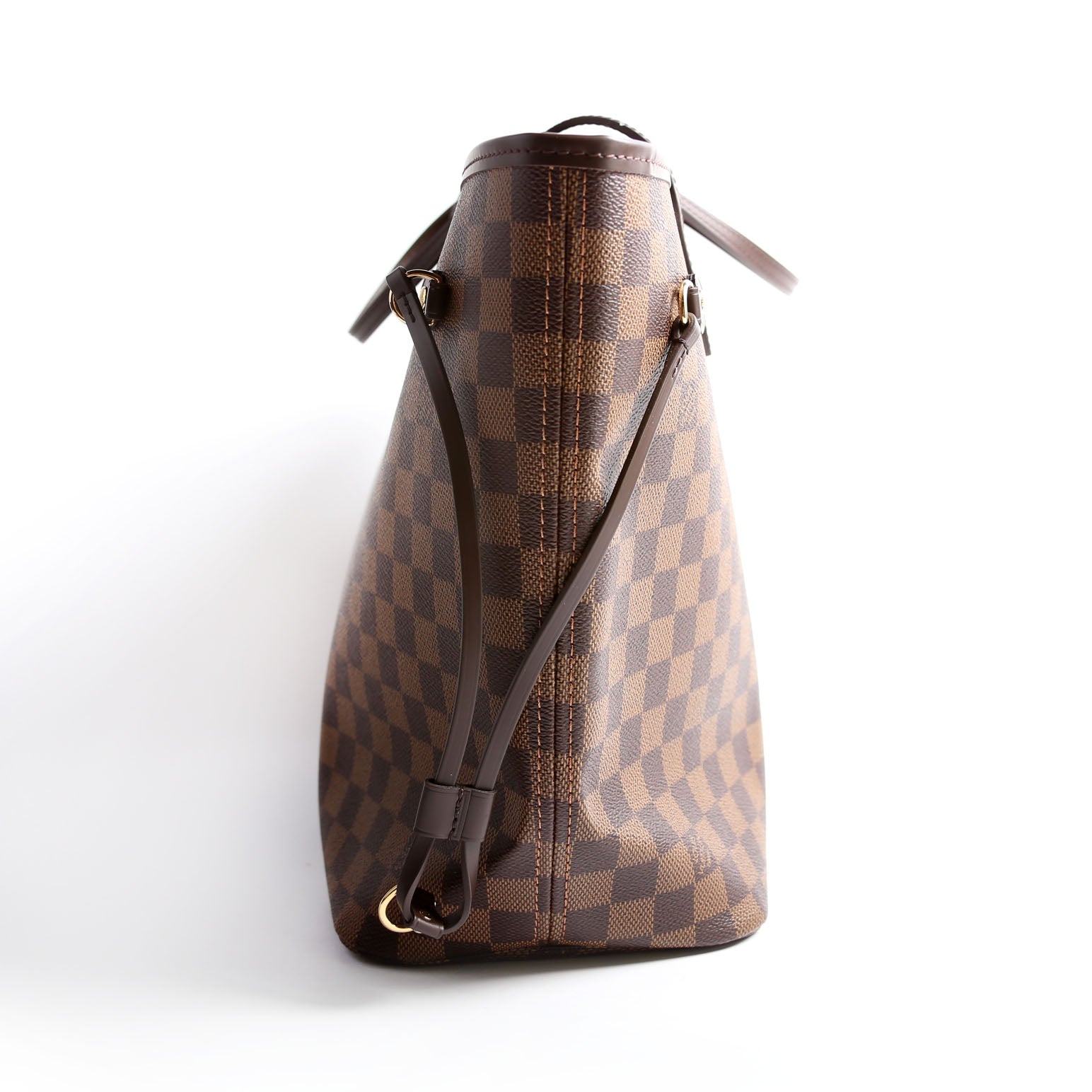 This pre-owned Louis Vuitton Neverfull MM W/Wallet is guaranteed 100% authentic. The exterior is in the classic Louis Vuitton Damier Ebene coated canvas.