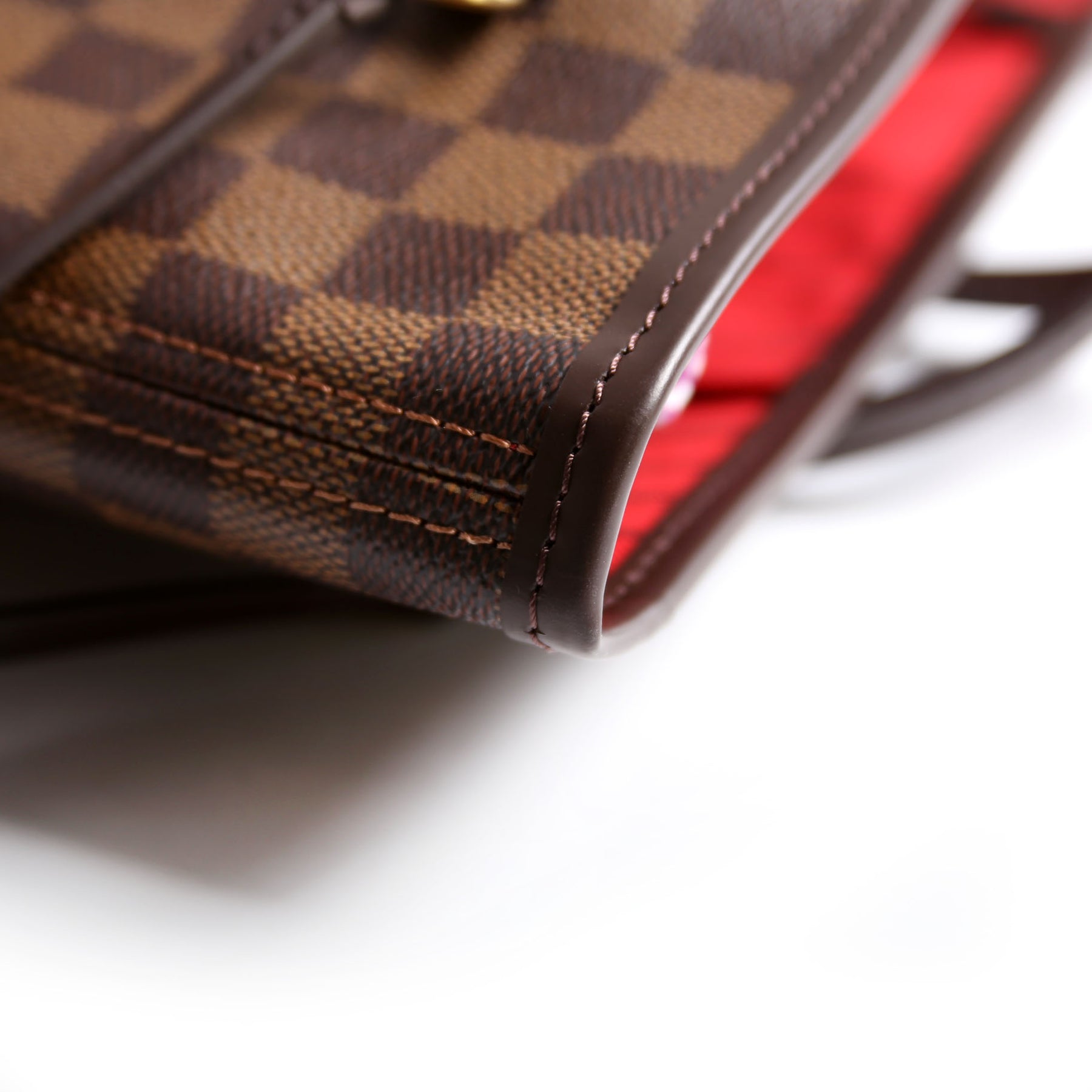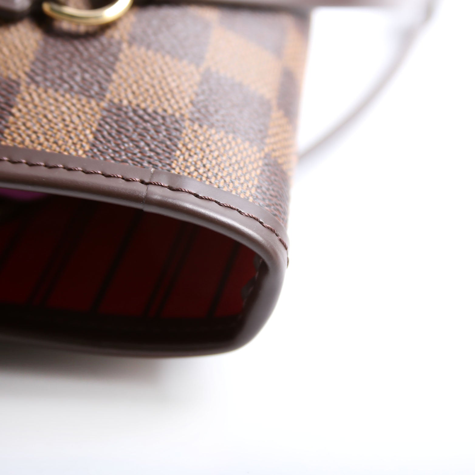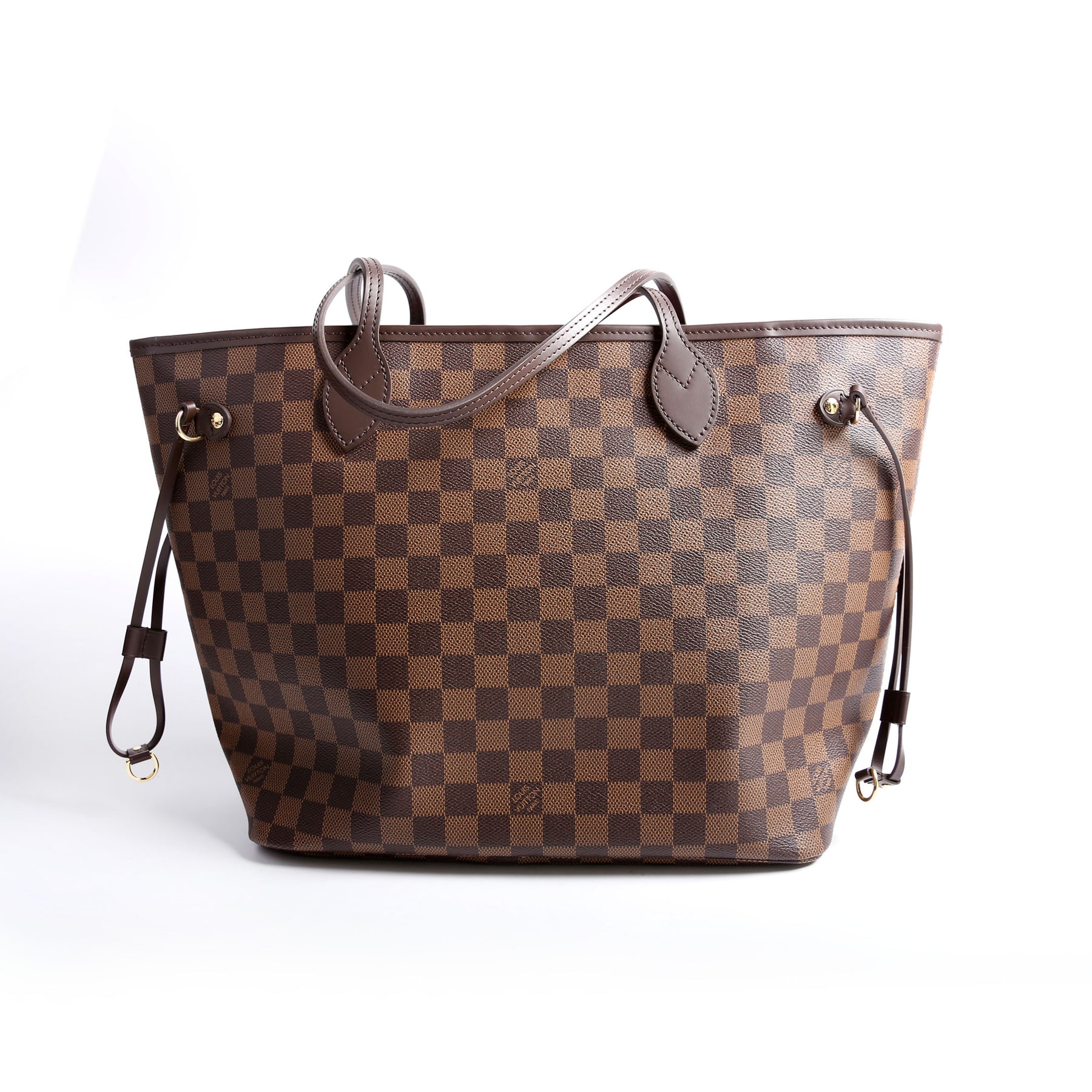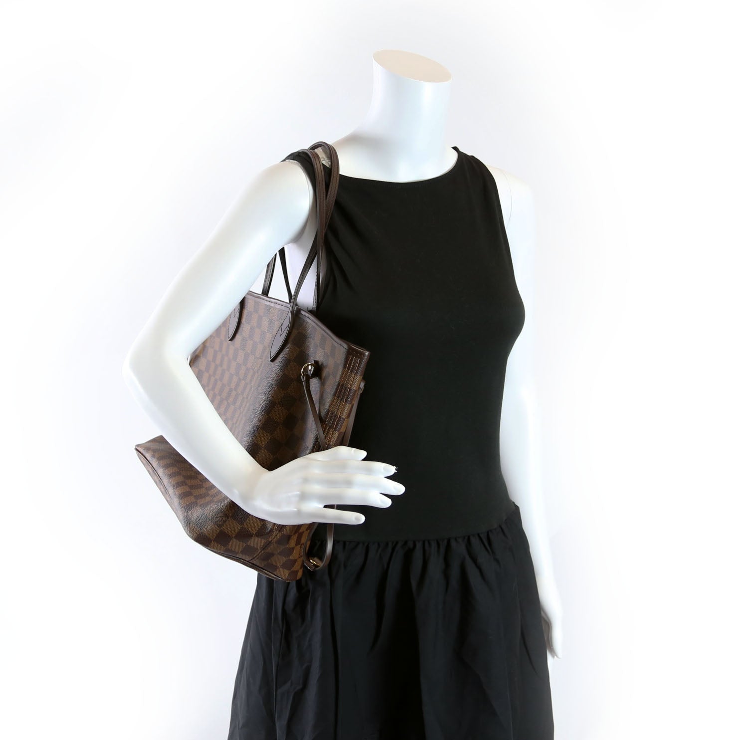 This pre-owned Louis Vuitton Neverfull MM W/Wallet is guaranteed 100% authentic. The exterior is in the classic Louis Vuitton Damier Ebene coated canvas.