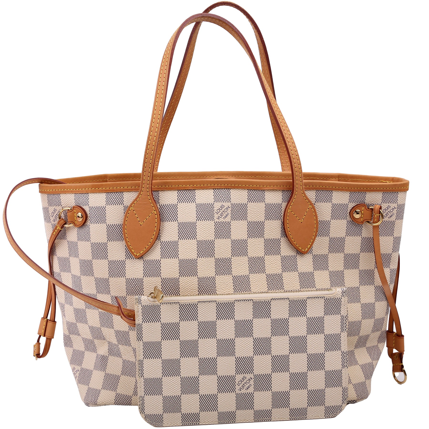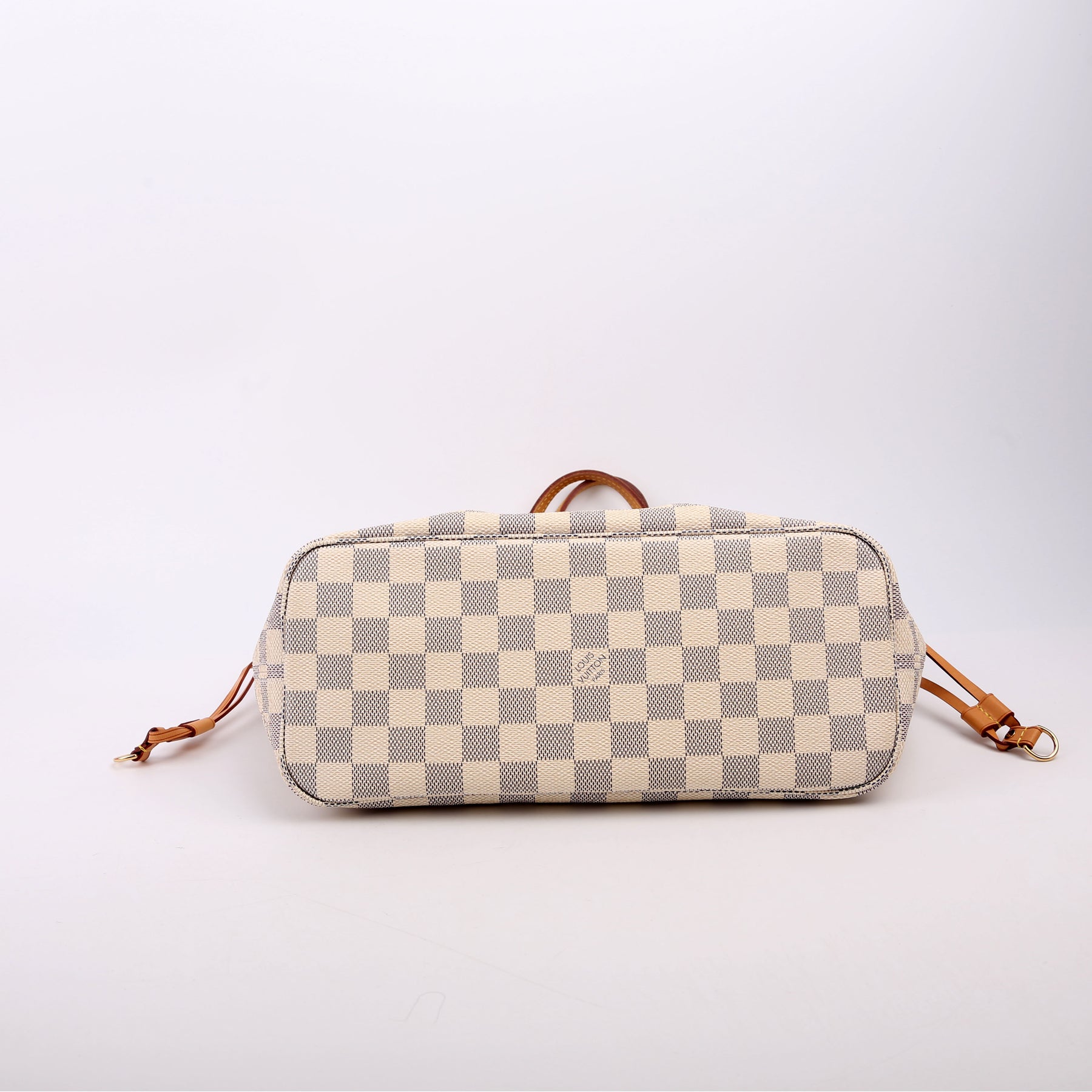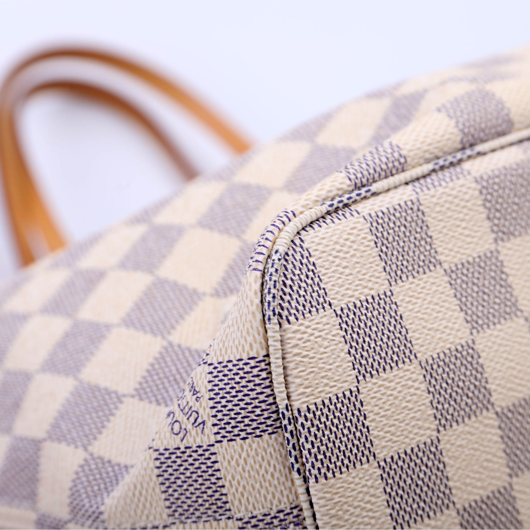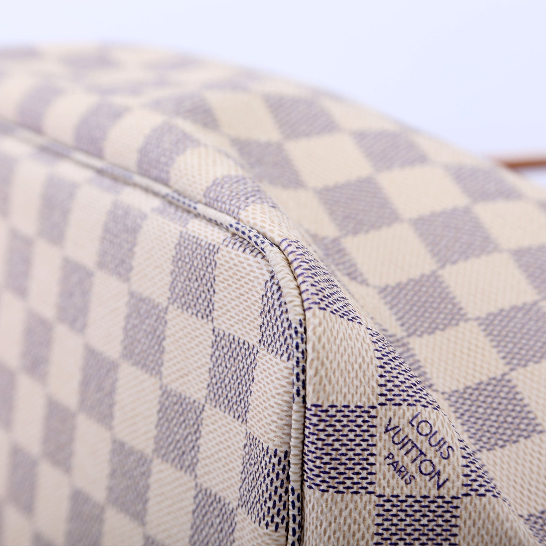 This pre-owned Louis Vuitton Neverfull With Wallet PM is guaranteed 100% authentic. The exterior is in the classic Louis Vuitton Damier Azur coated canvas.