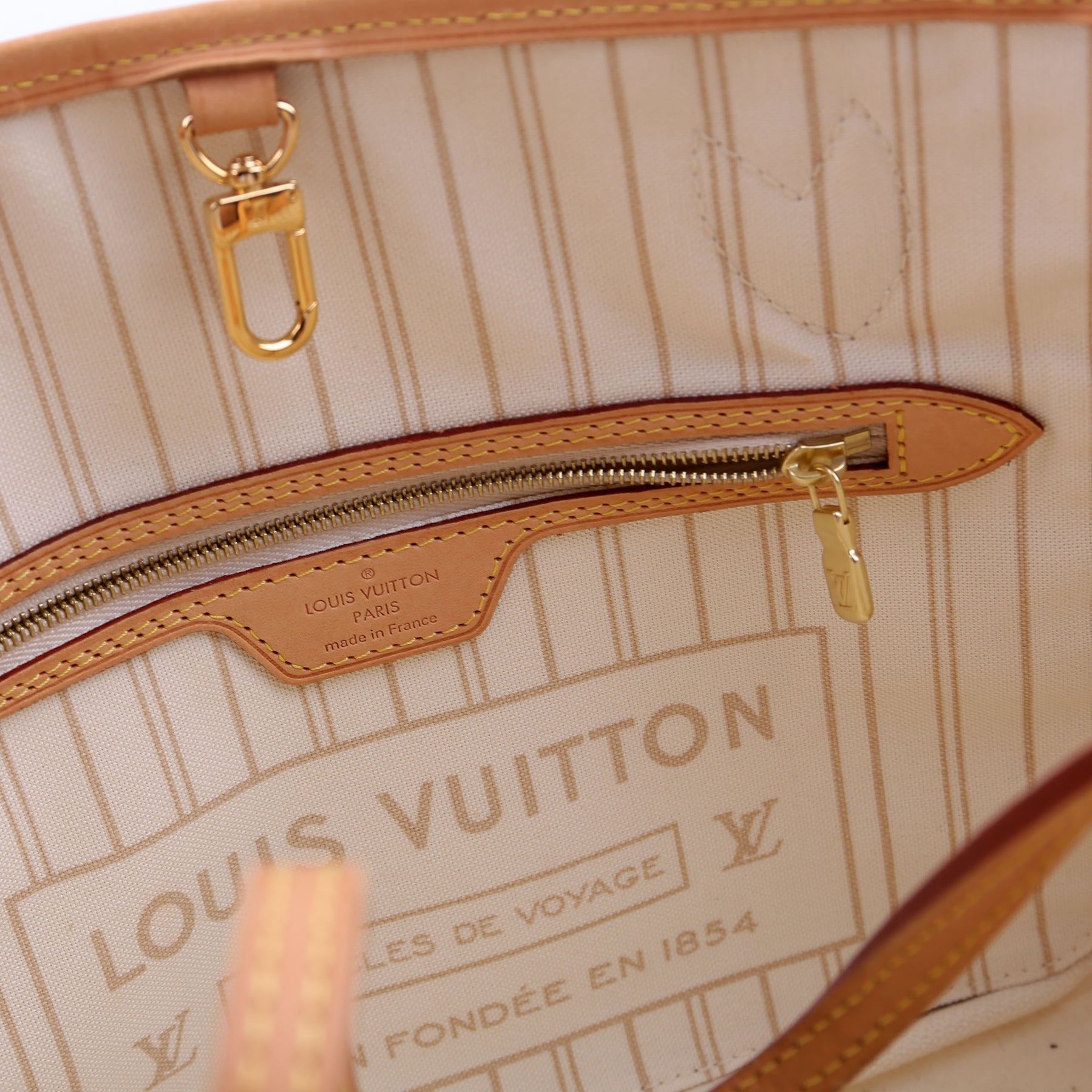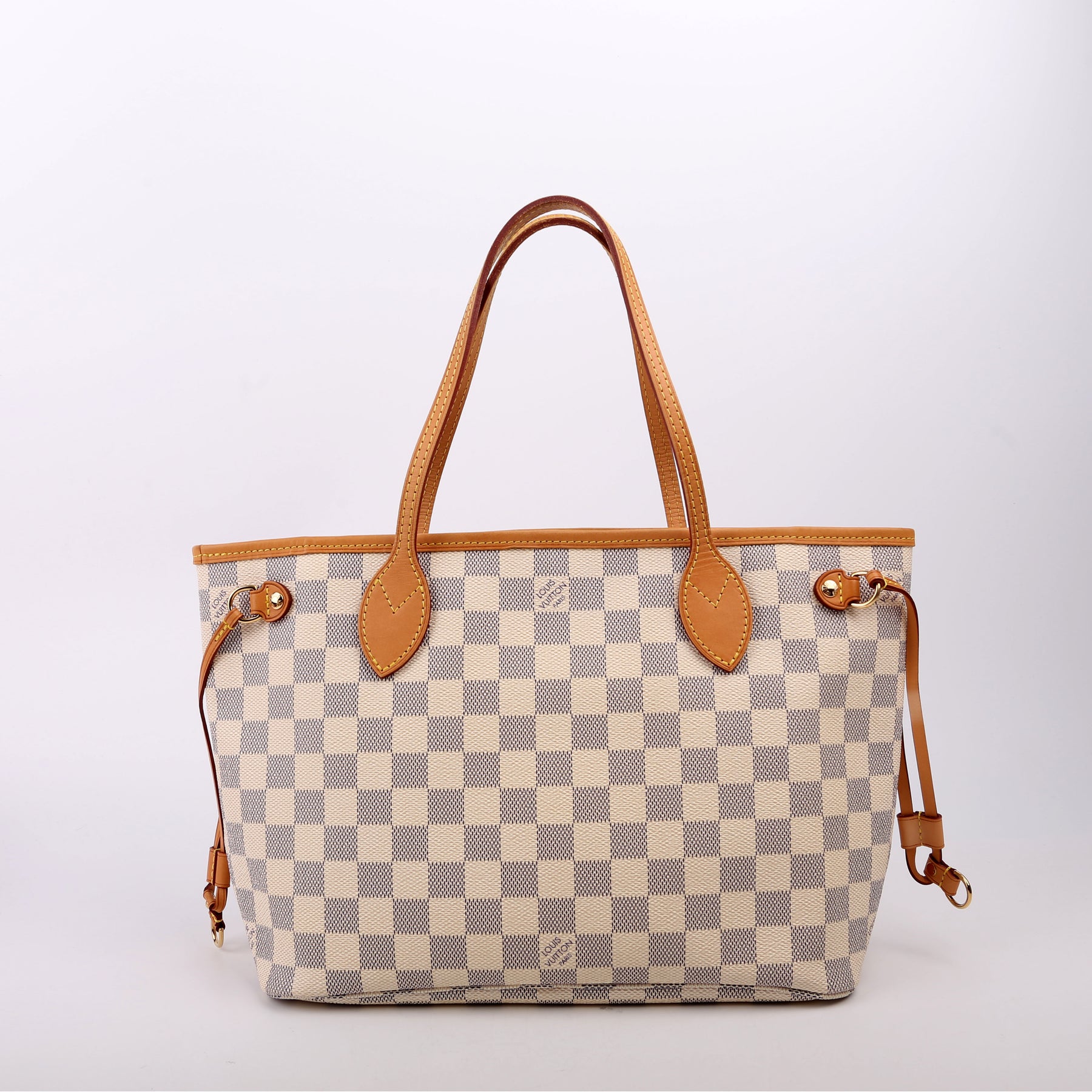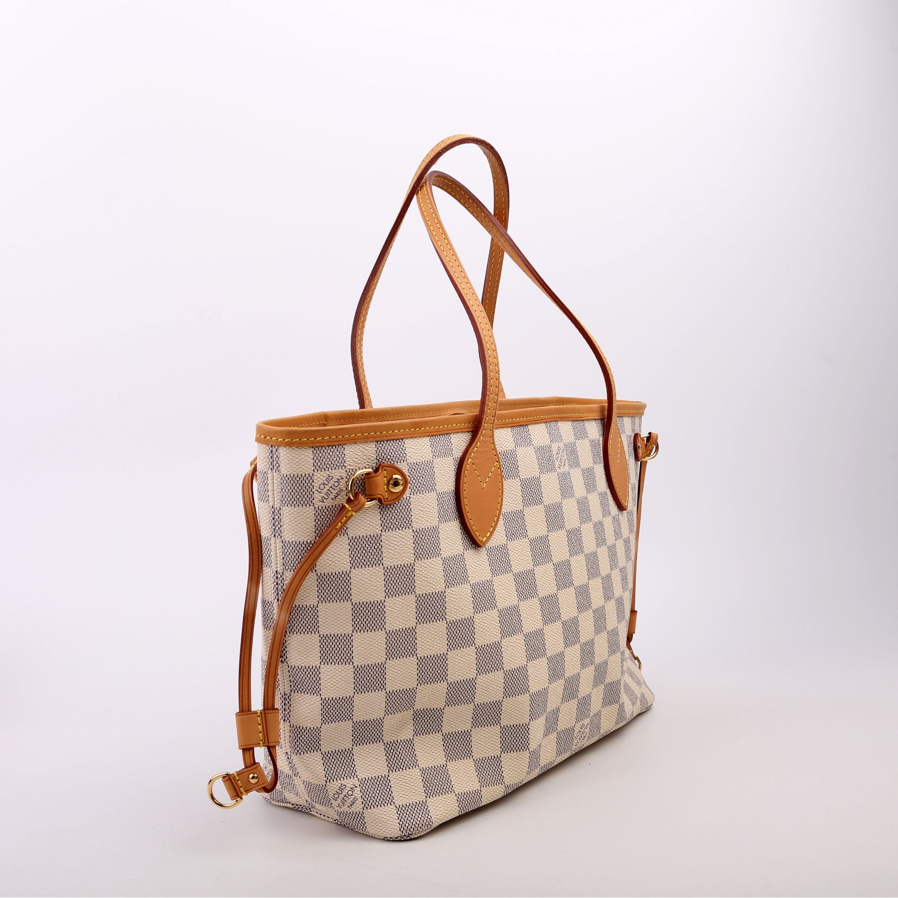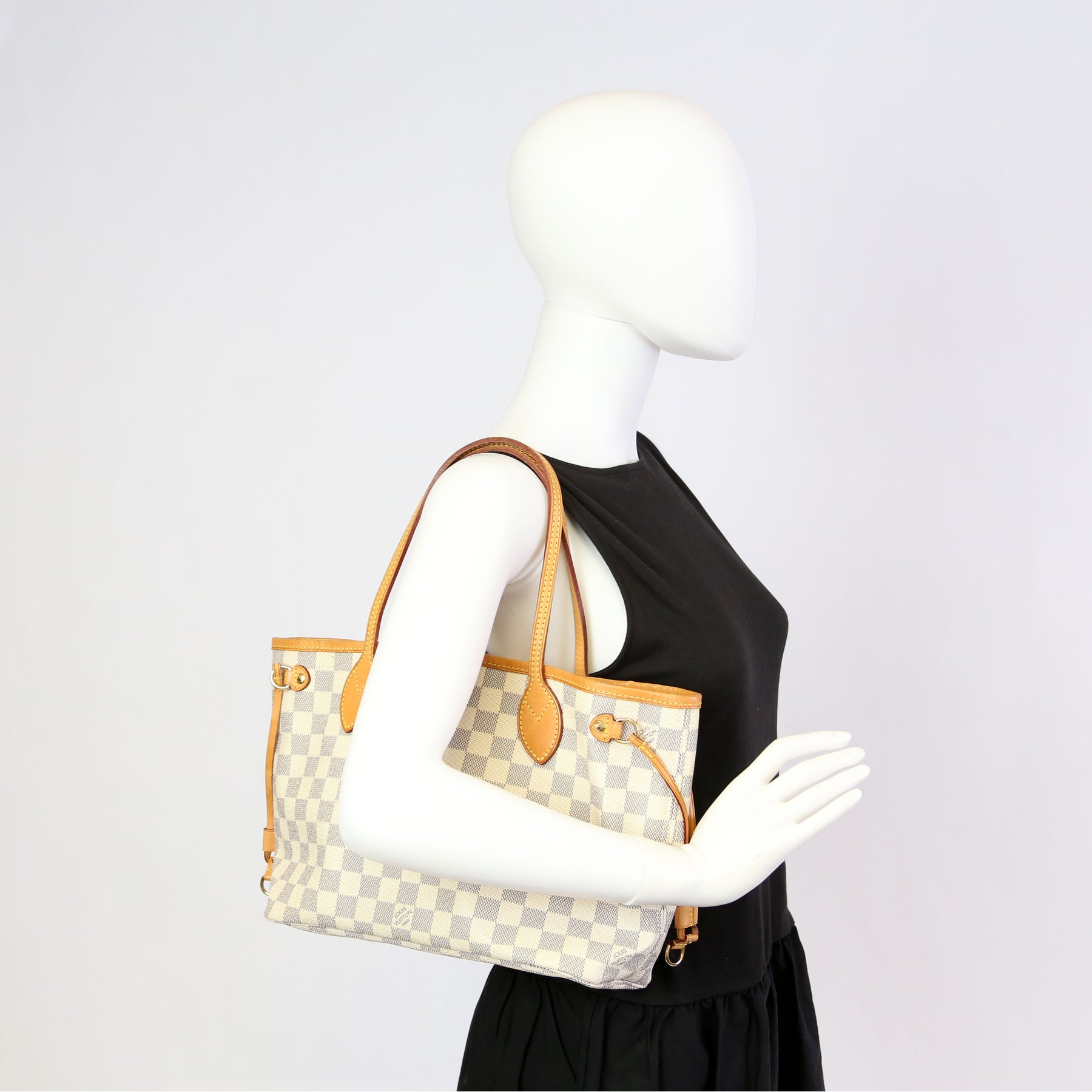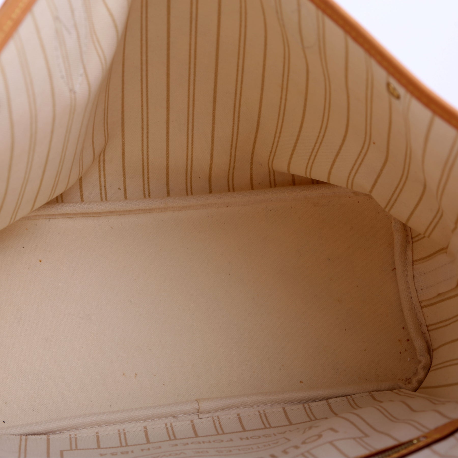 This pre-owned Louis Vuitton Neverfull With Wallet PM is guaranteed 100% authentic. The exterior is in the classic Louis Vuitton Damier Azur coated canvas.
