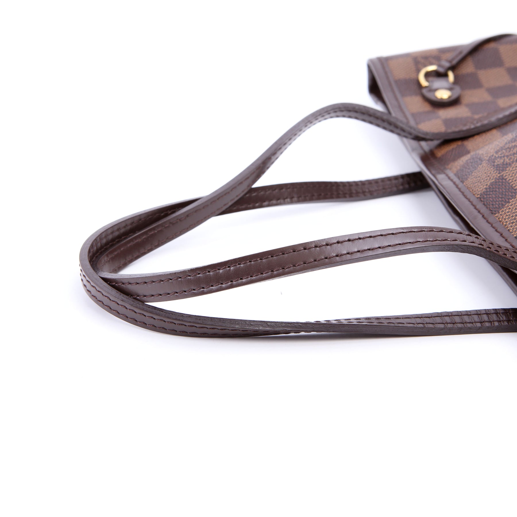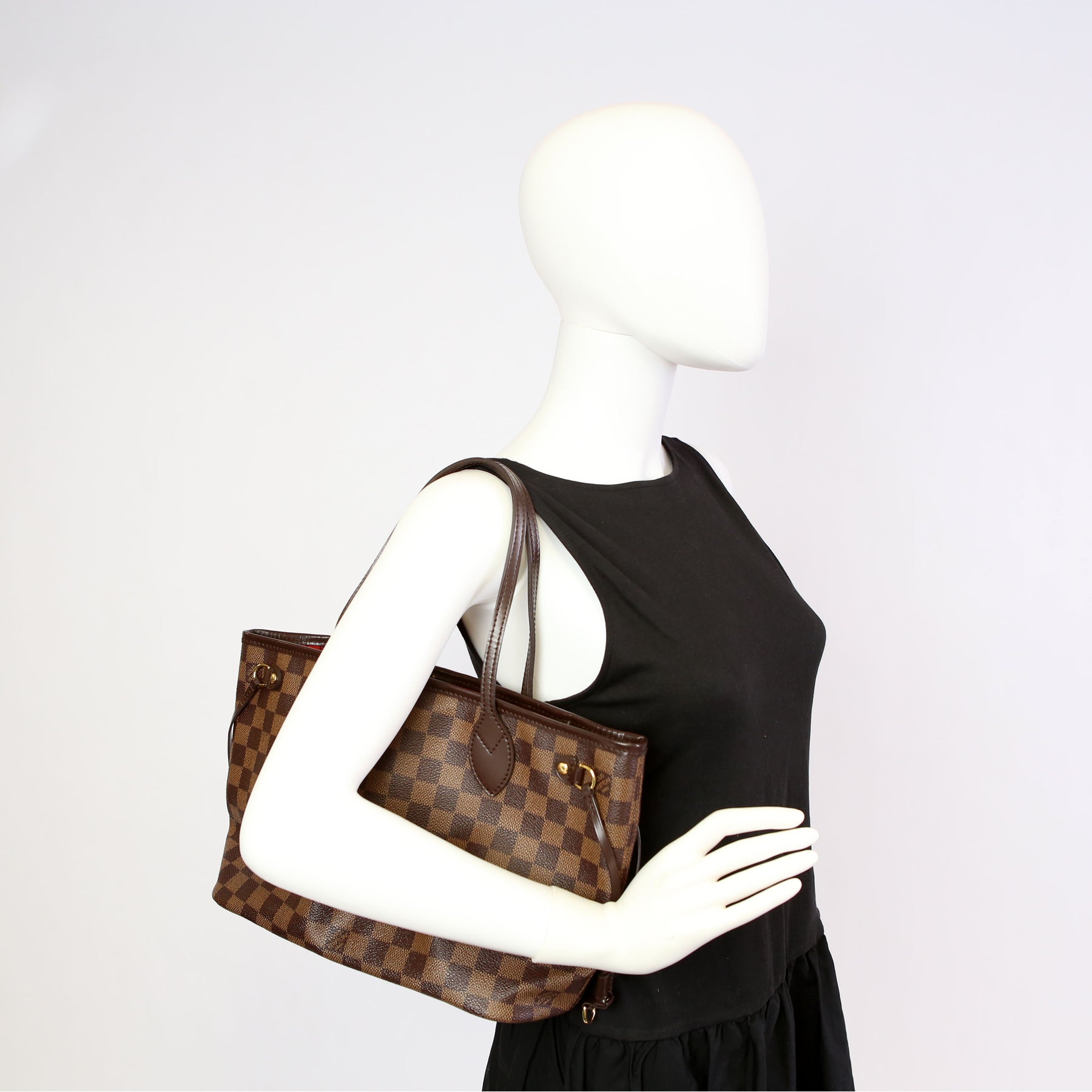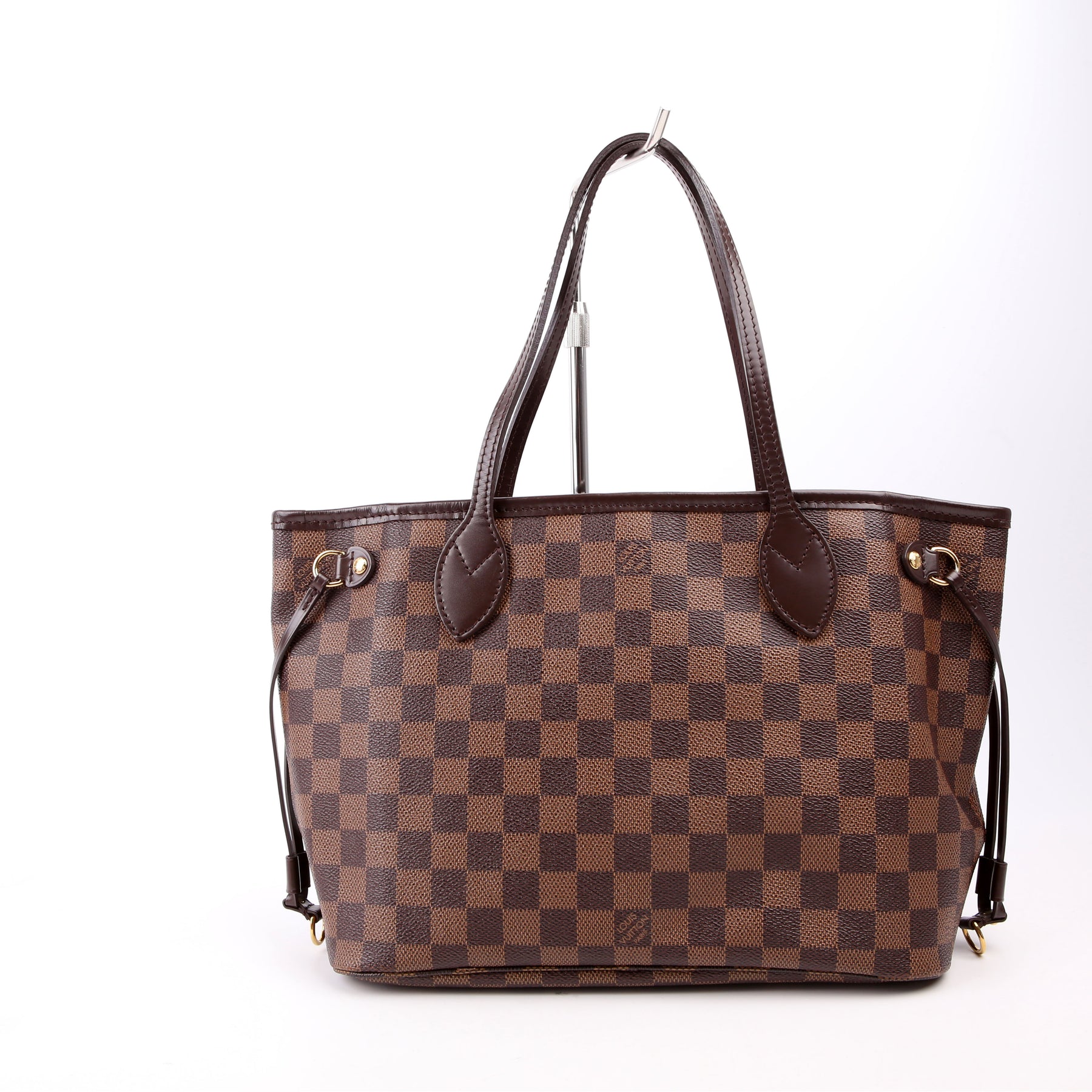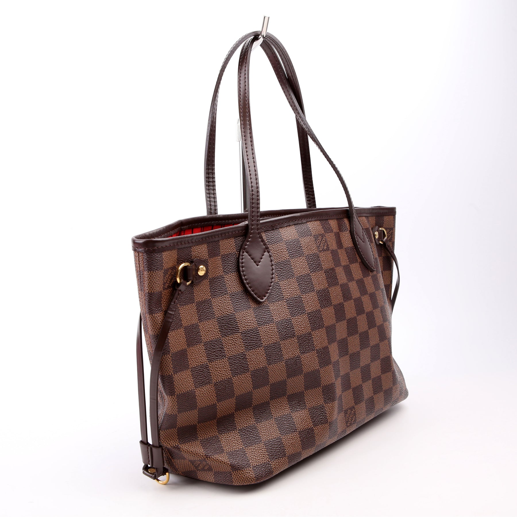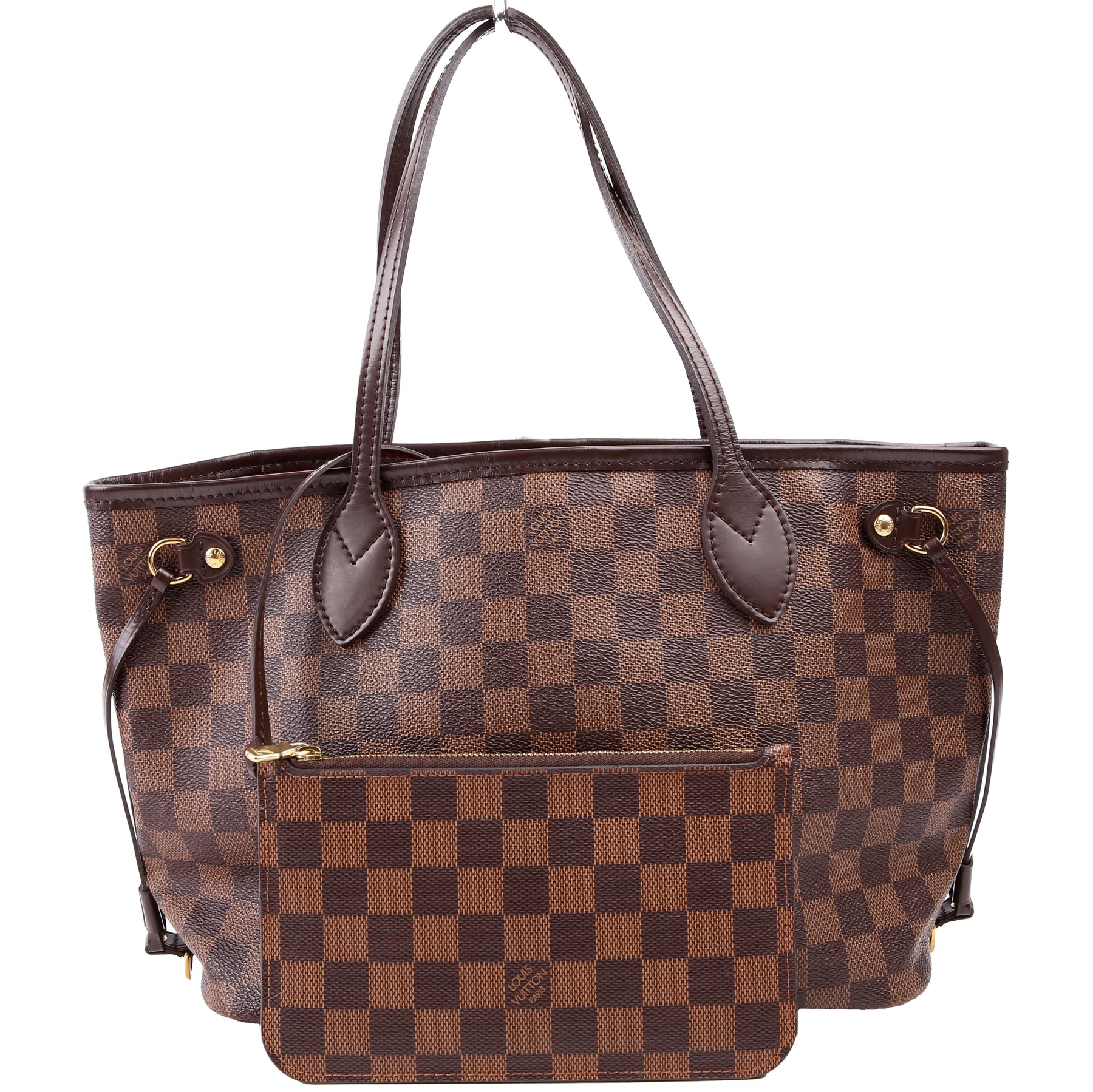 This pre-owned Louis Vuitton Neverfull with Wallet PM is guaranteed 100% authentic. The exterior is in the classic Louis Vuitton Damier Ebene coated canvas.