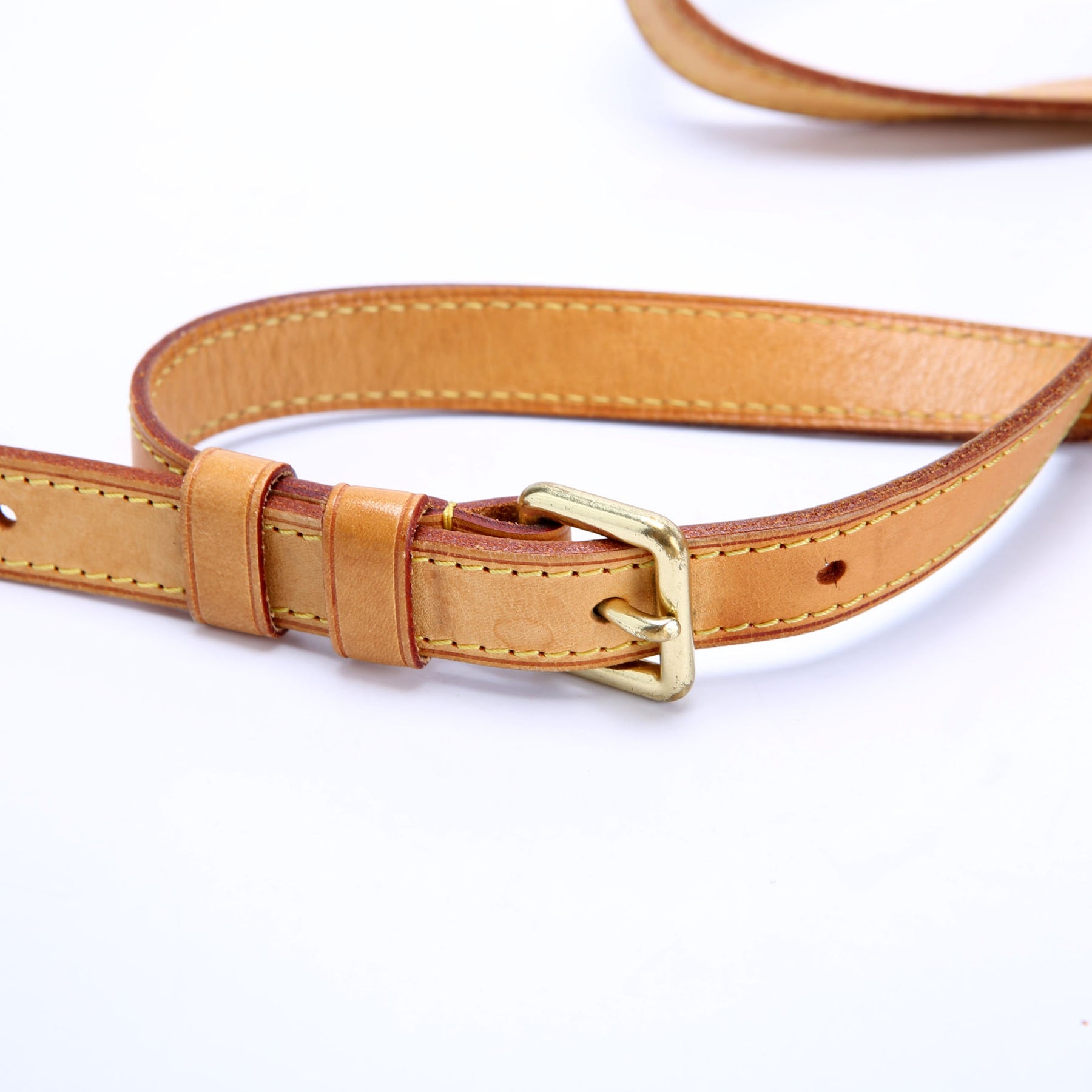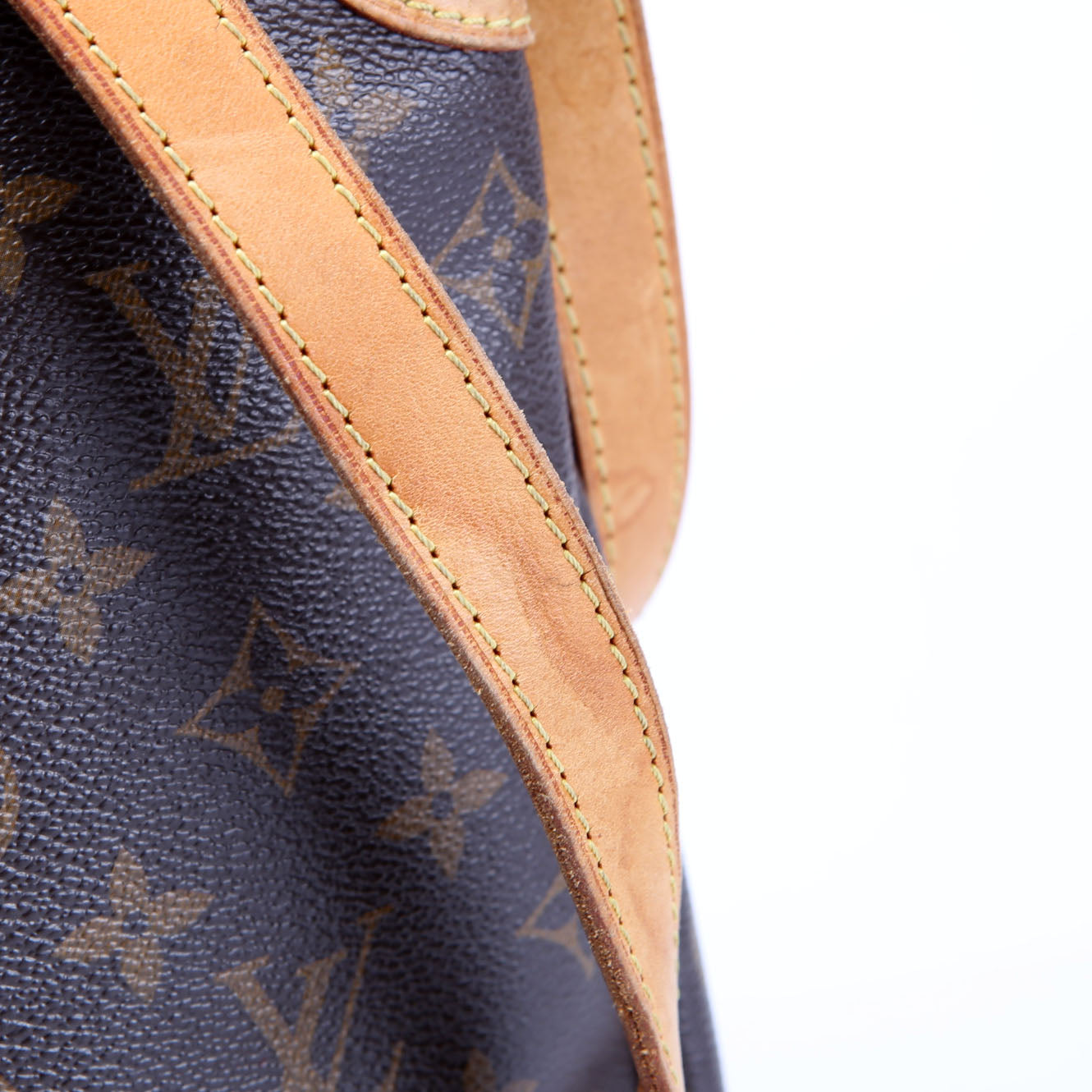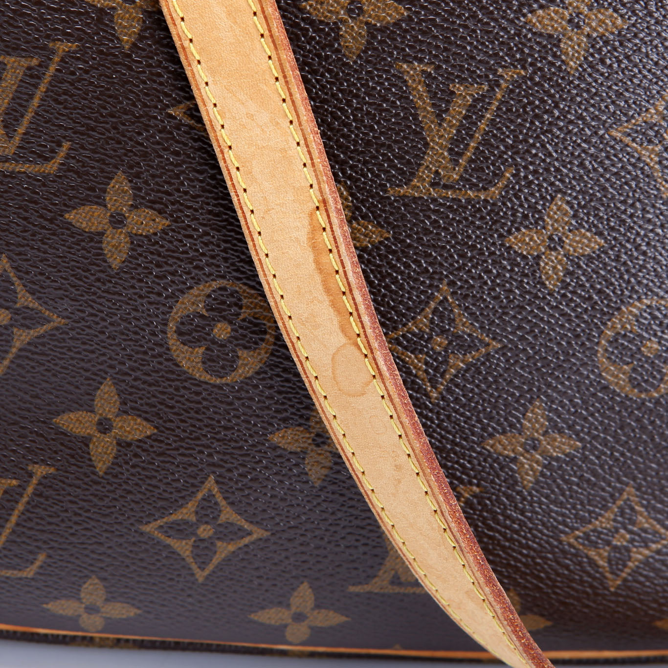 Strap: The leather strap shows heavy staining. The seam shows splitting throughout.