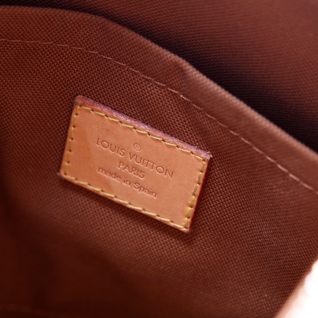 Interior: The interior shows staining throughout. It features two open pockets.