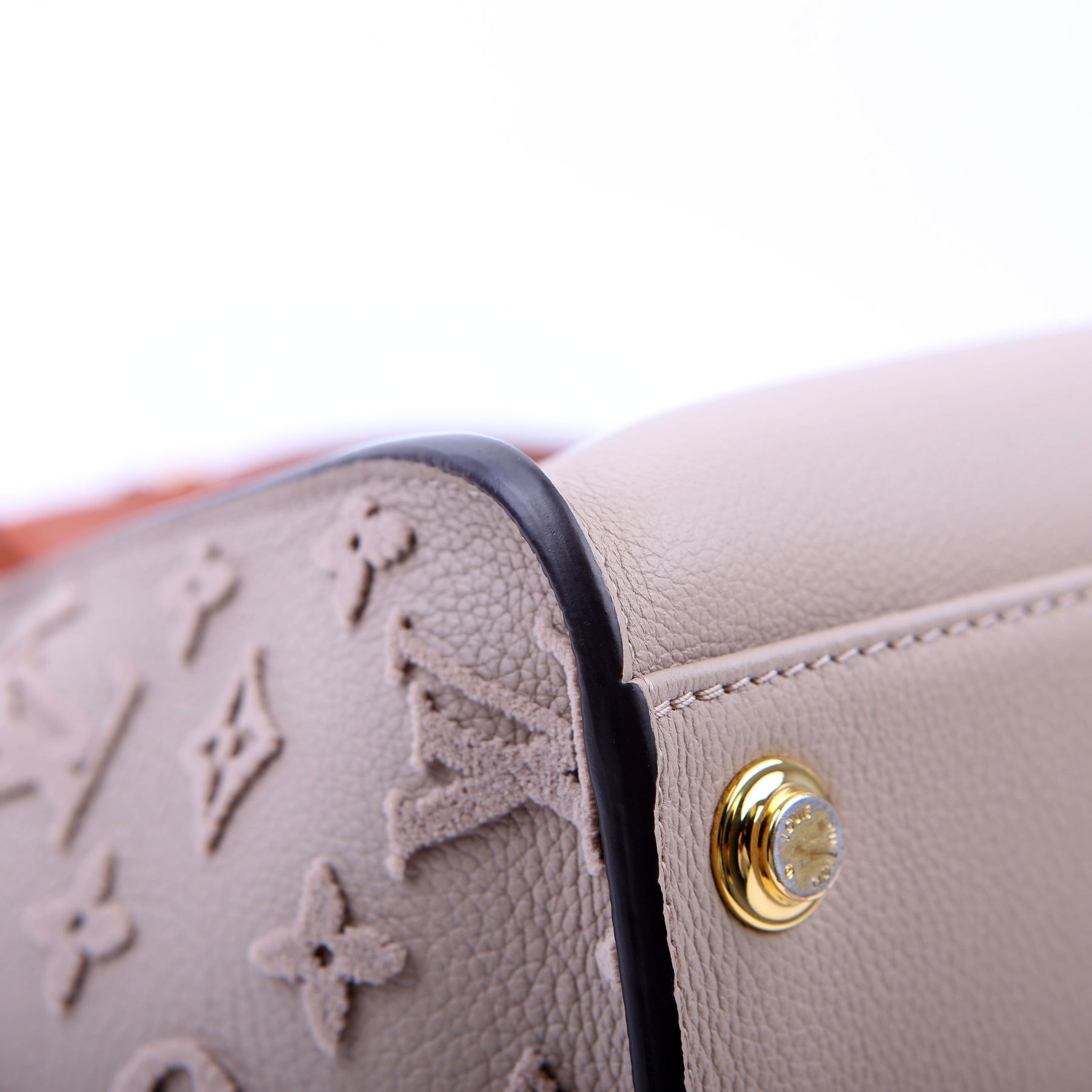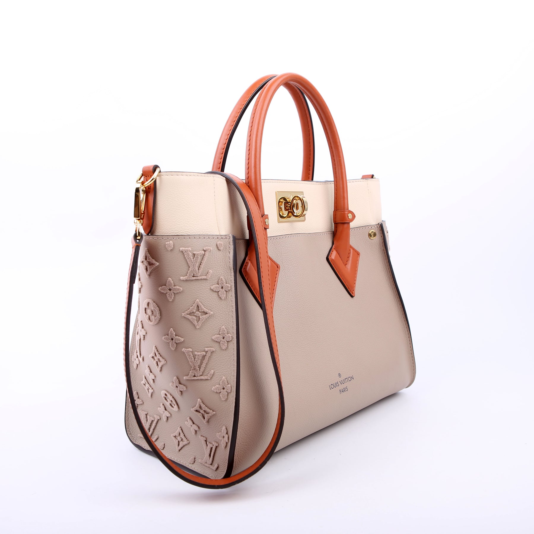 This pre-owned Louis Vuitton On My Side MM is guaranteed 100% authentic. The exterior is in the classic Louis Vuitton Calfskin leather.