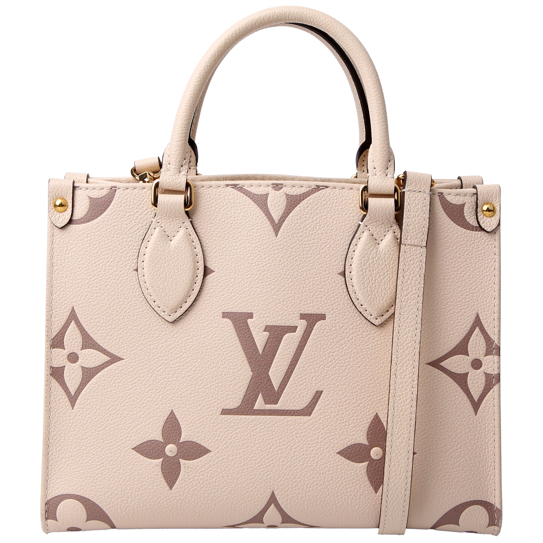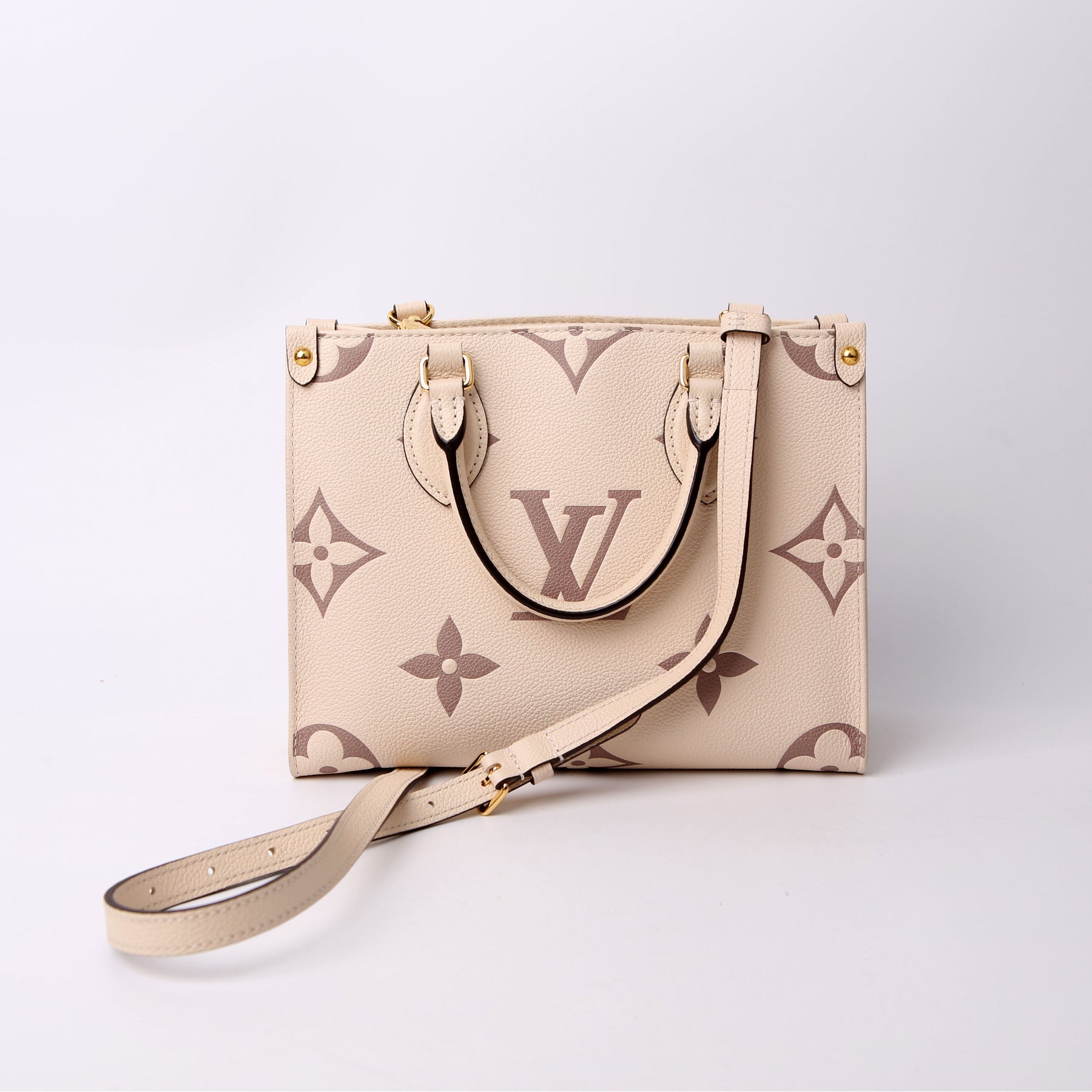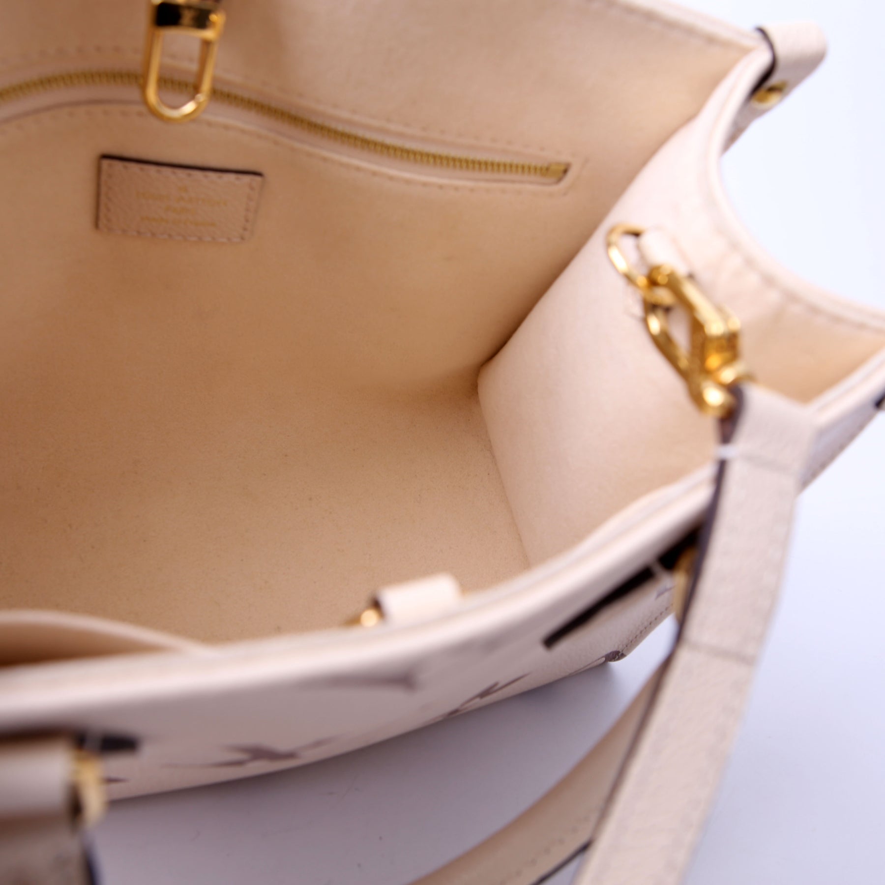 This pre-owned Louis Vuitton ONTHEGO PM Bicolor is guaranteed 100% authentic. The exterior is in the classic Louis Vuitton Empreinte leather.