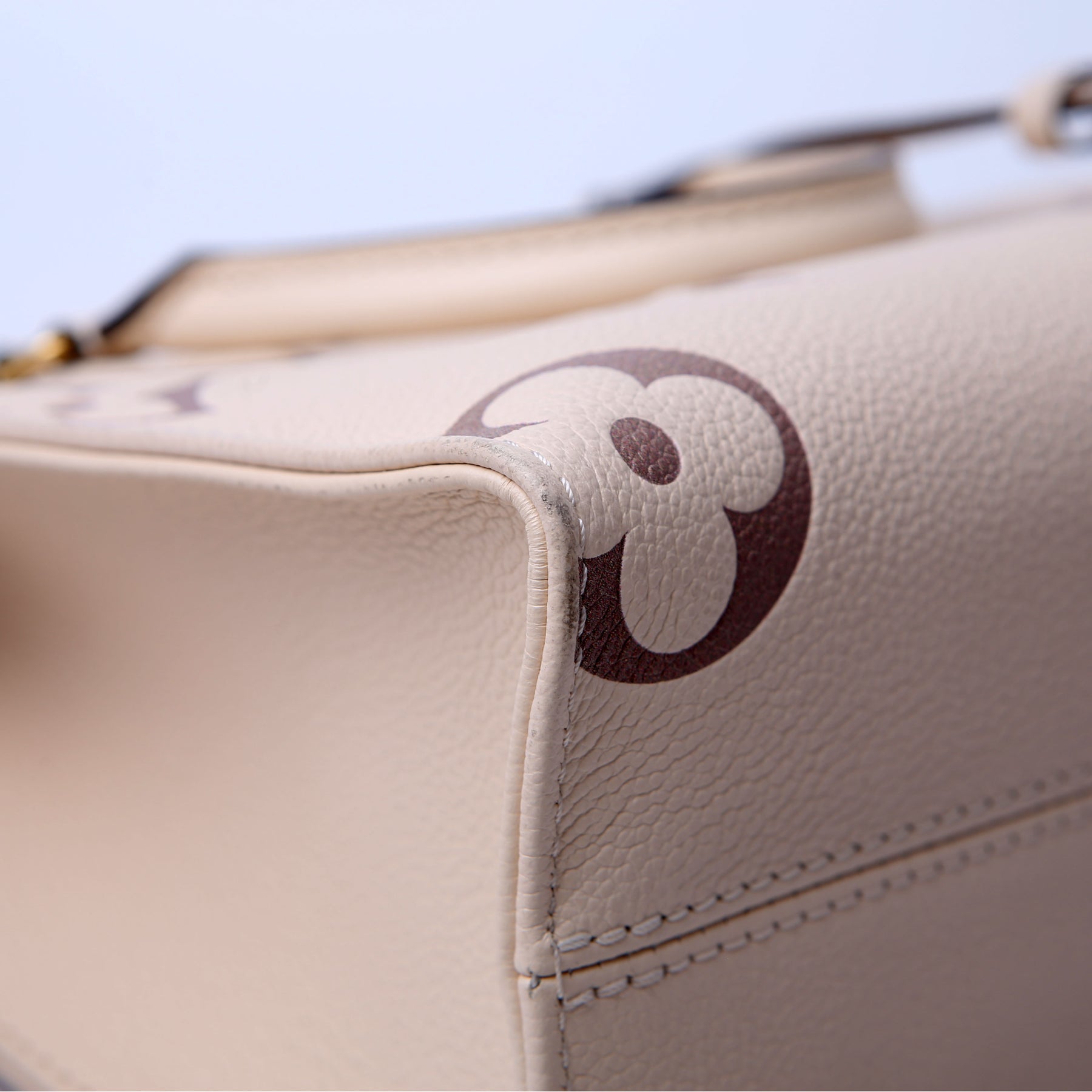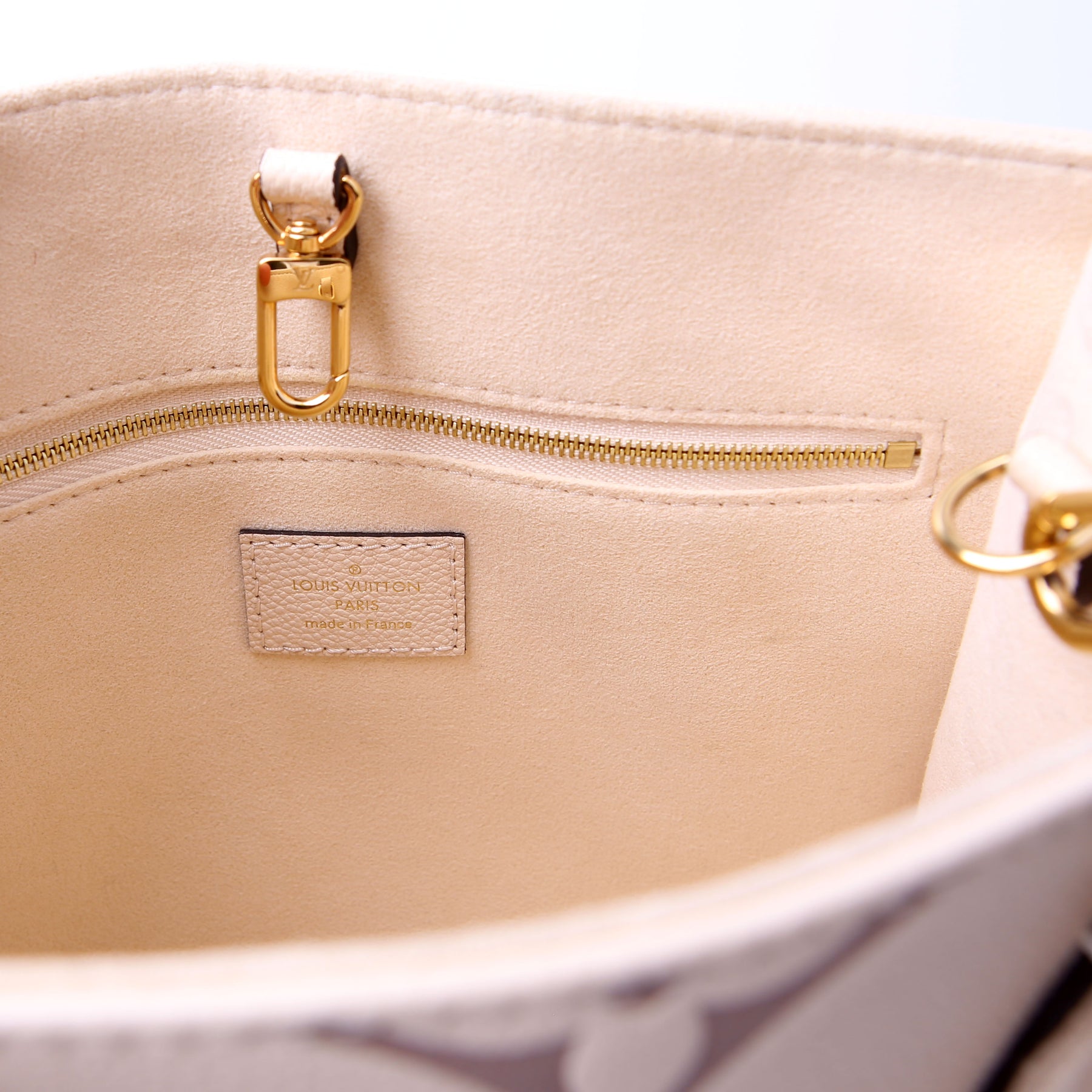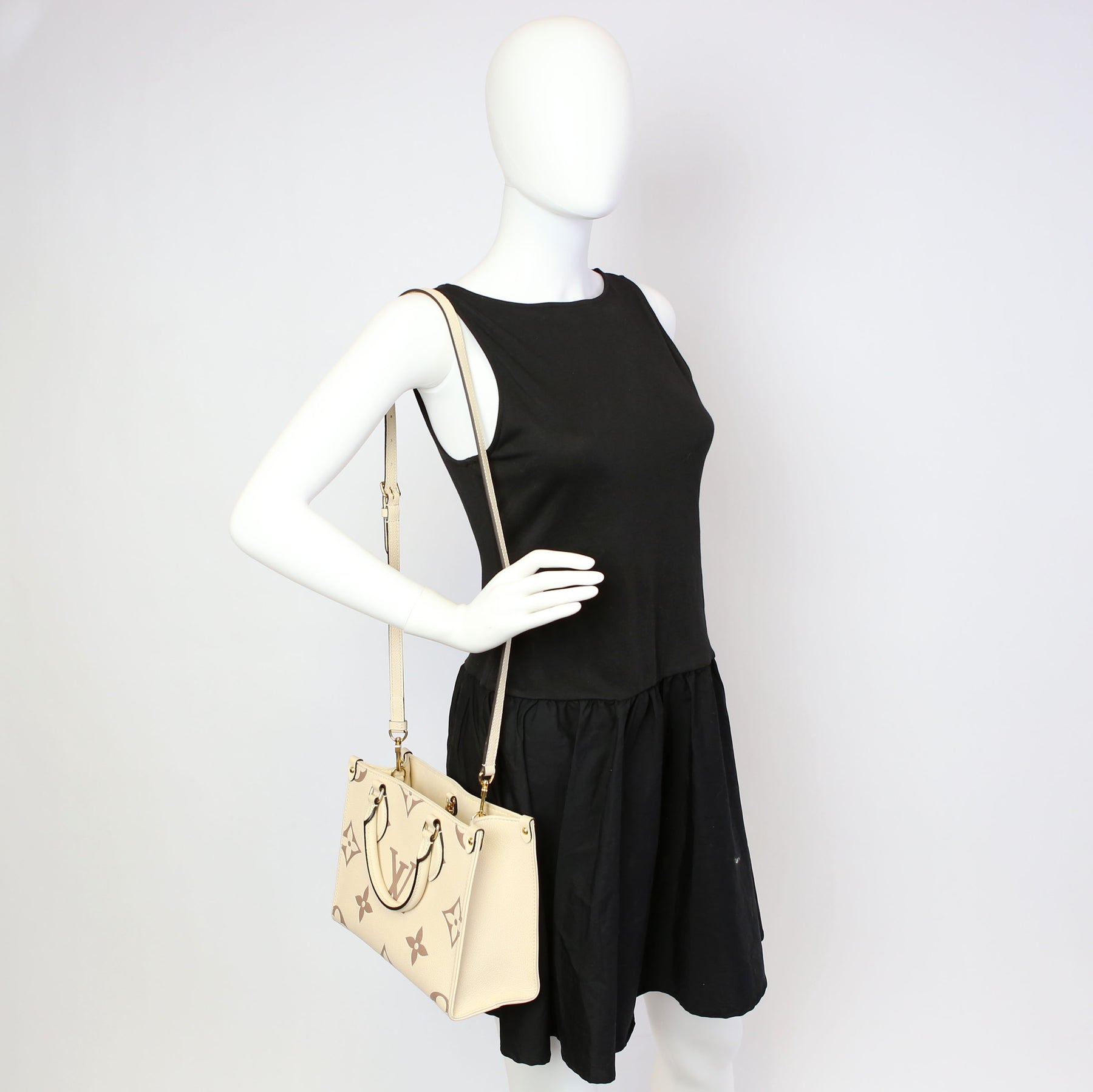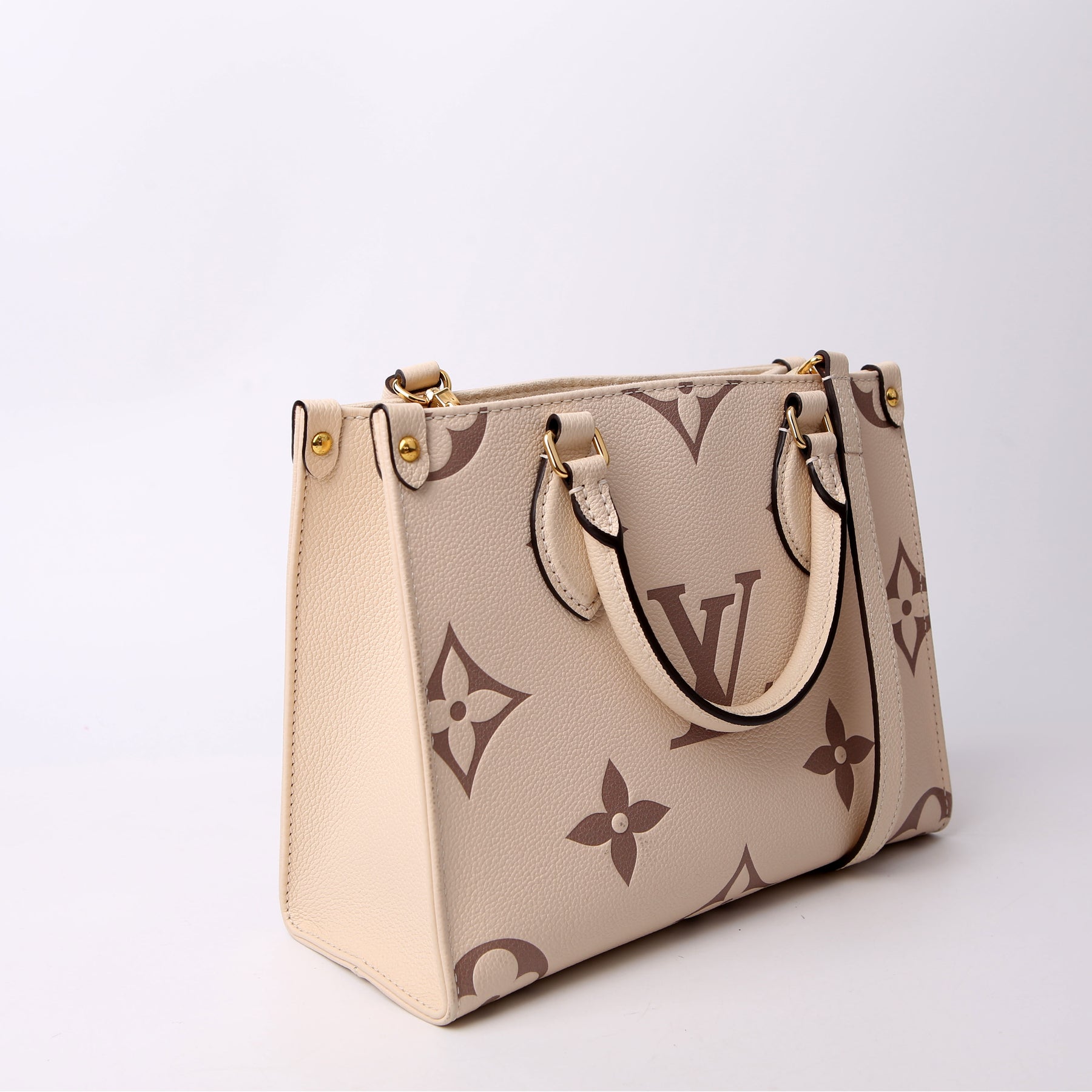 This pre-owned Louis Vuitton ONTHEGO PM Bicolor is guaranteed 100% authentic. The exterior is in the classic Louis Vuitton Empreinte leather.