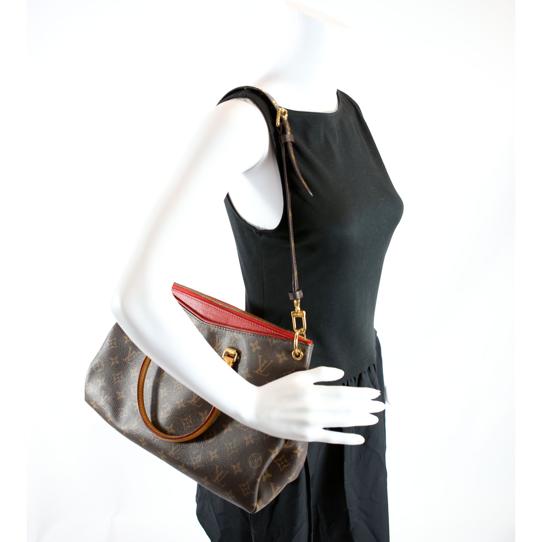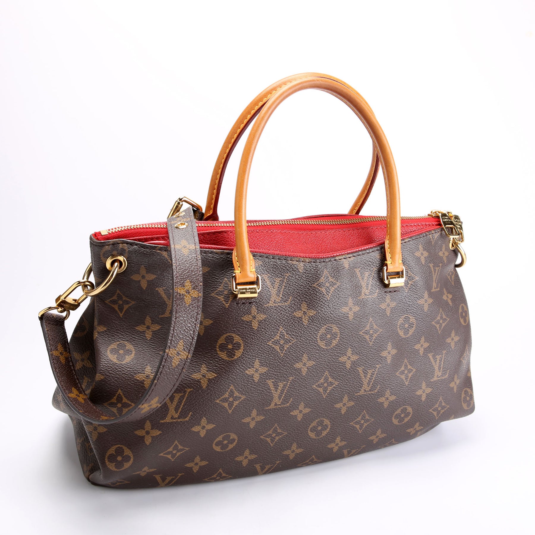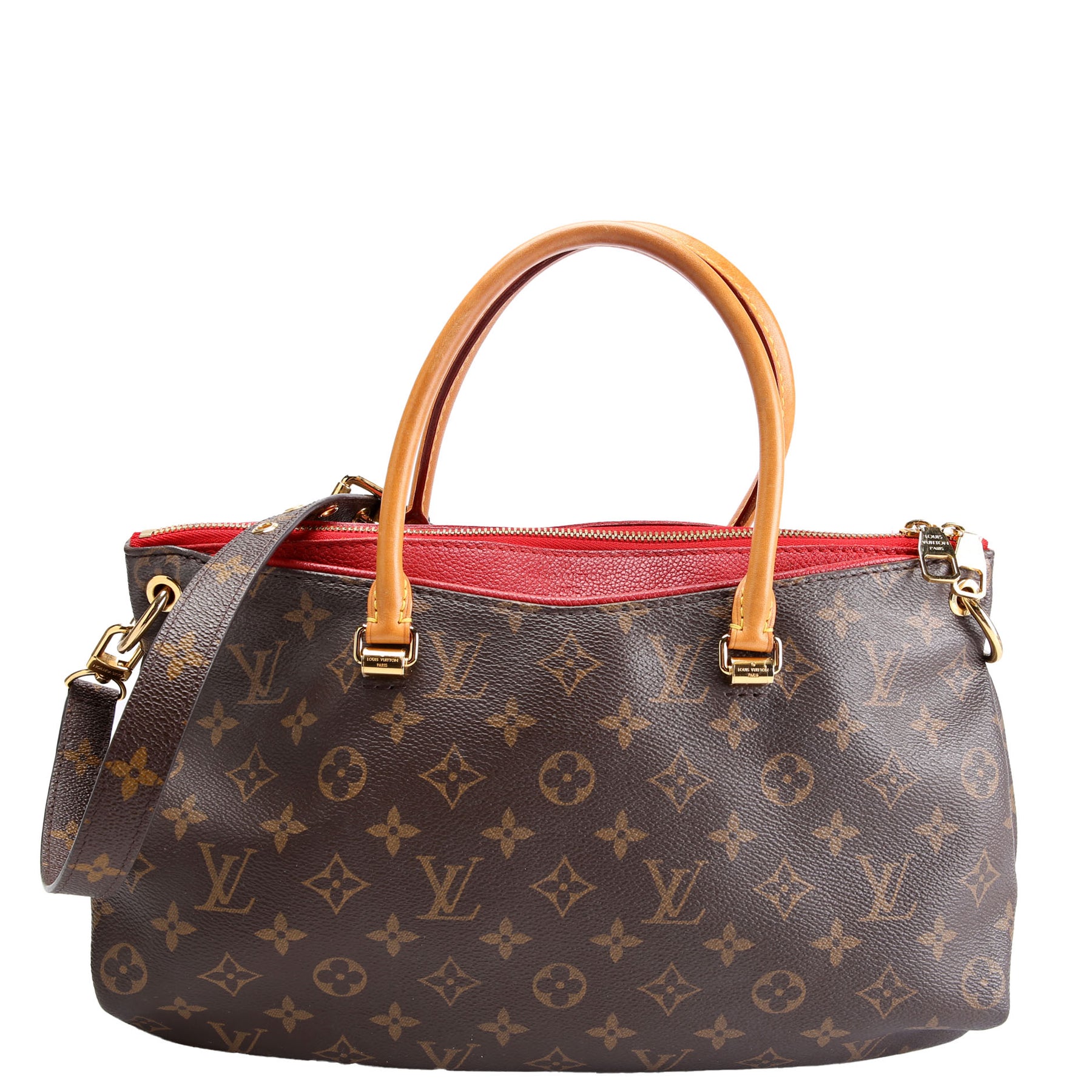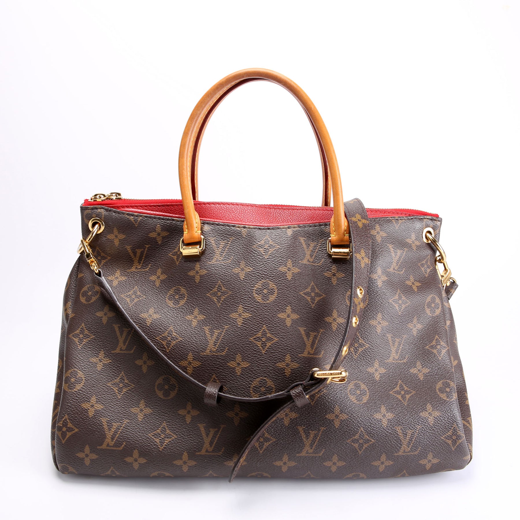 This pre-owned Louis Vuitton Pallas Tote is guaranteed 100% authentic. The exterior is in the classic Louis Vuitton Monogram Coated Canvas