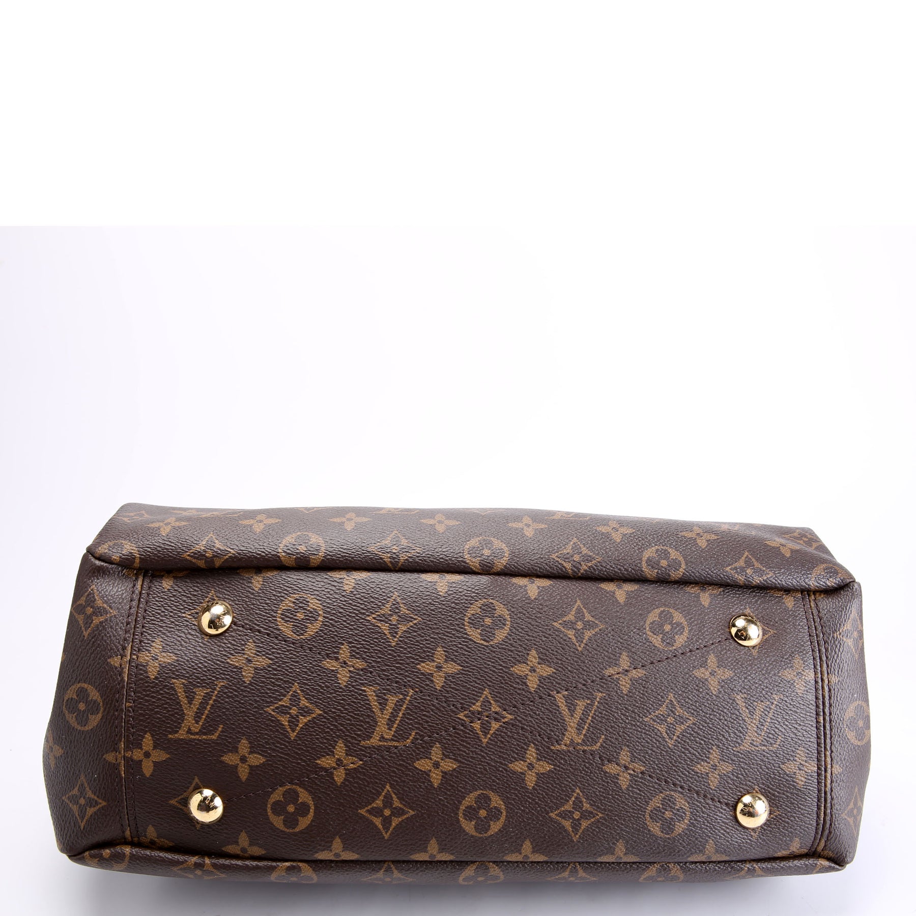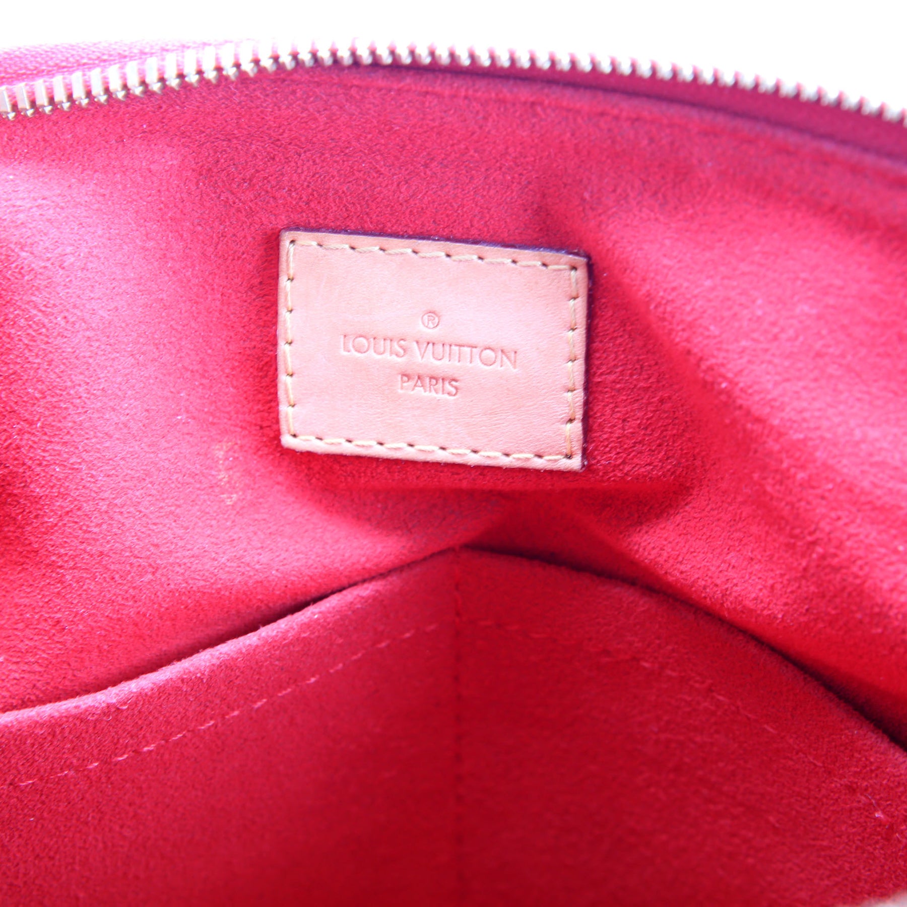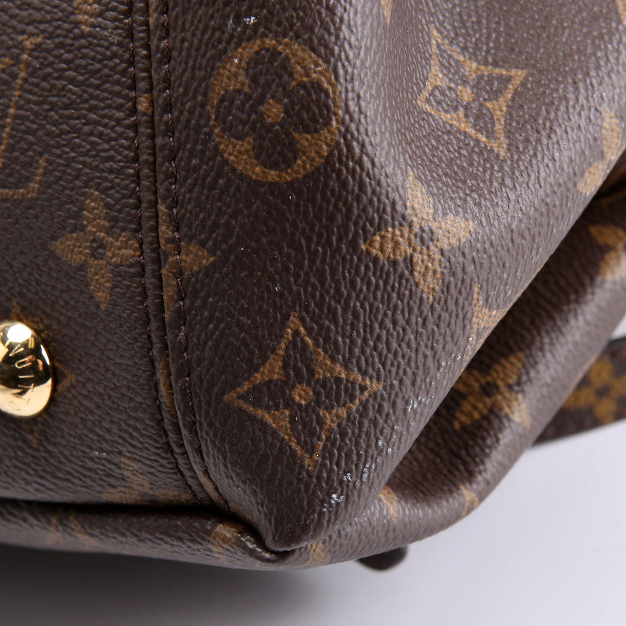This pre-owned Louis Vuitton Pallas Tote is guaranteed 100% authentic. The exterior is in the classic Louis Vuitton Monogram Coated Canvas
