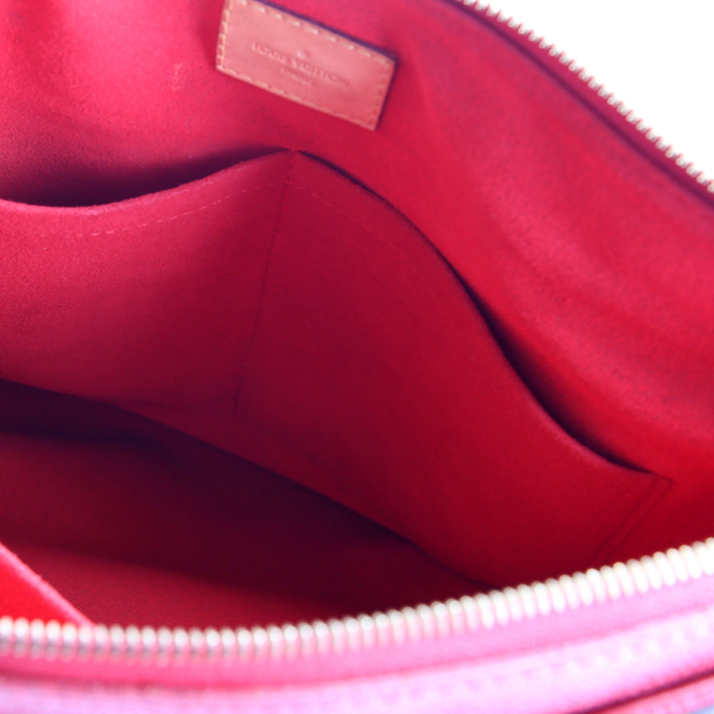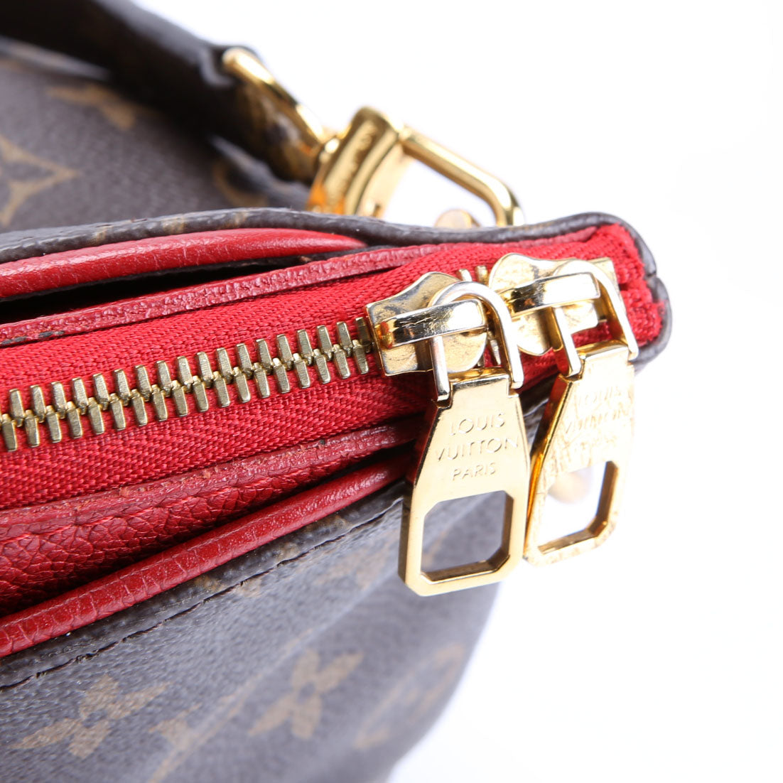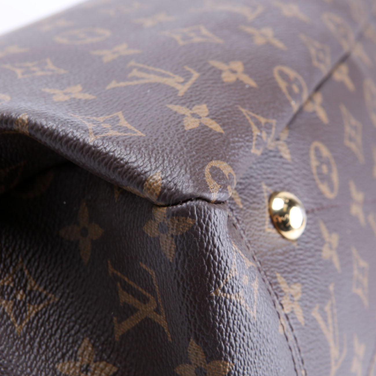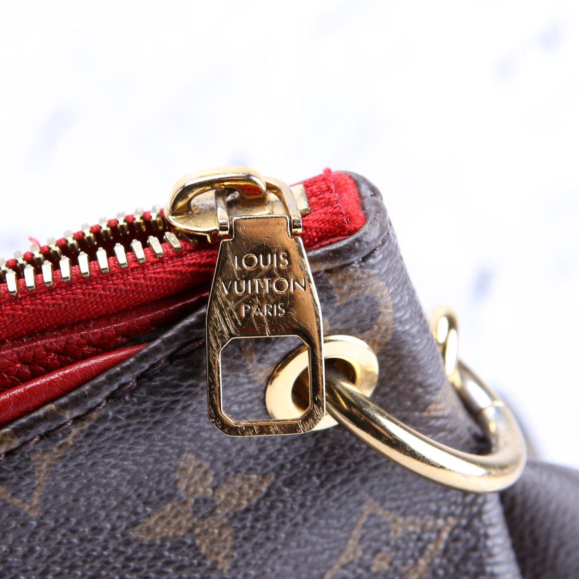 This pre-owned Louis Vuitton Pallas Tote is guaranteed 100% authentic. The exterior is in the classic Louis Vuitton Monogram Coated Canvas