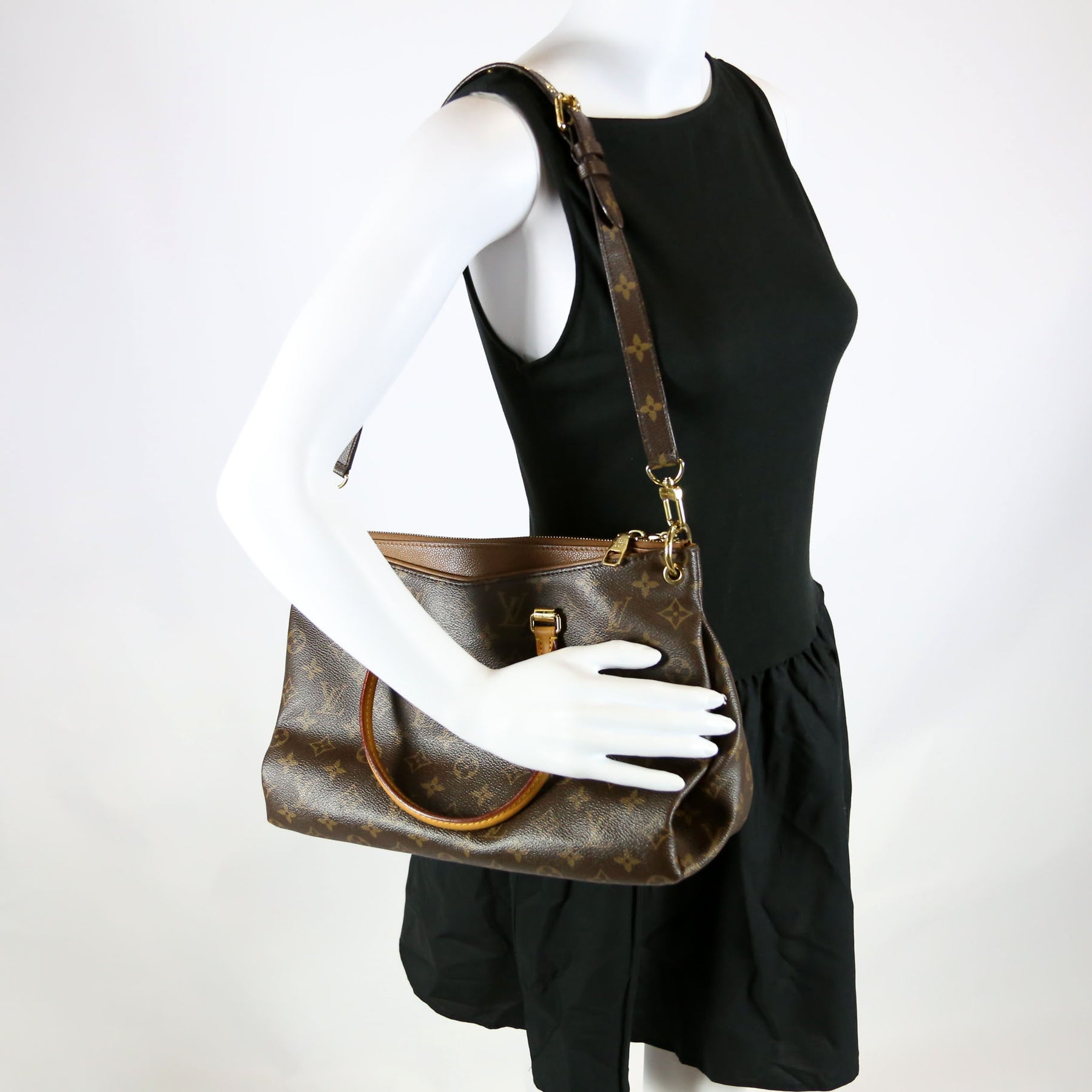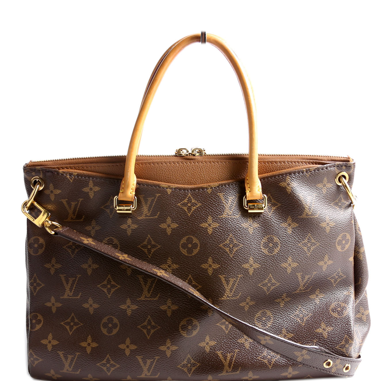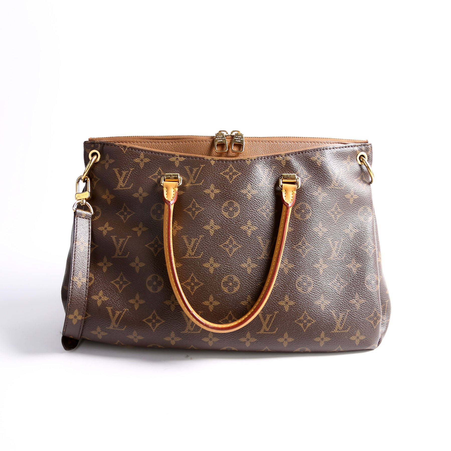This pre-owned Louis Vuitton Pallas Tote is guaranteed 100% authentic. The exterior is in the classic Louis Vuitton Monogram coated canvas..
