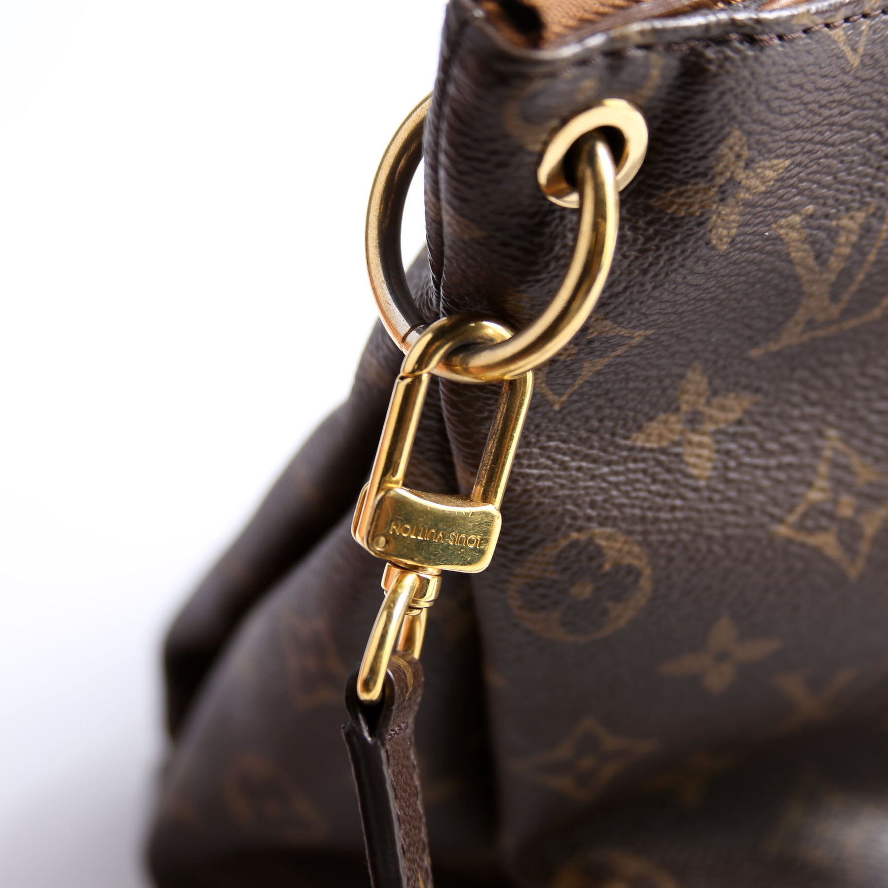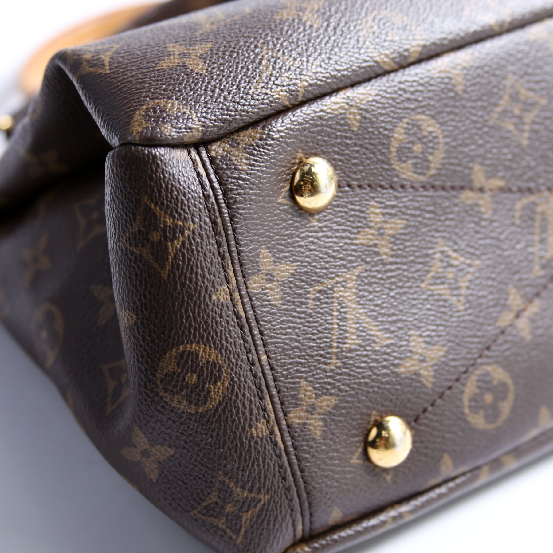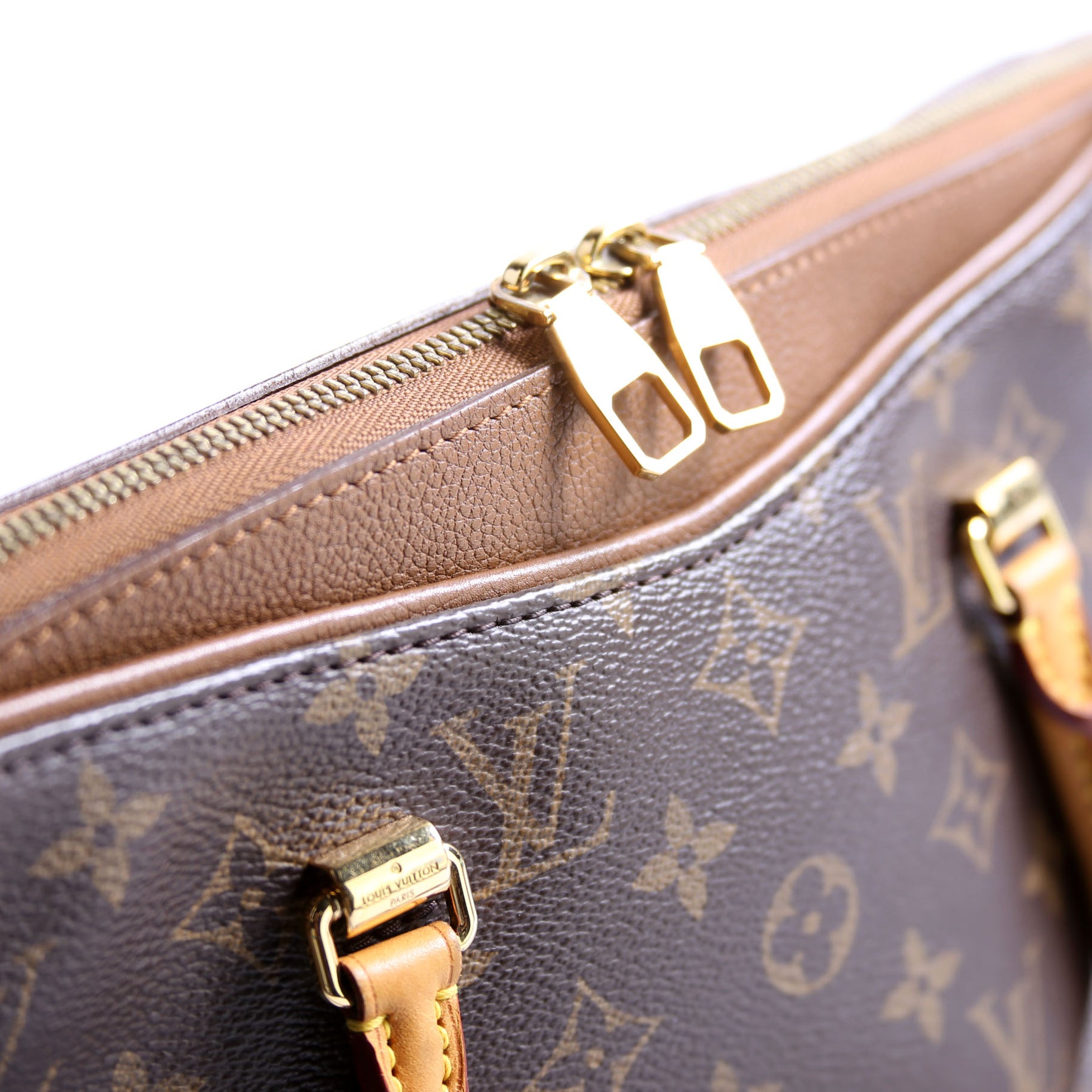 This pre-owned Louis Vuitton Pallas Tote is guaranteed 100% authentic. The exterior is in the classic Louis Vuitton Monogram coated canvas..