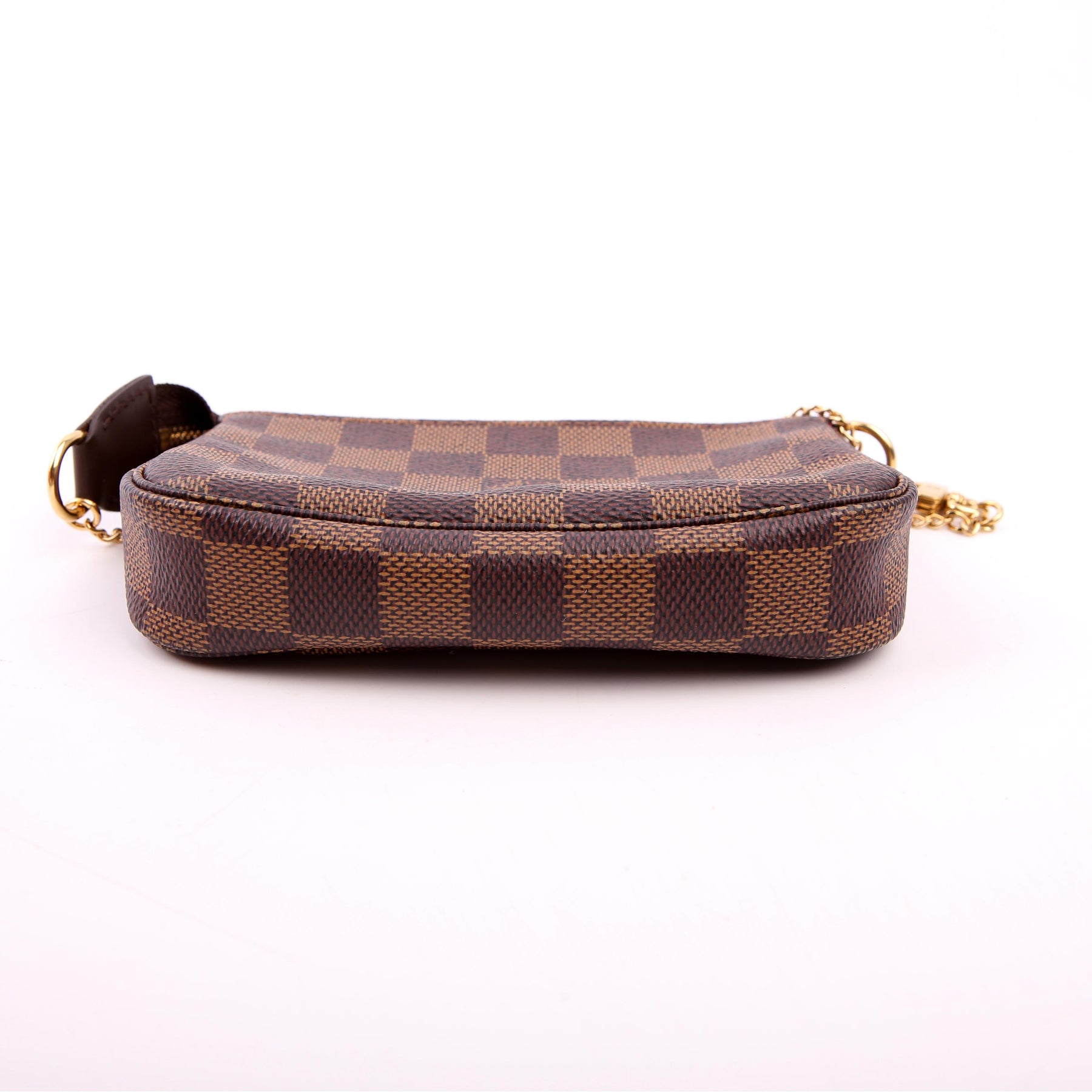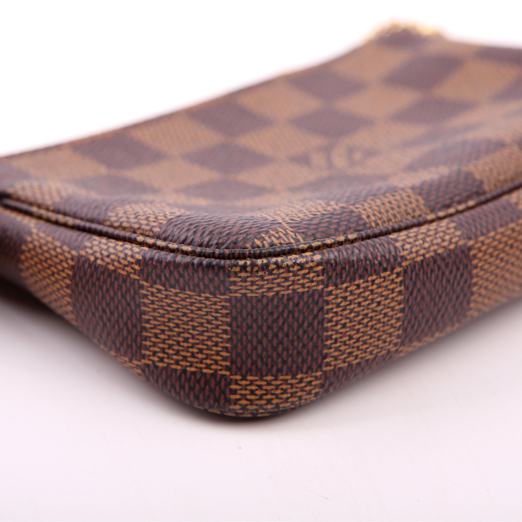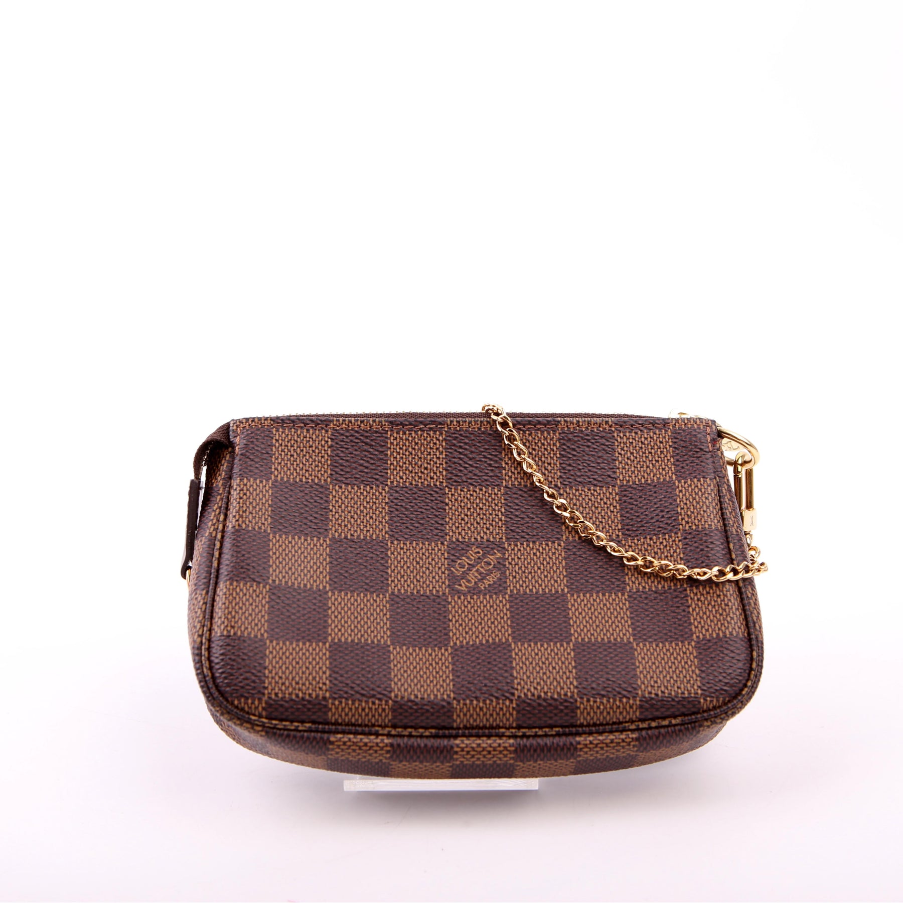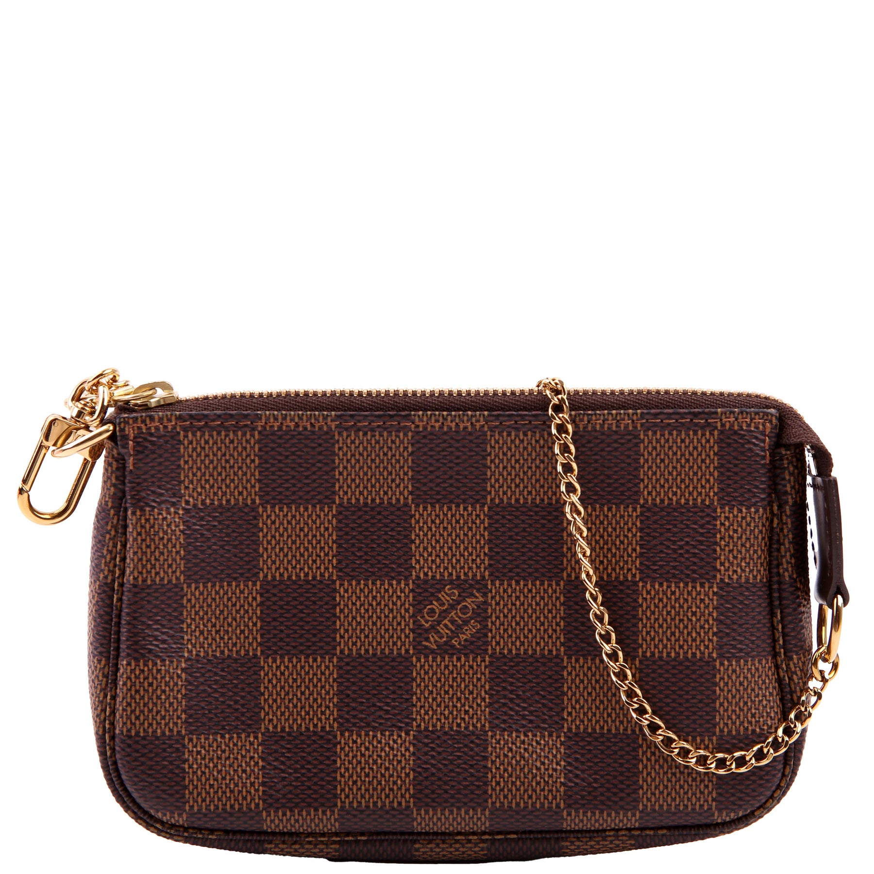 This pre-owned Louis Vuitton Pochette Accessories Mini is guaranteed 100% authentic. The exterior is in the classic Louis Vuitton Damier Ebene coated canvas.