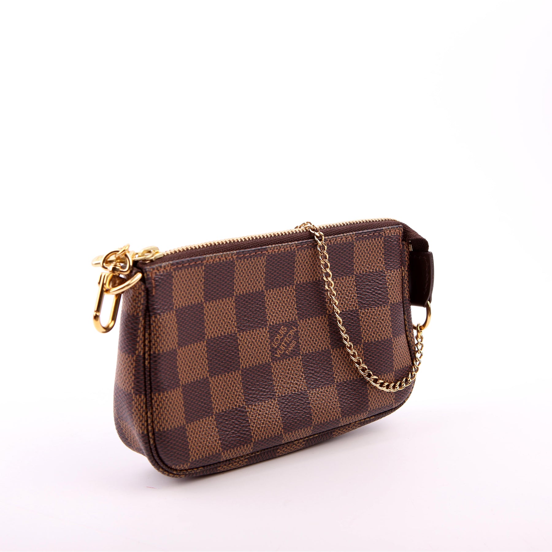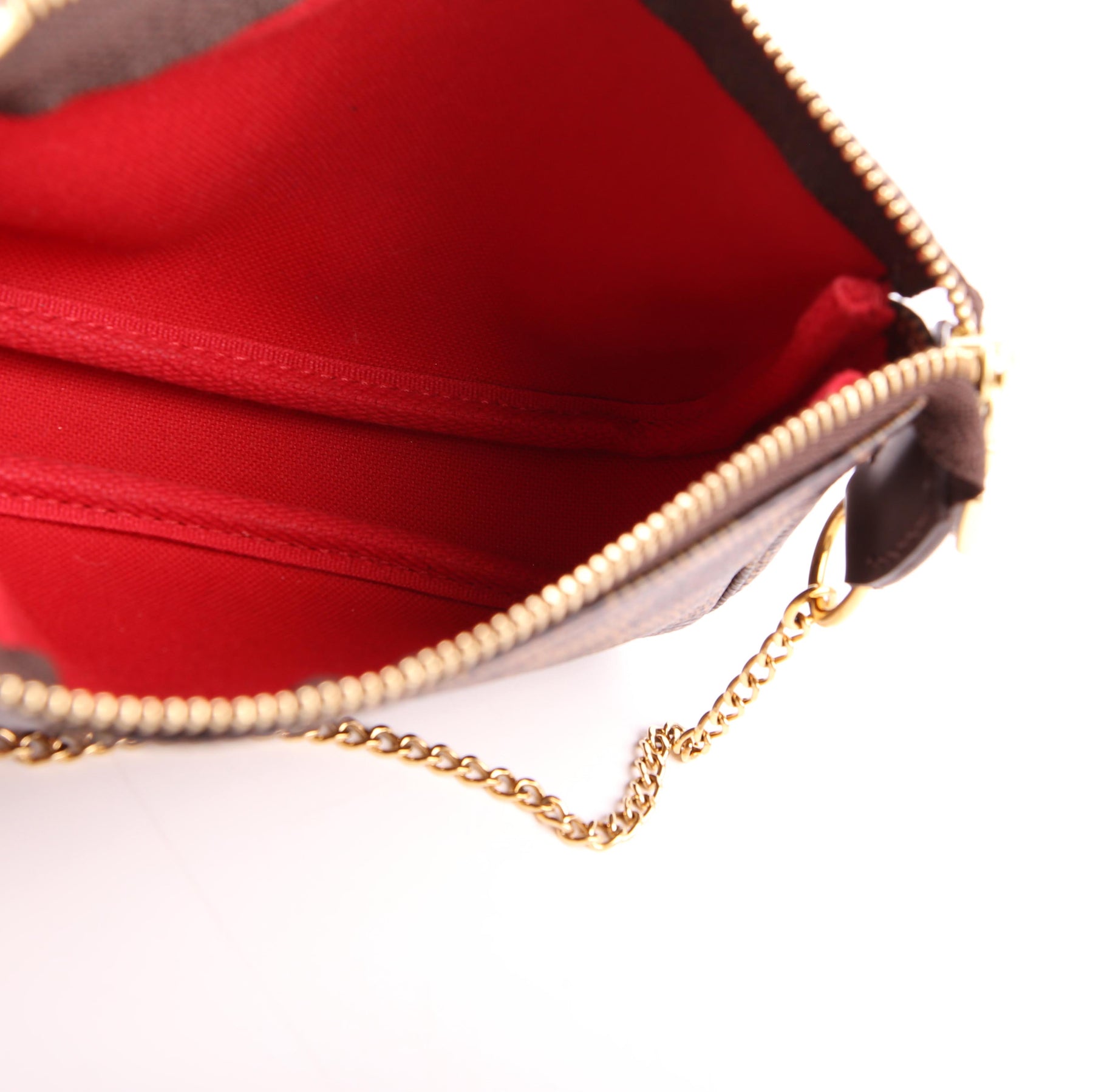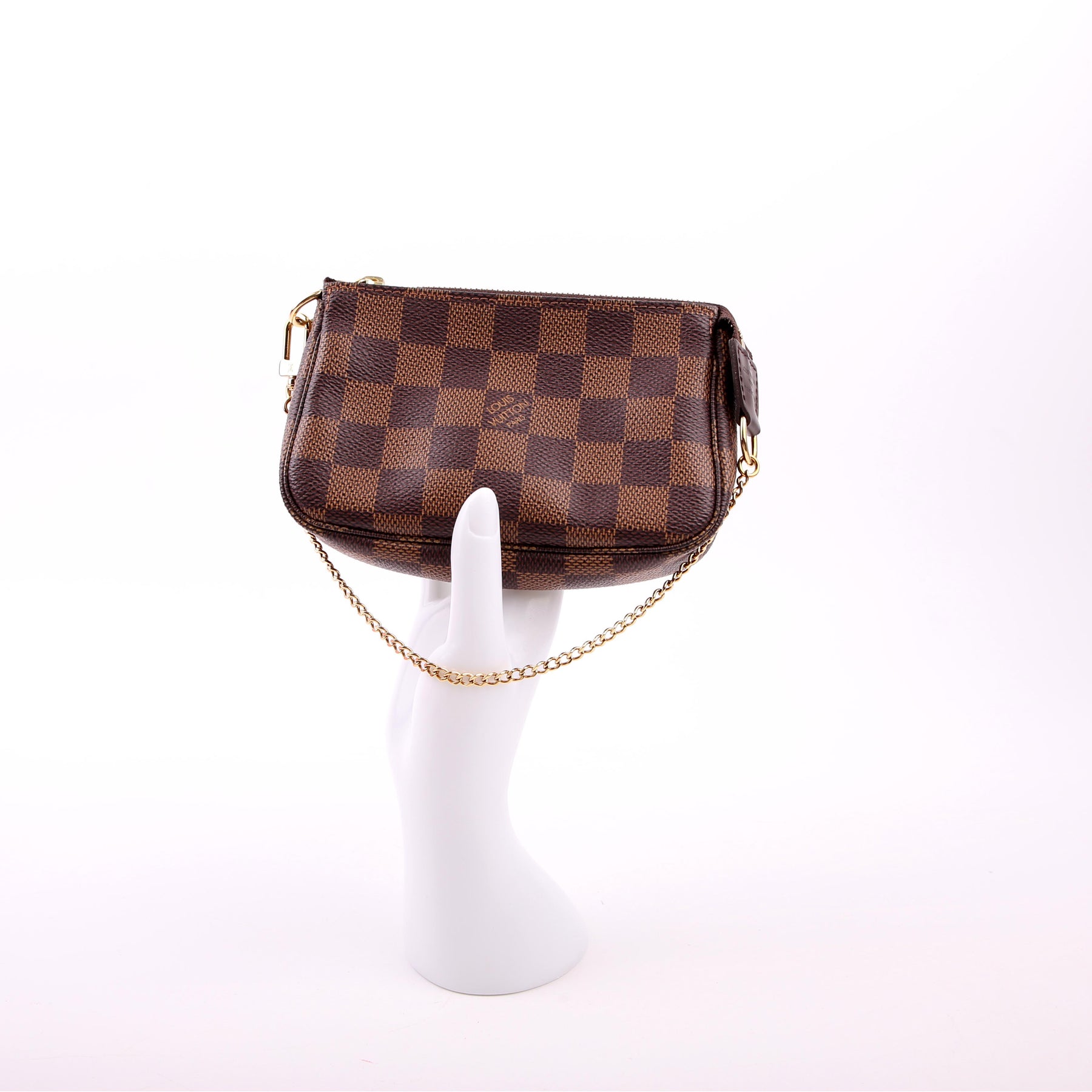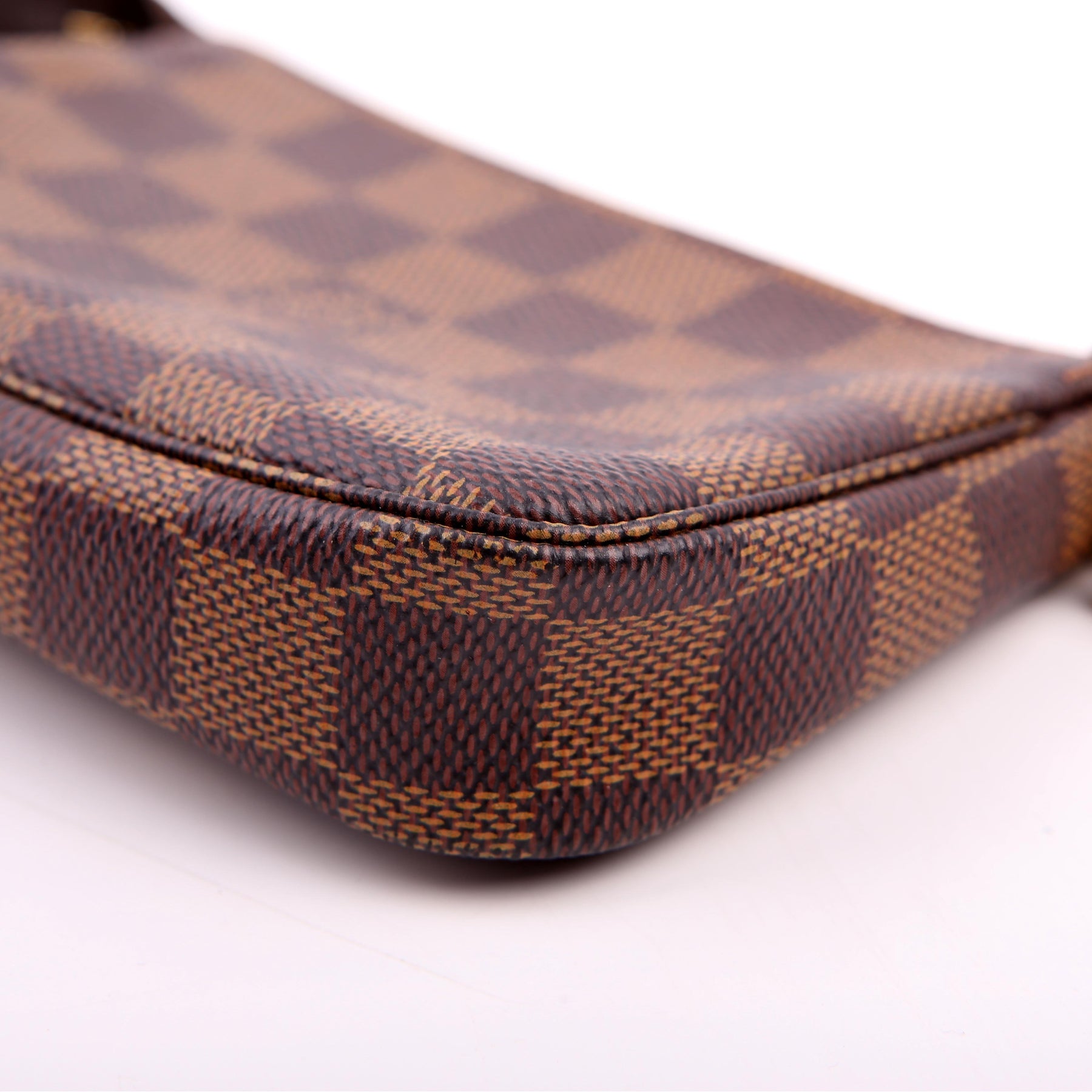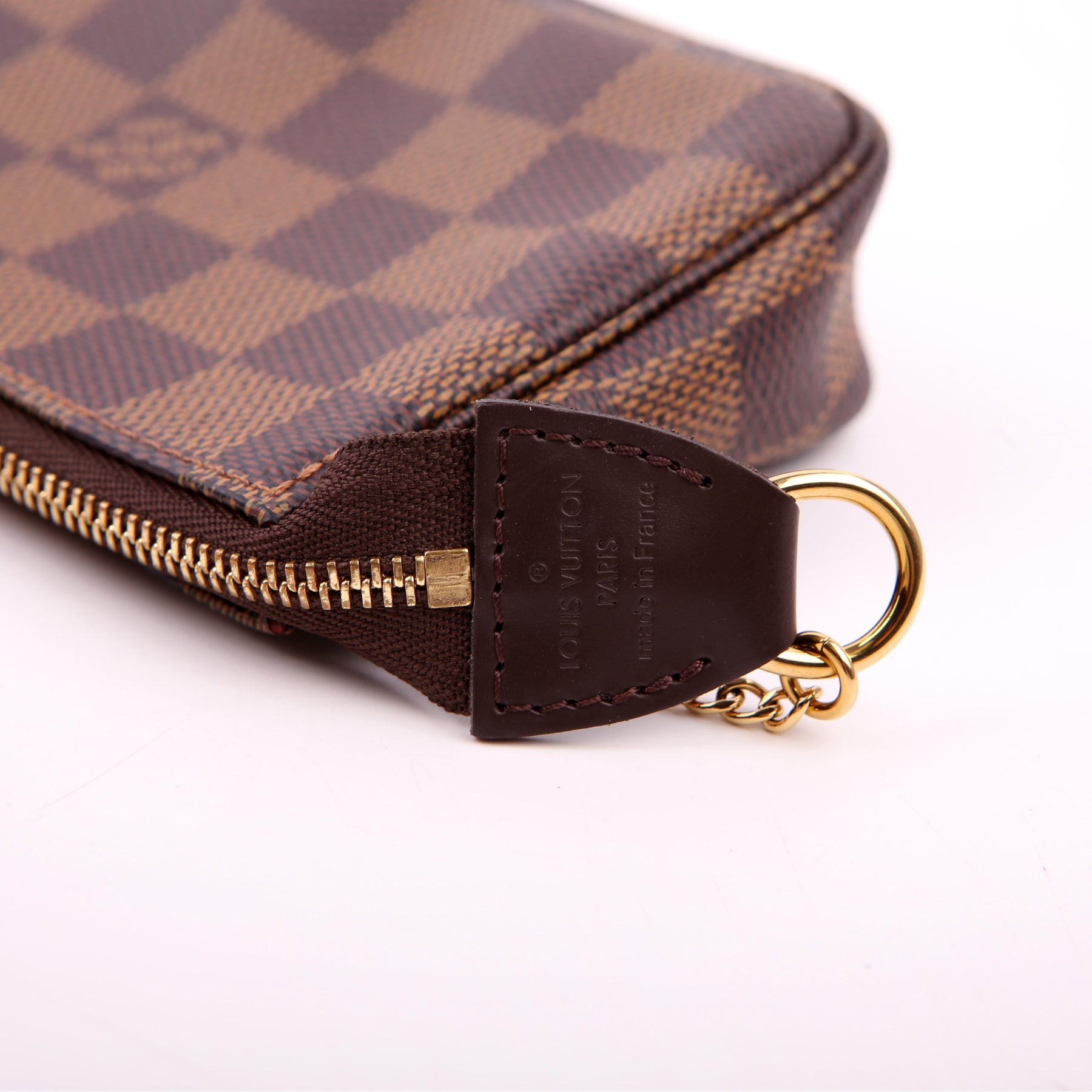 This pre-owned Louis Vuitton Pochette Accessories Mini is guaranteed 100% authentic. The exterior is in the classic Louis Vuitton Damier Ebene coated canvas.