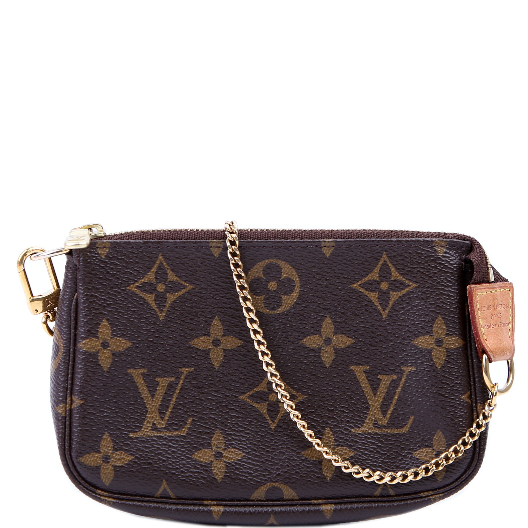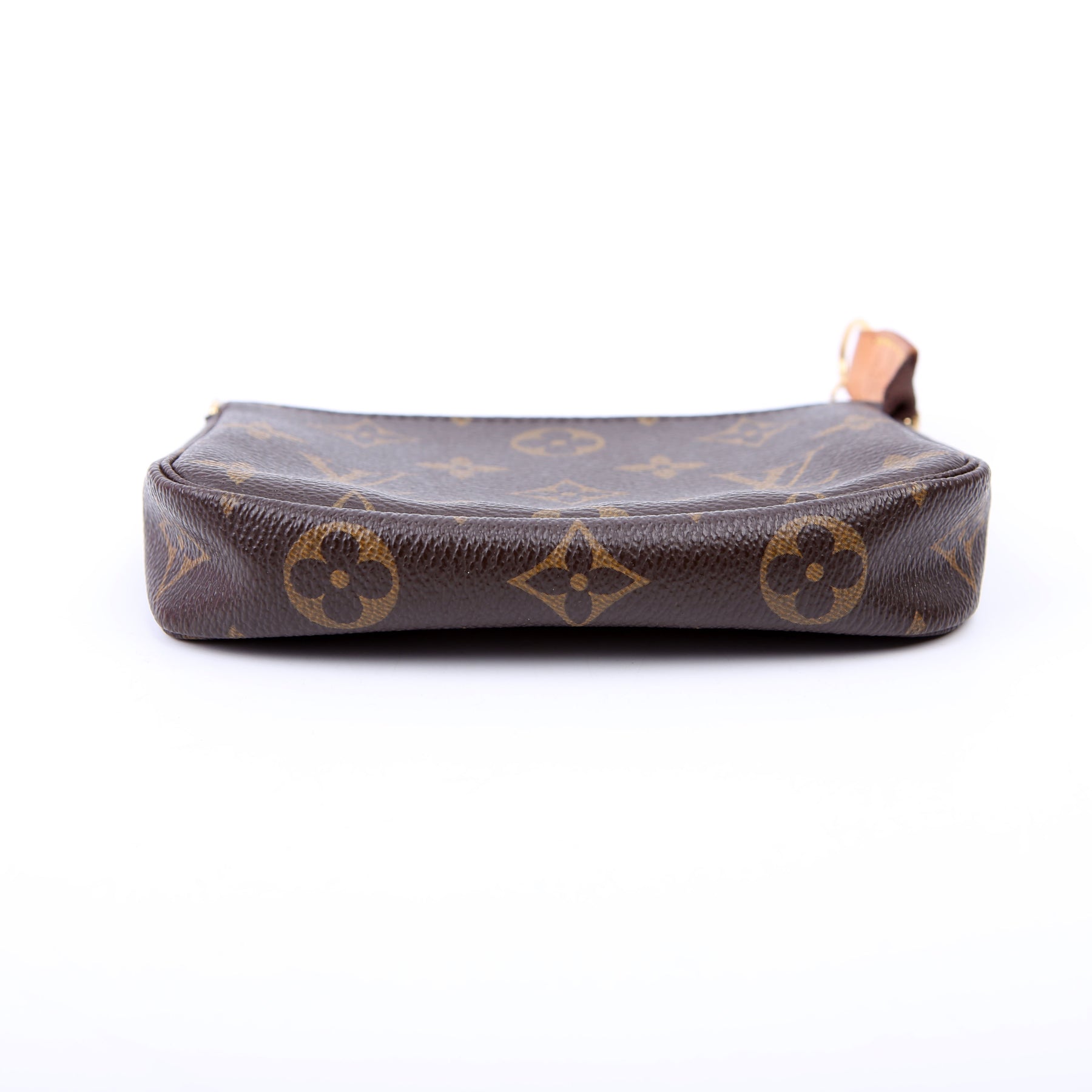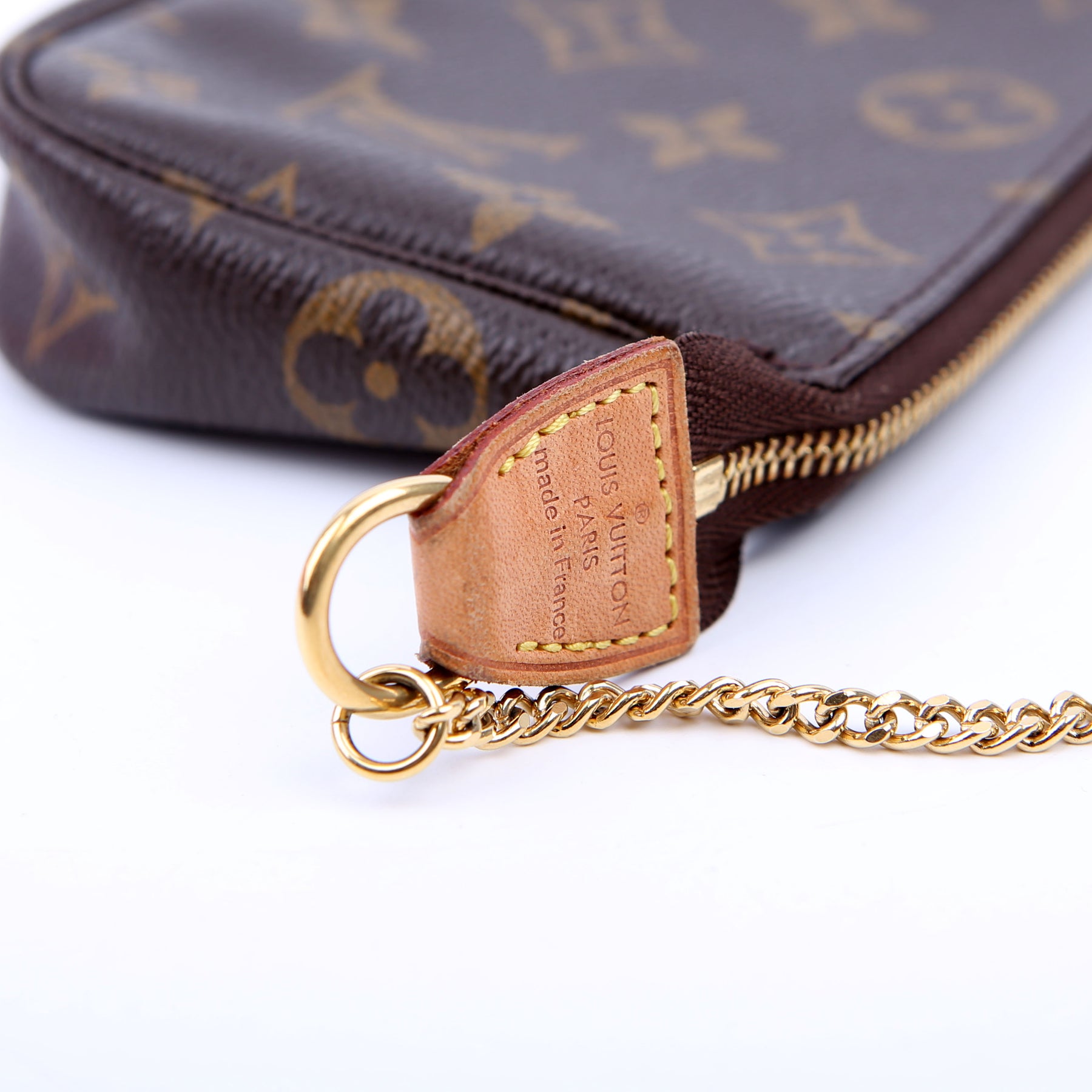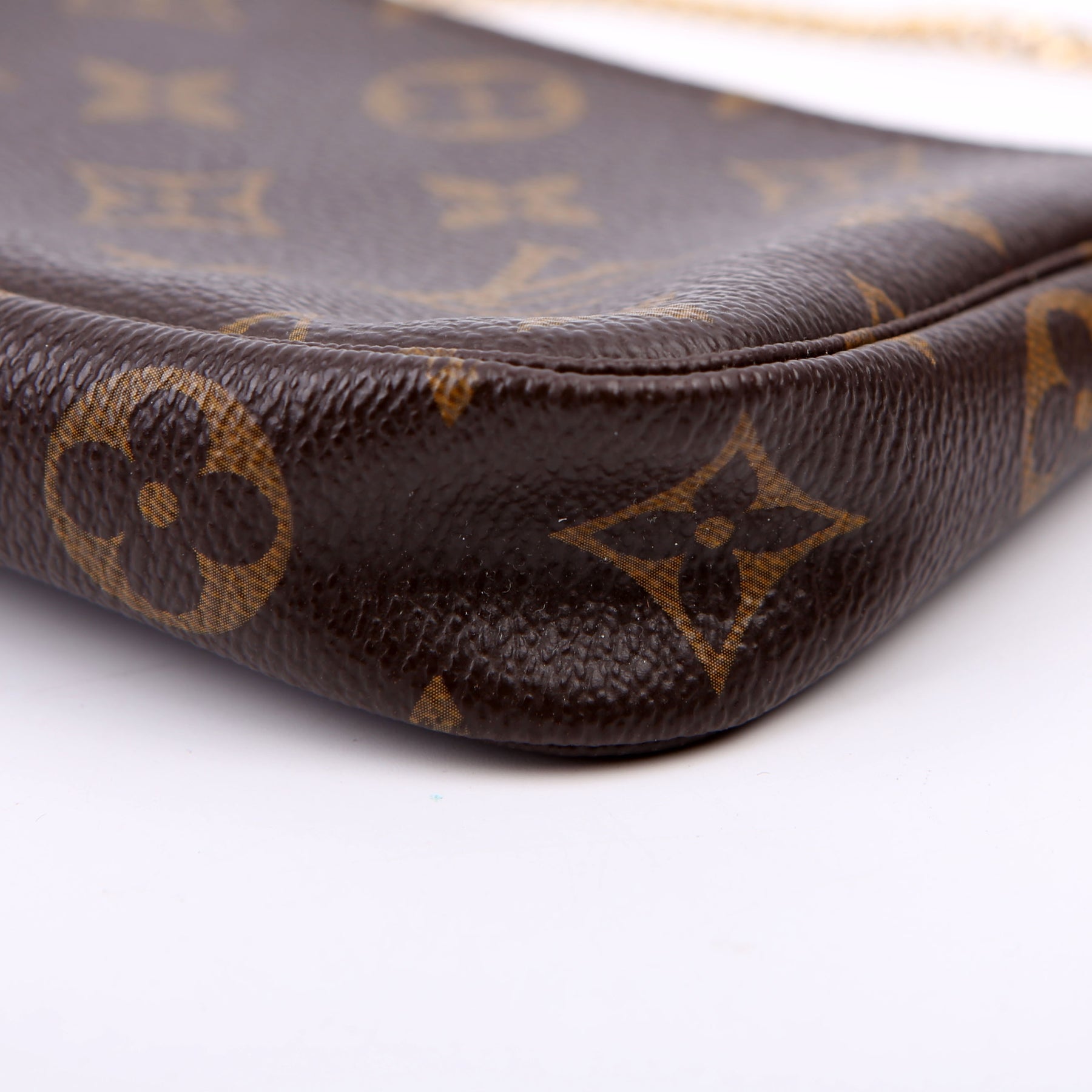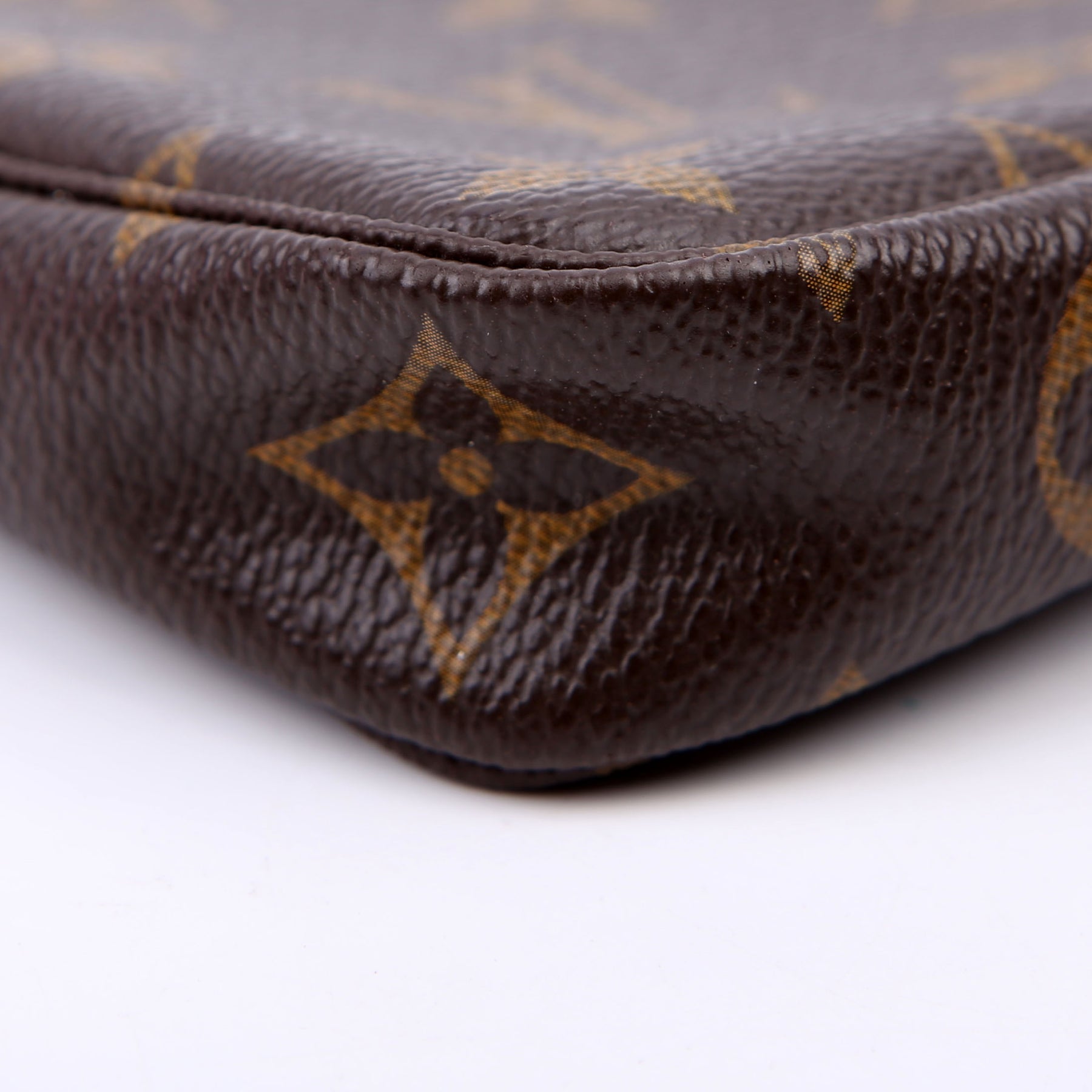This pre-owned Louis Vuitton Pochette Accessories Mini is guaranteed 100% authentic. The exterior is in the classic Louis Vuitton Monogram coated canvas.