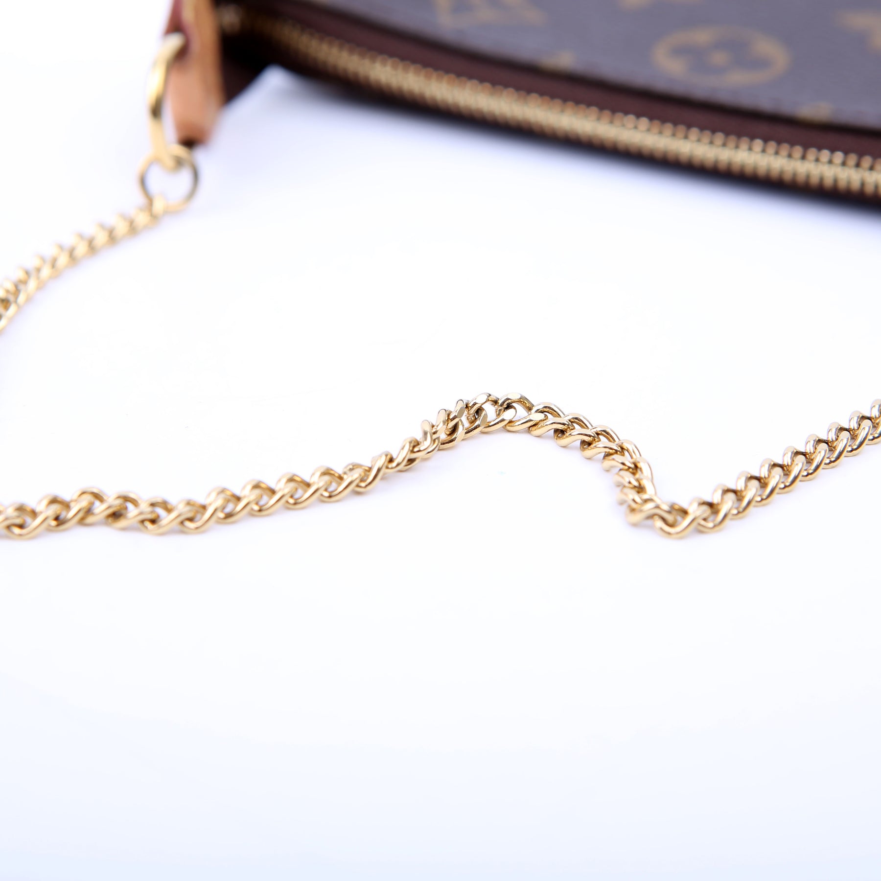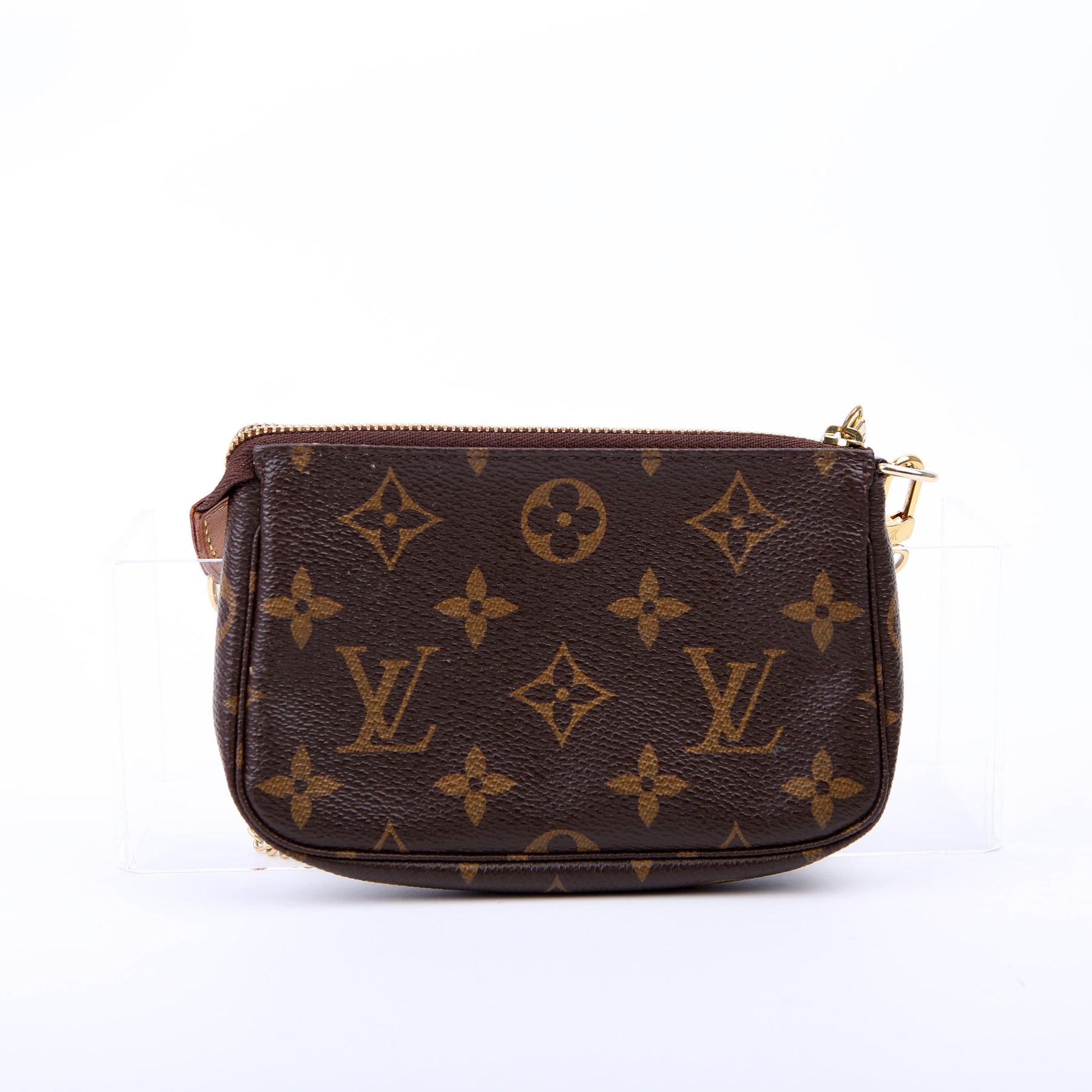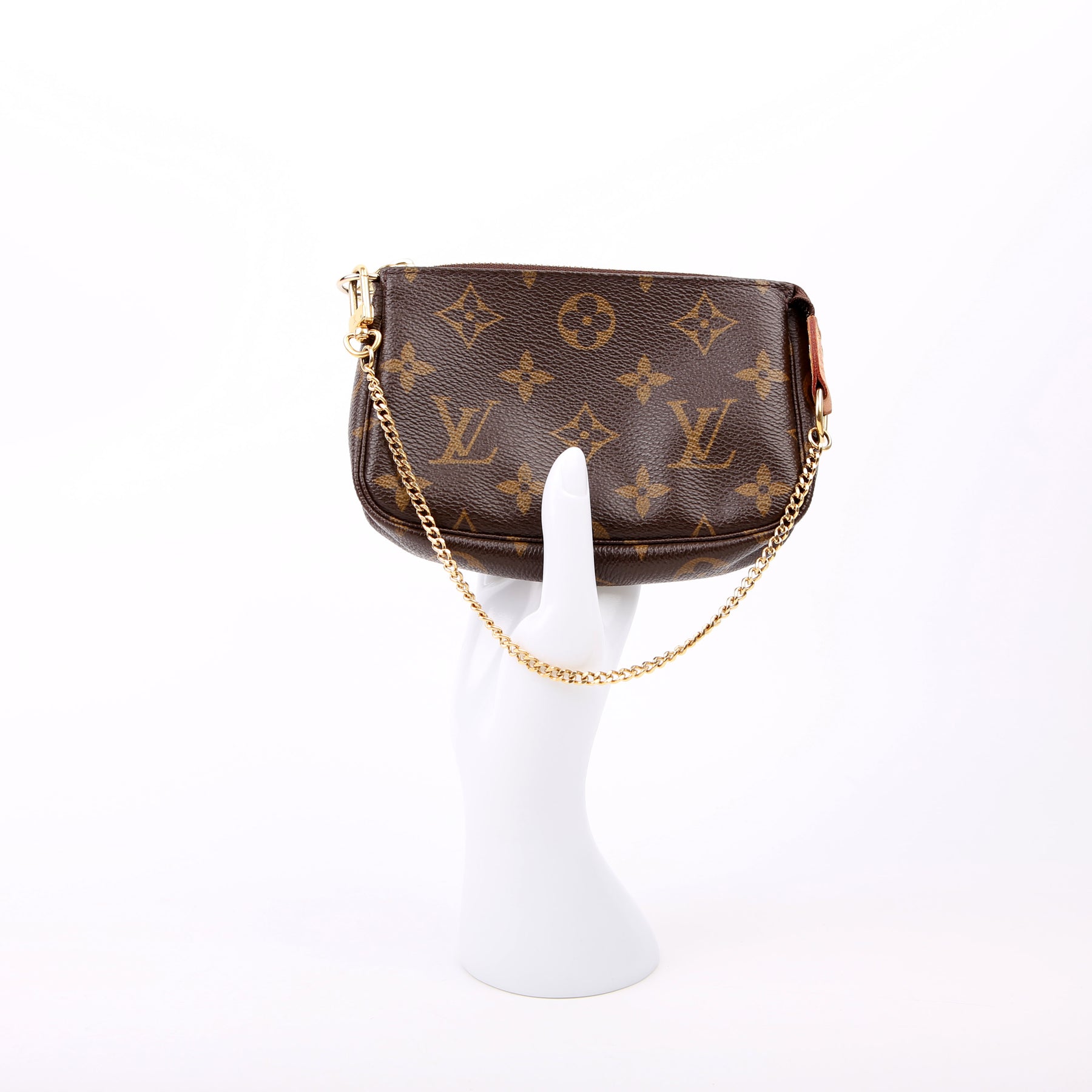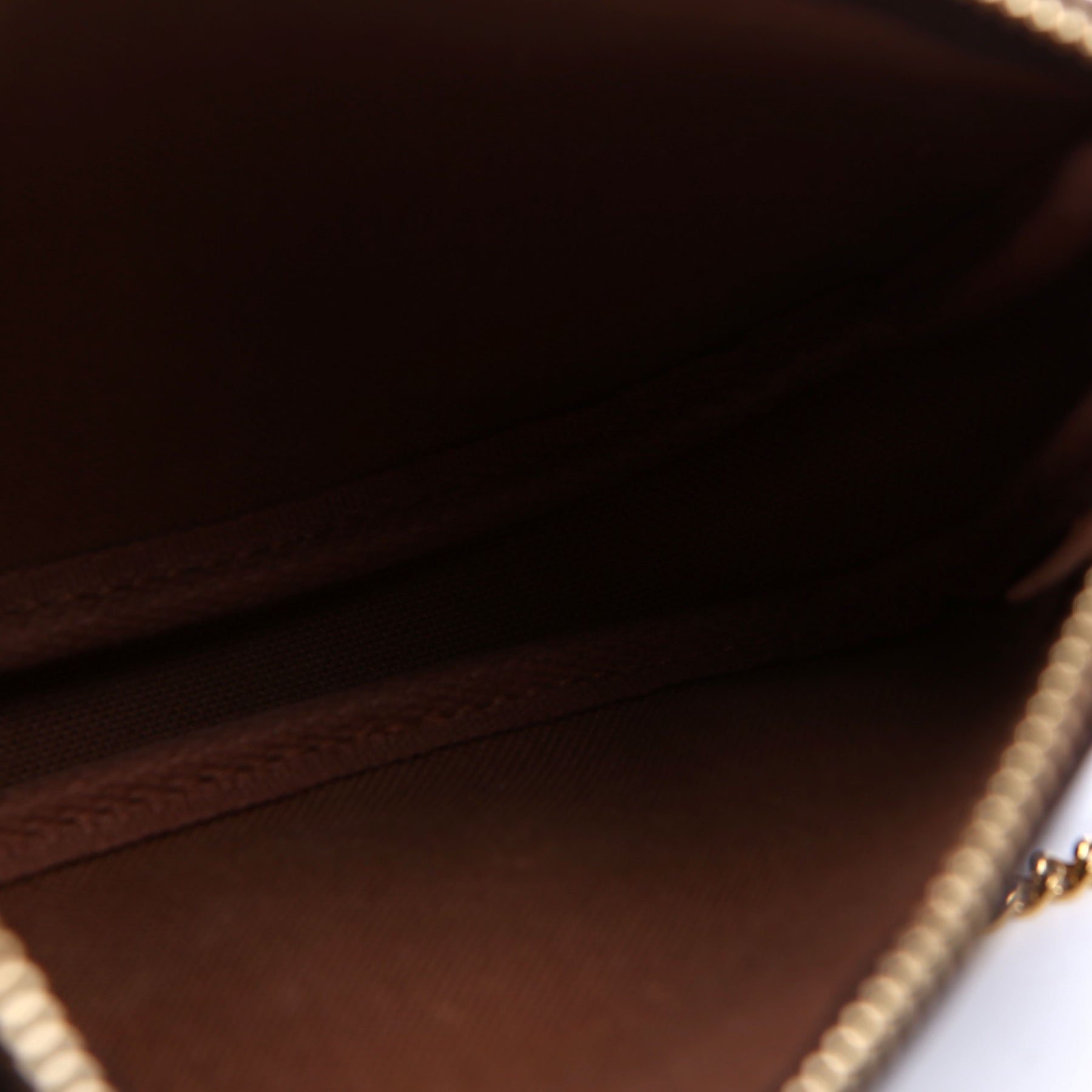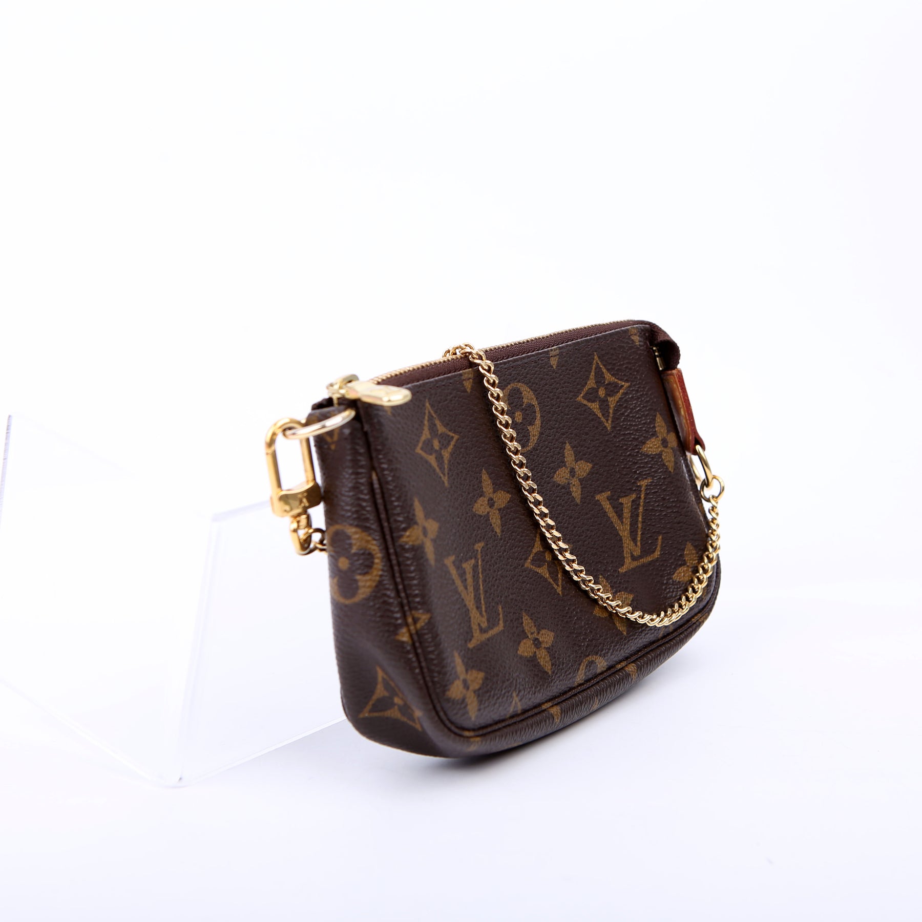 This pre-owned Louis Vuitton Pochette Accessories Mini is guaranteed 100% authentic. The exterior is in the classic Louis Vuitton Monogram coated canvas.