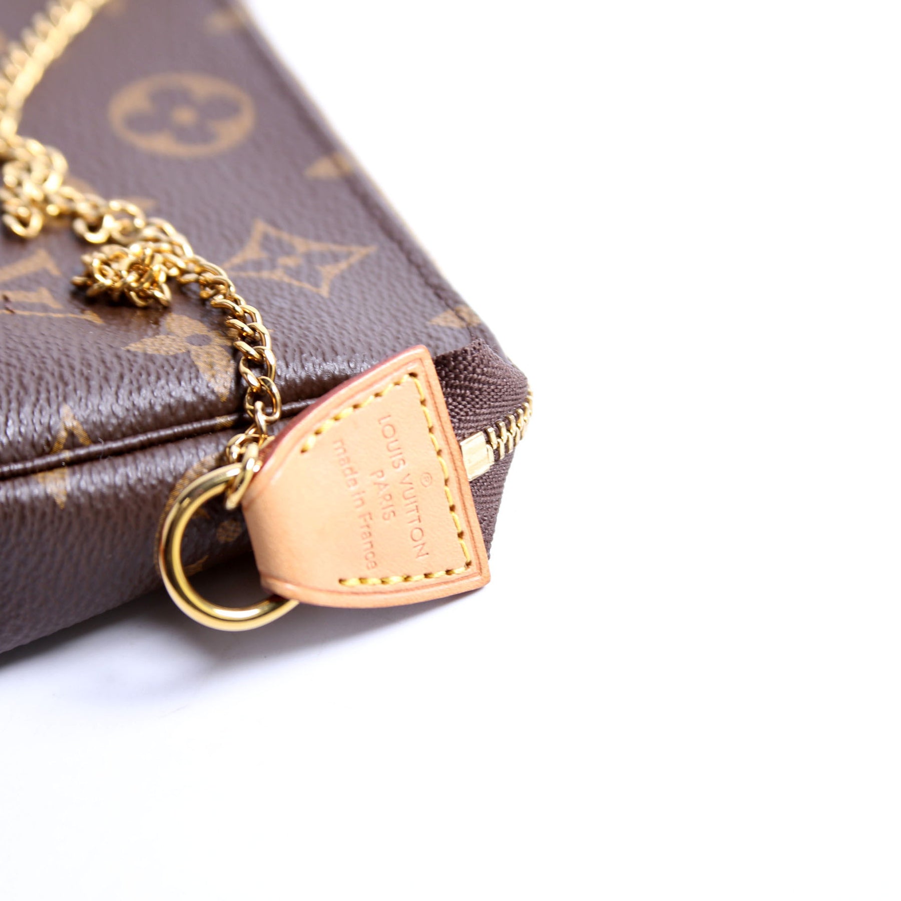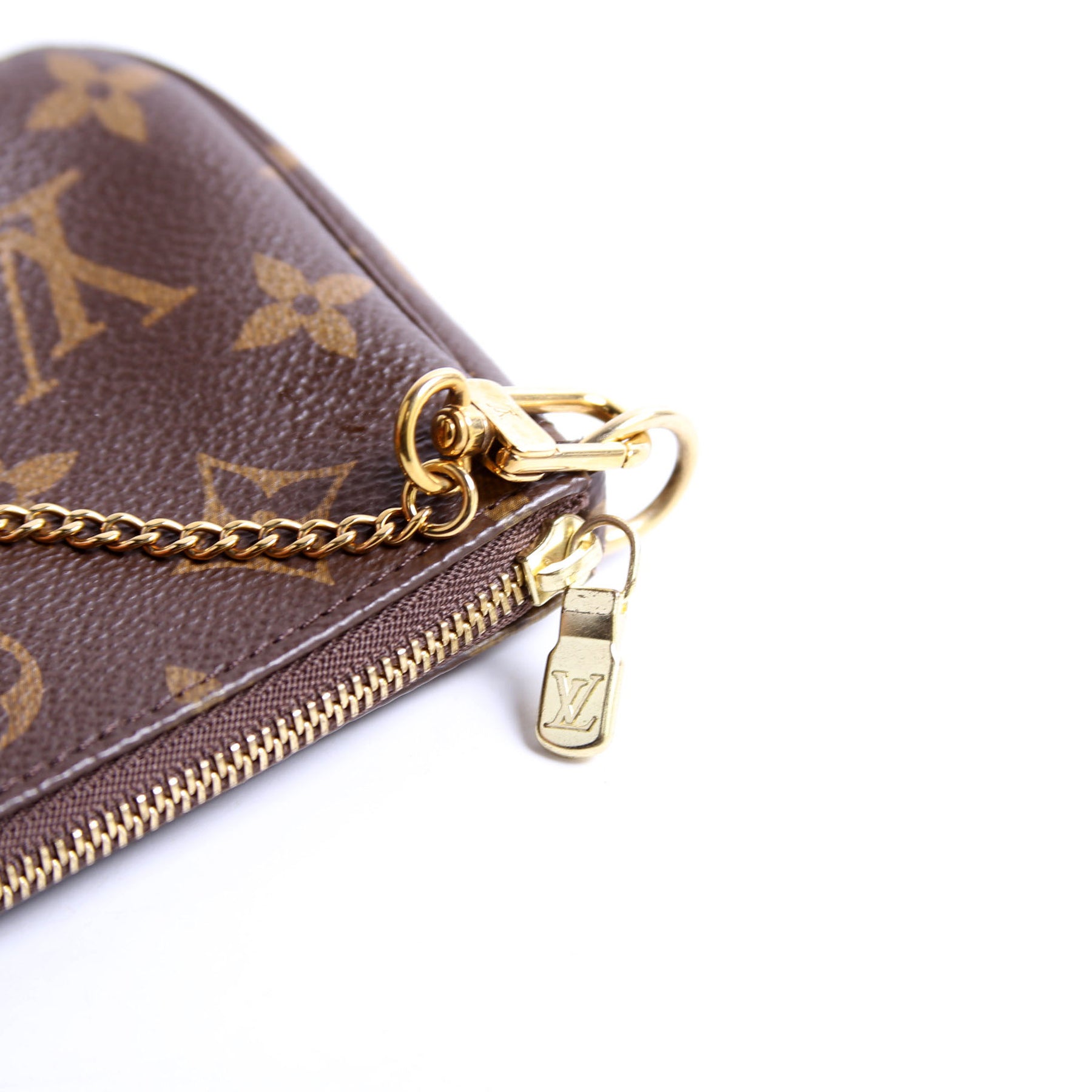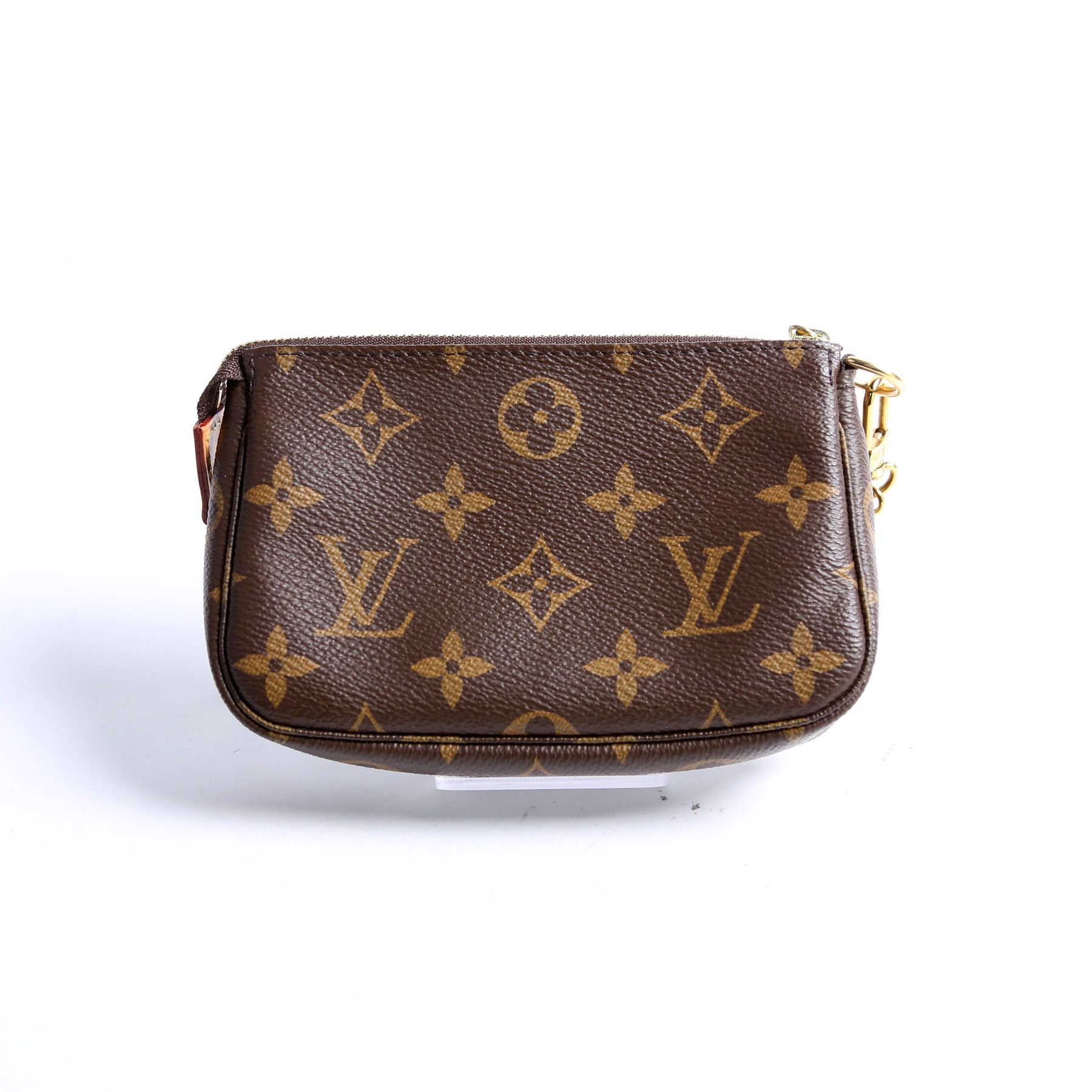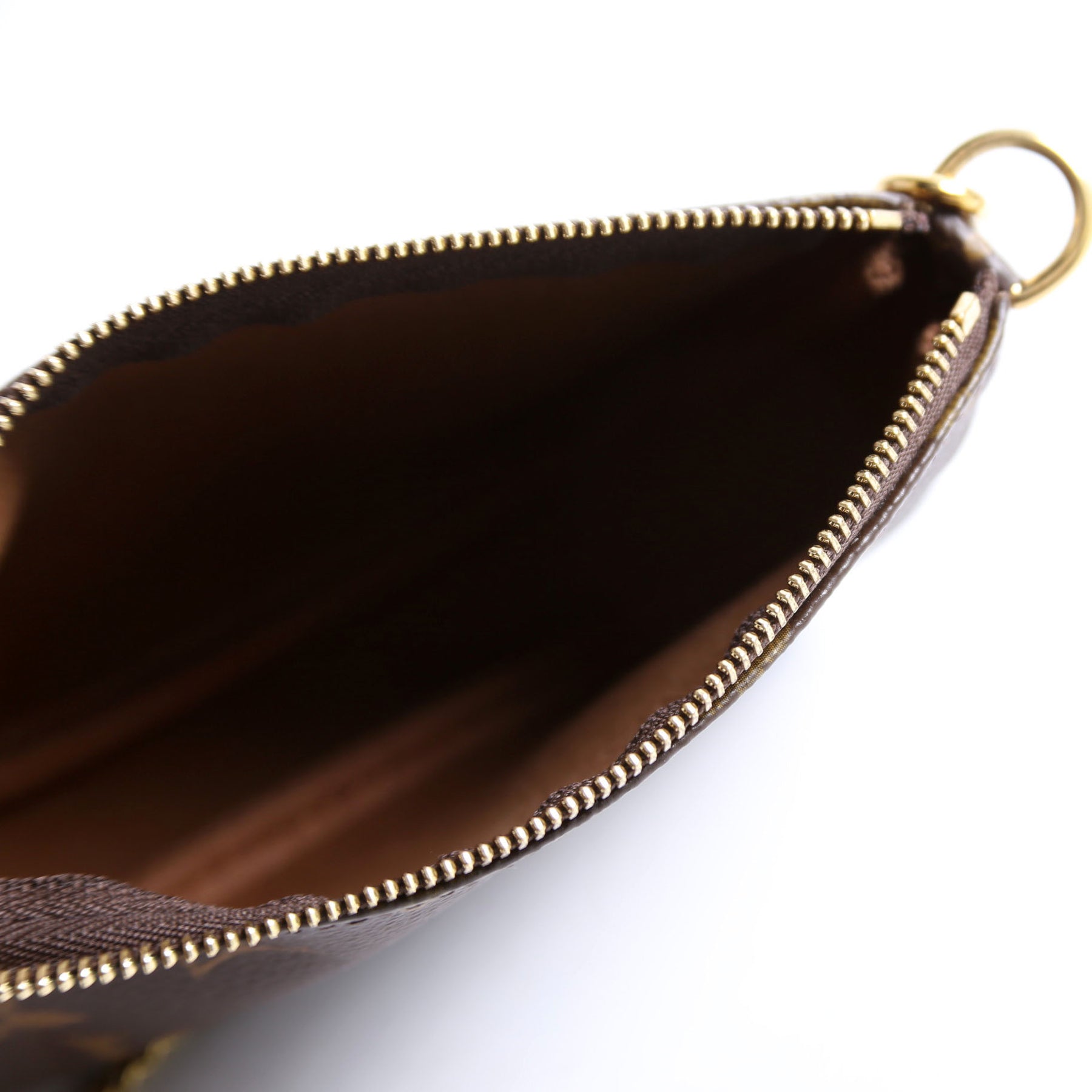 This pre-owned Louis Vuitton Pochette Accessories Mini is guaranteed 100% authentic. The exterior is in the classic Louis Vuitton Monogram coated canvas.