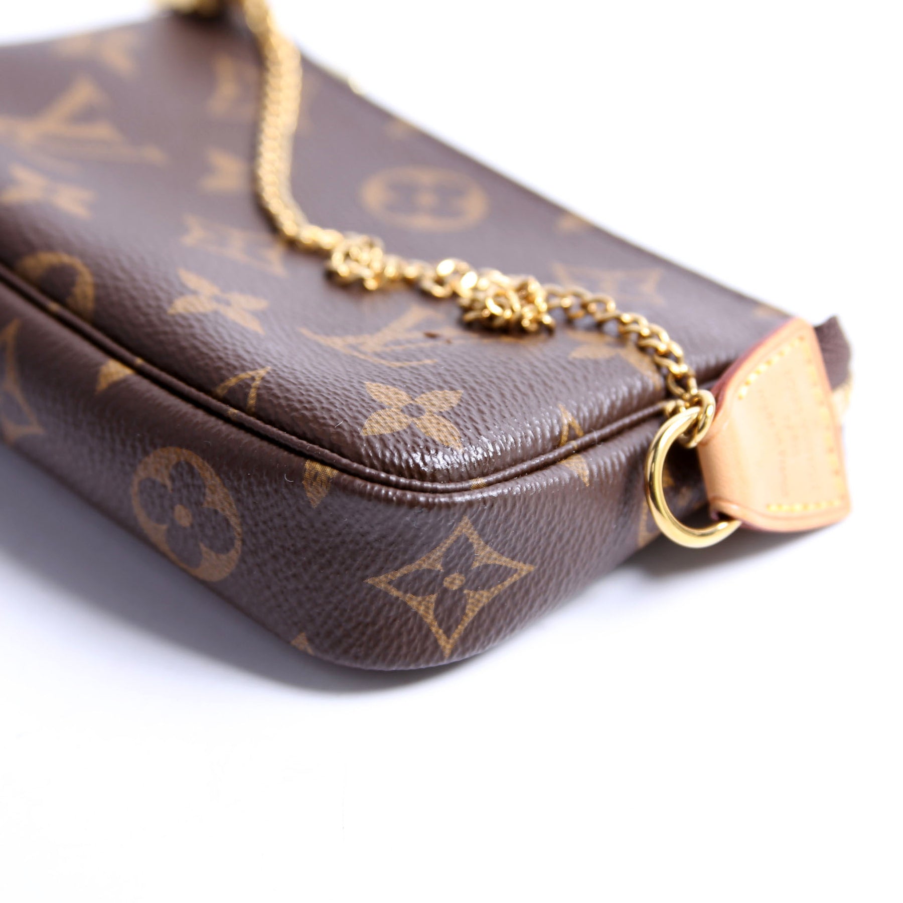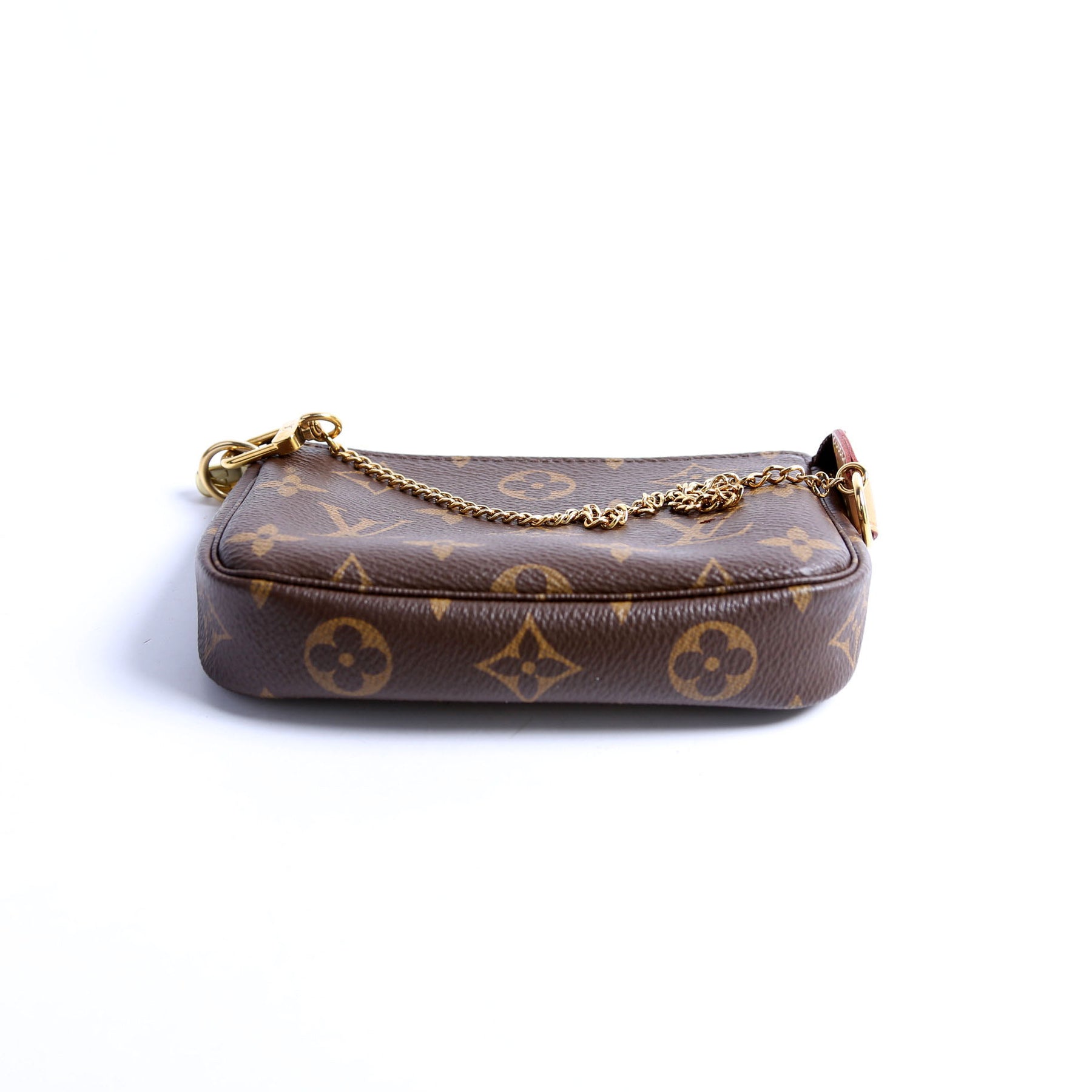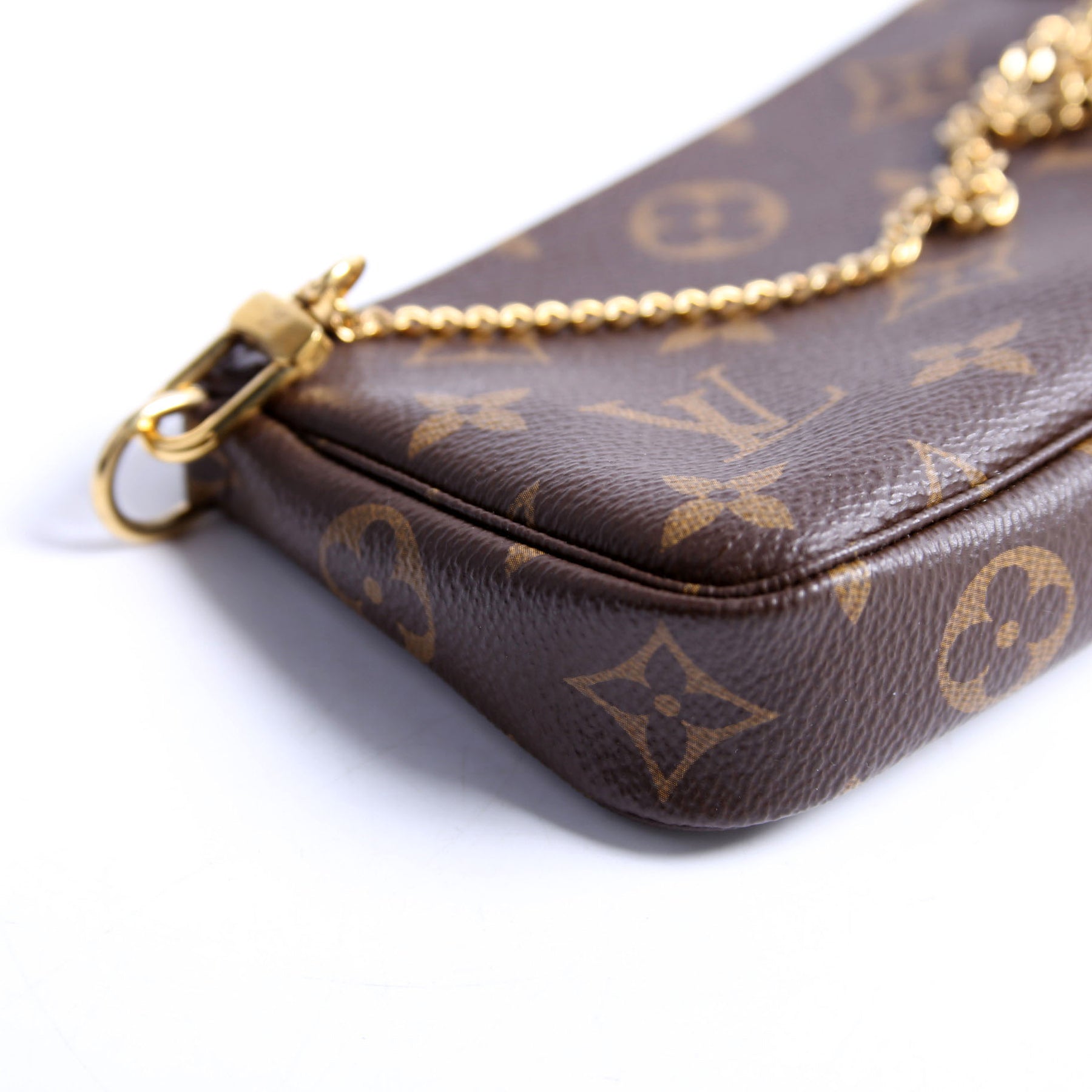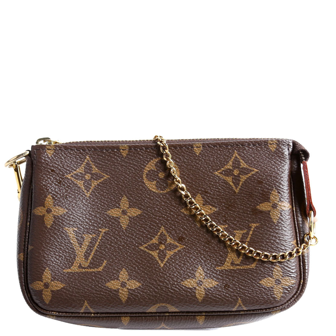 This pre-owned Louis Vuitton Pochette Accessories Mini is guaranteed 100% authentic. The exterior is in the classic Louis Vuitton Monogram coated canvas.