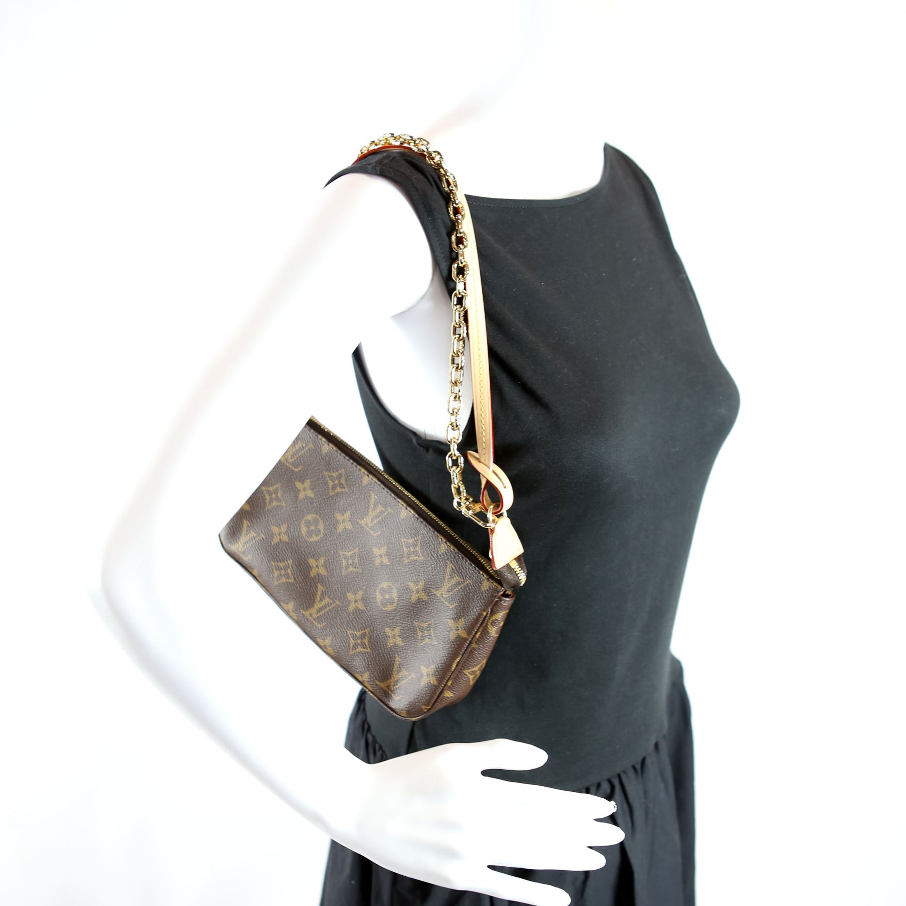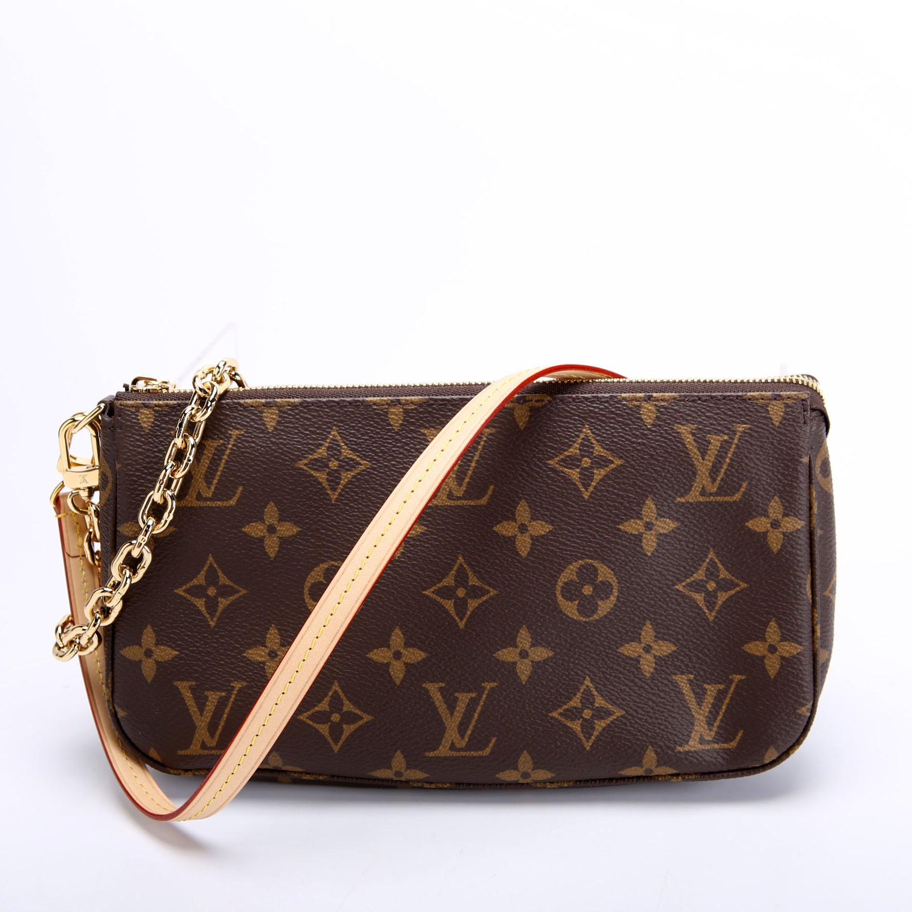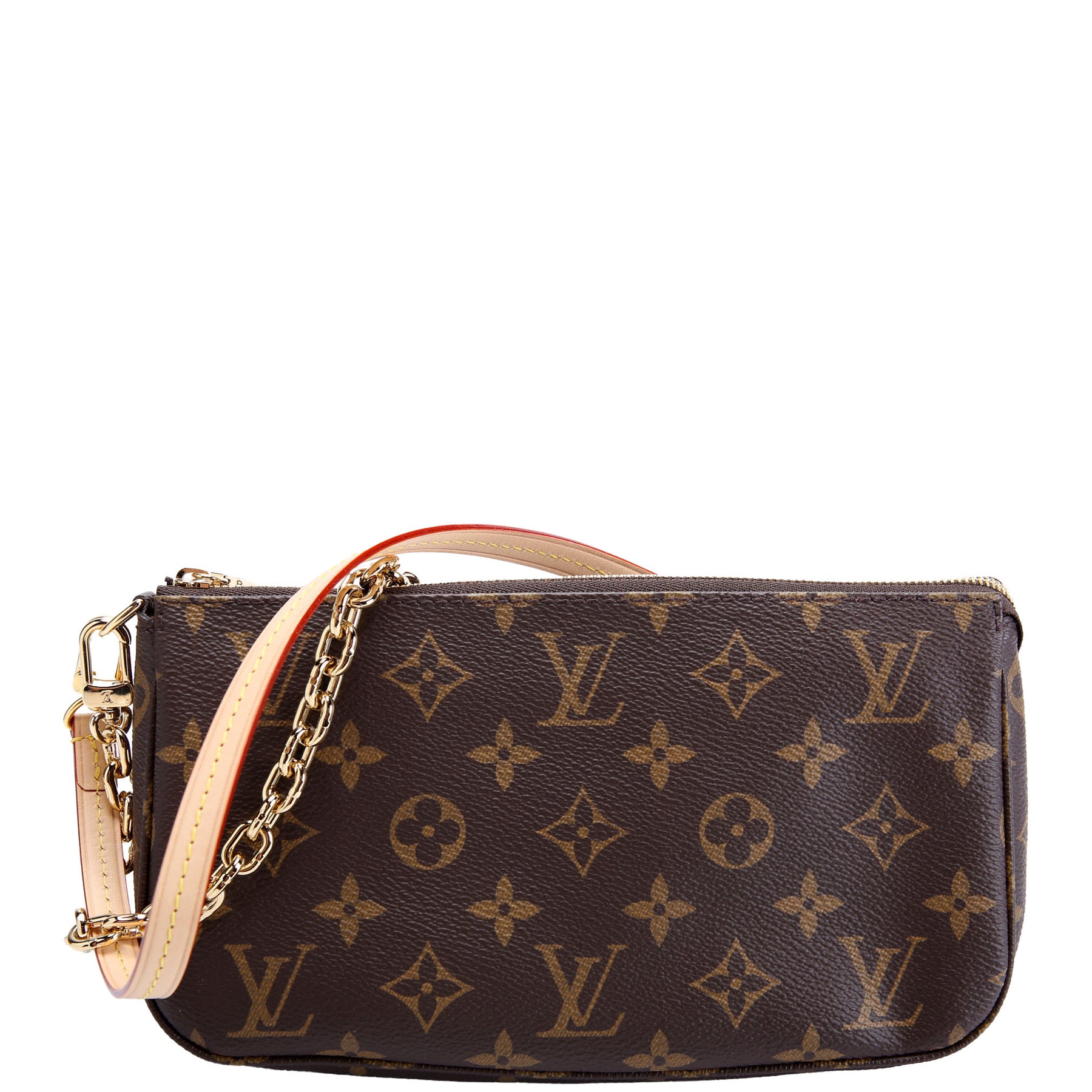This pre-owned Louis Vuitton Pochette Accessories NV With Chain is guaranteed 100% authentic. The exterior is in the classic Monogram coated canvas.