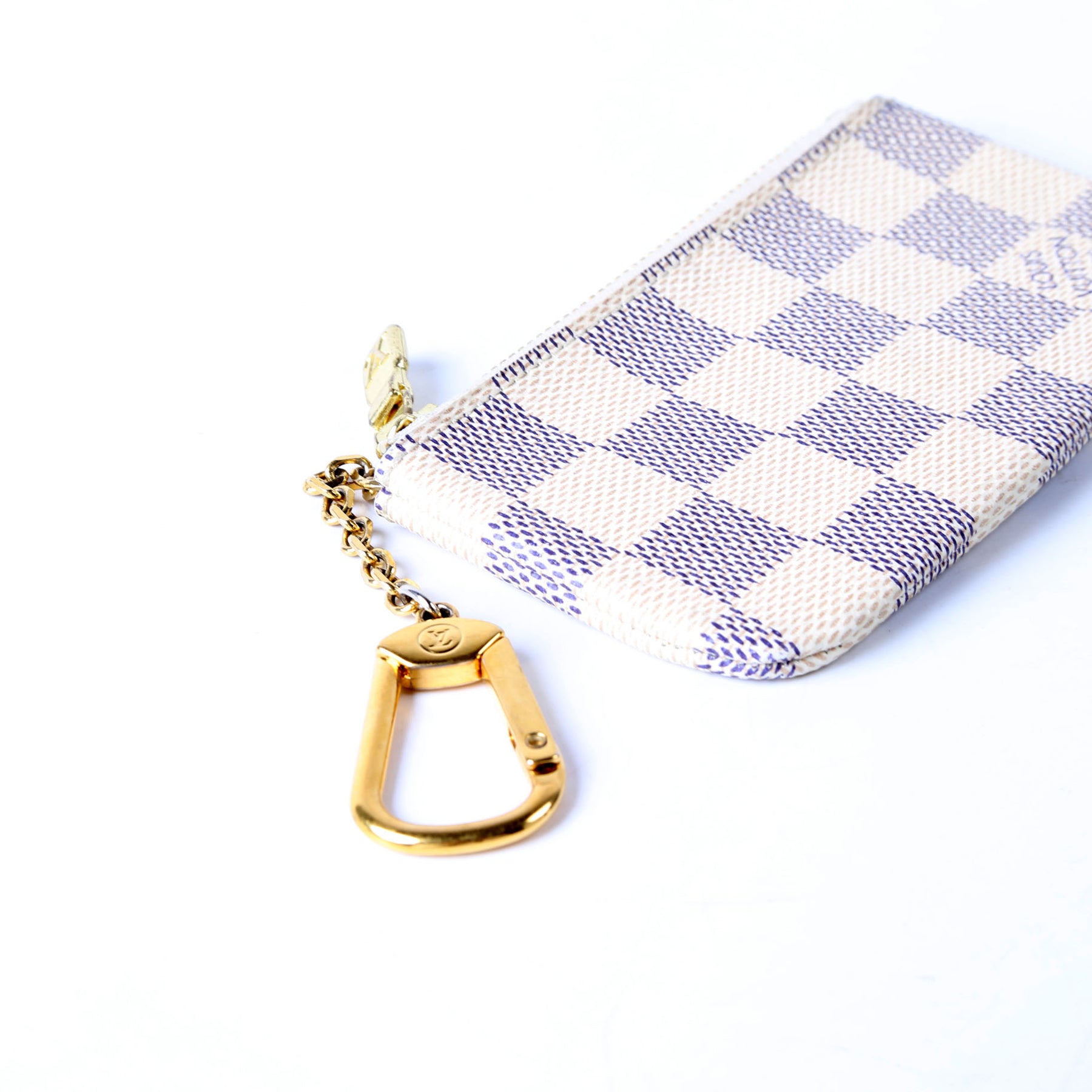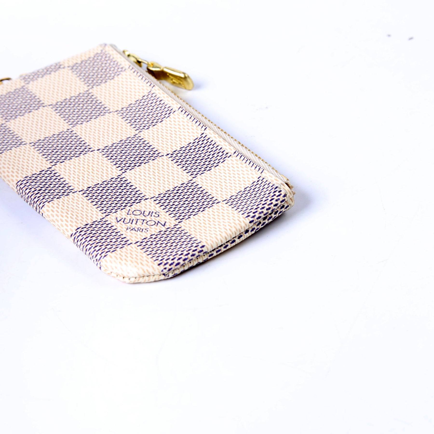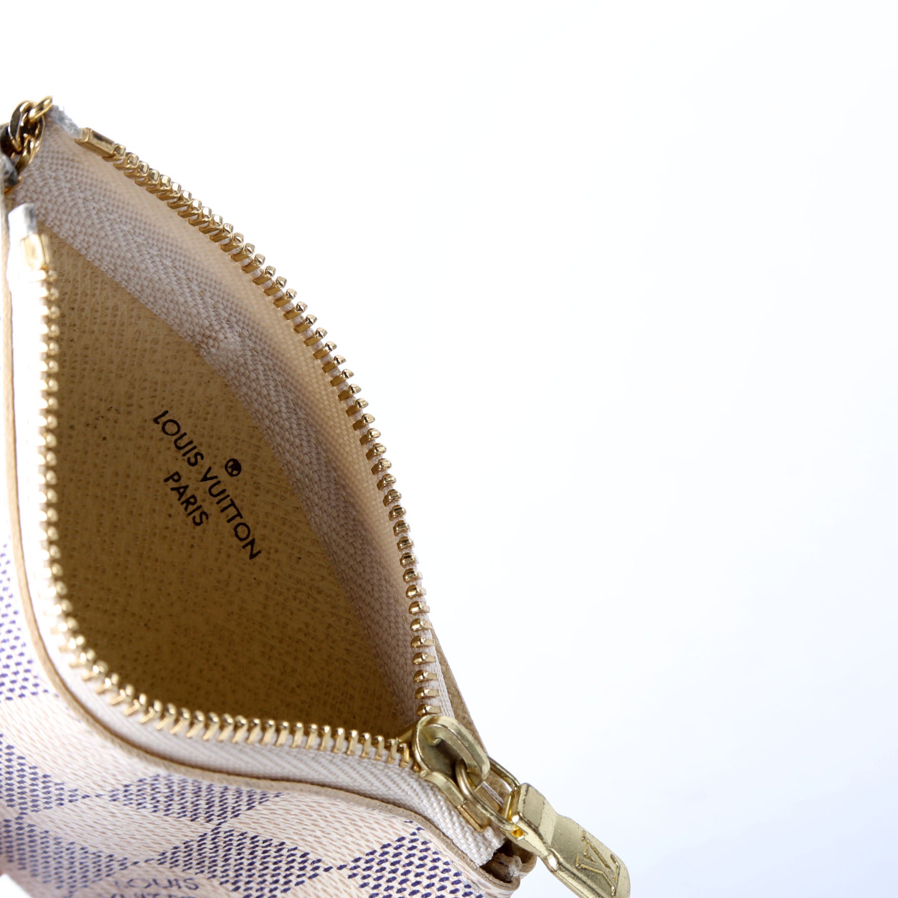 This pre-owned Louis Vuitton Pochette Cles is guaranteed 100% authentic. The exterior is in the classic Damier Azur coated canvas.