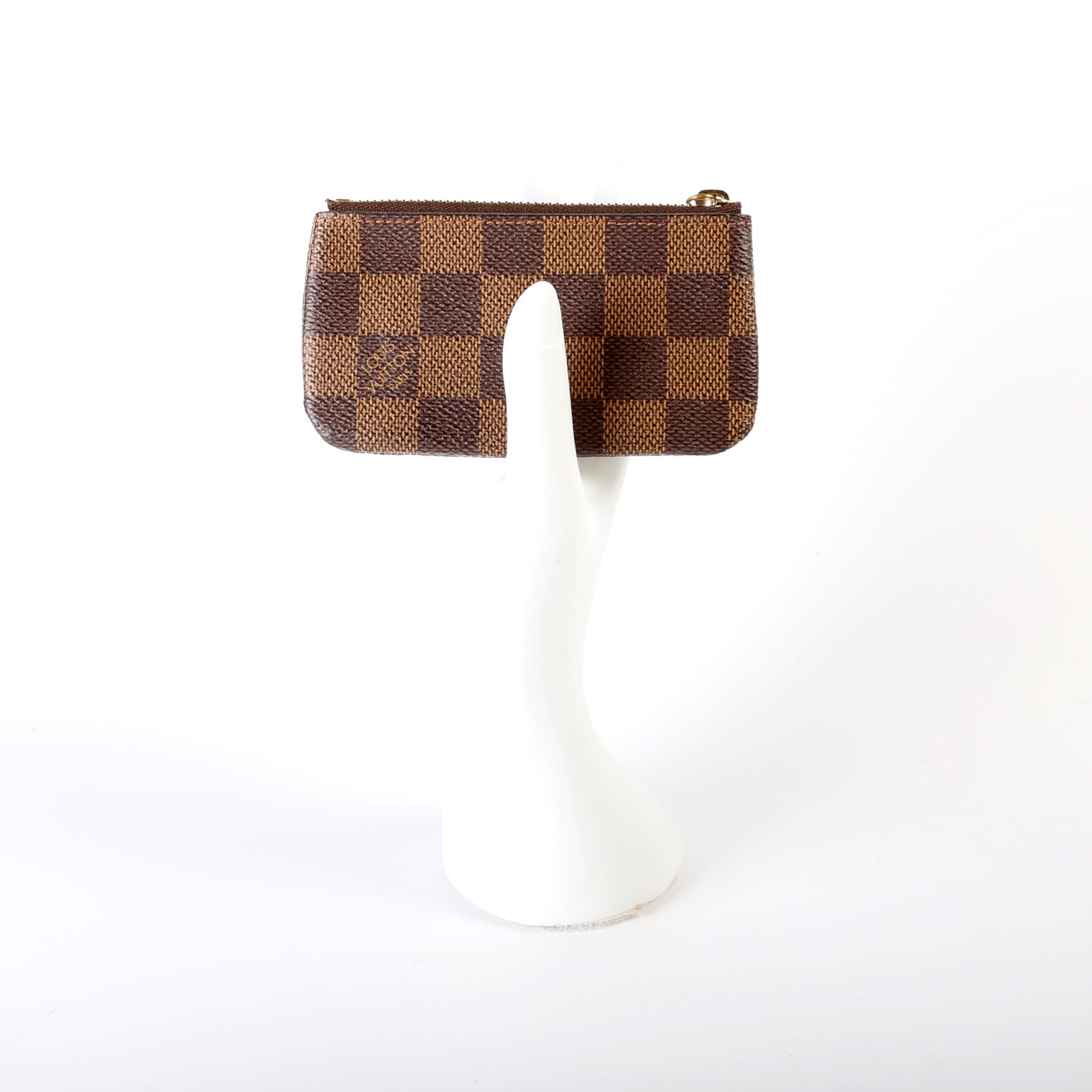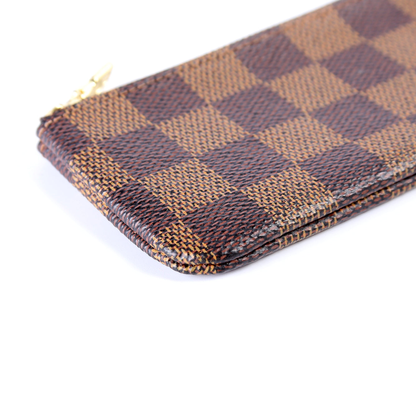 This pre-owned Louis Vuitton Pochette Cles is guaranteed 100% authentic. The exterior is in the classic Louis Vuitton Damier Ebene coated canvas.