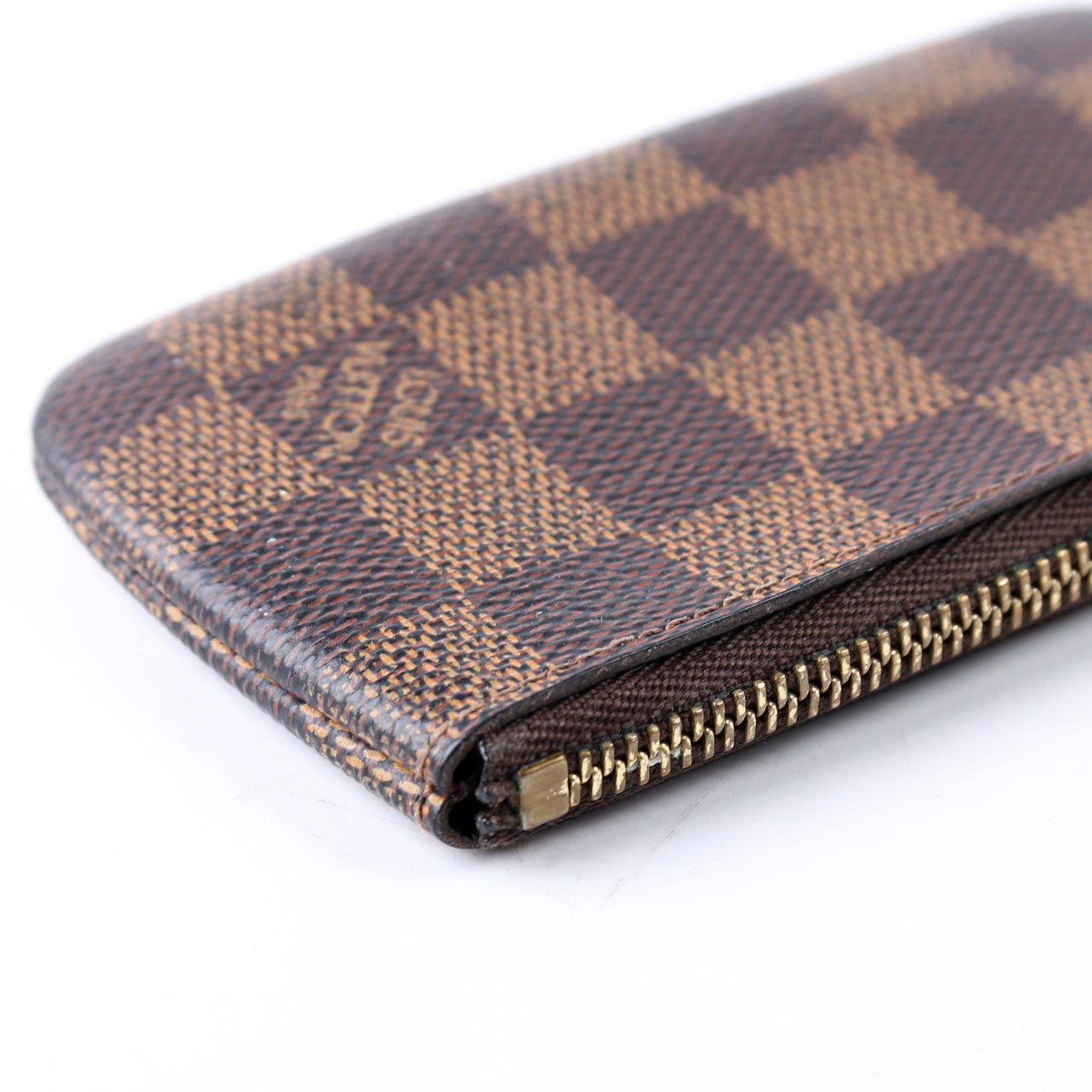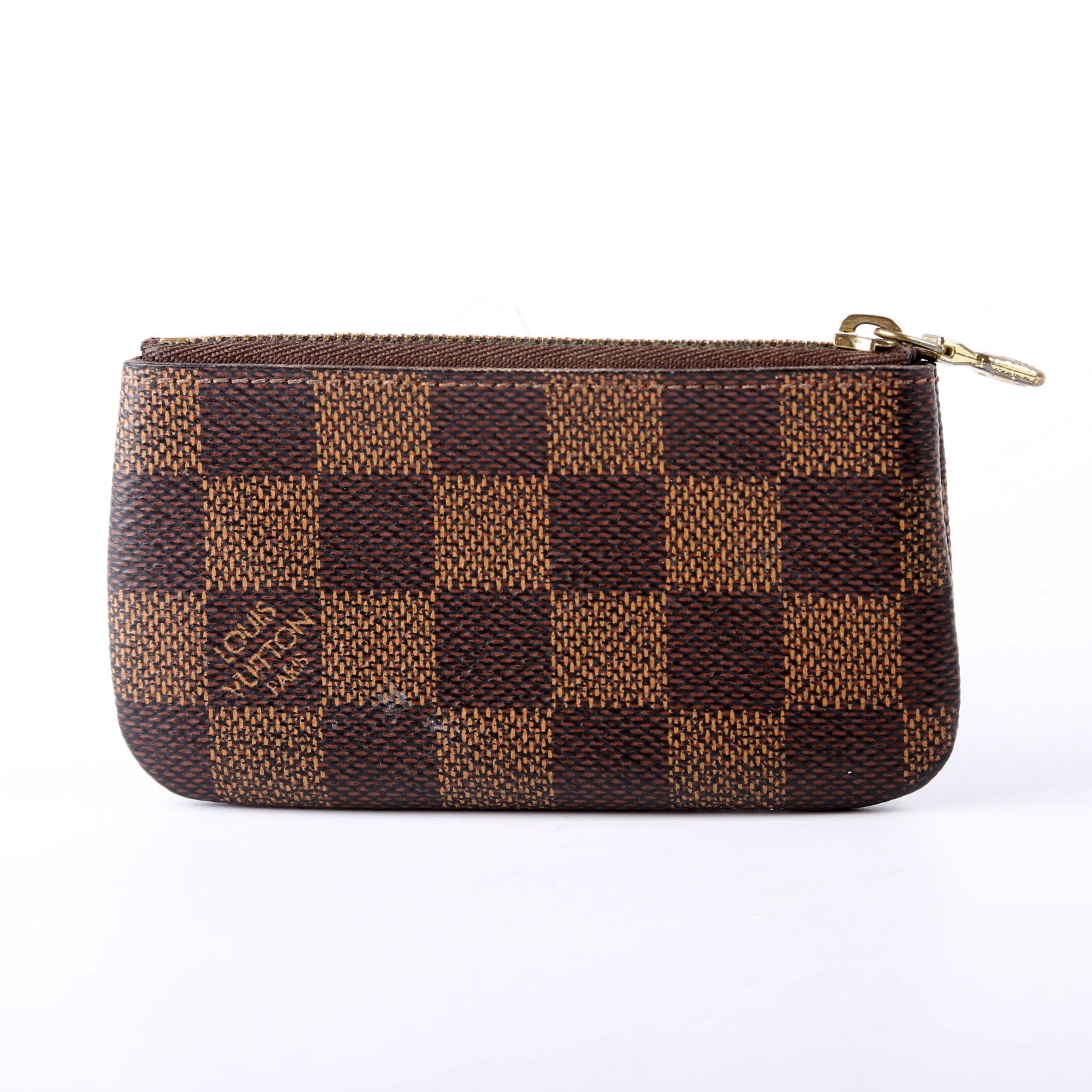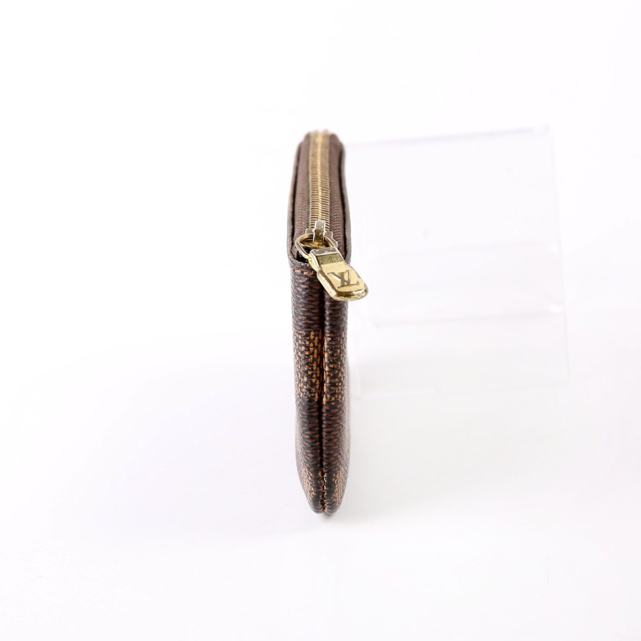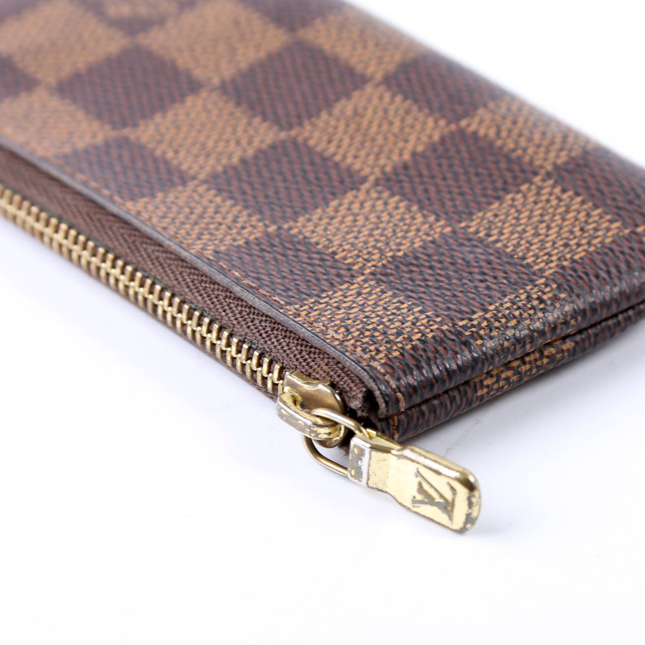 This pre-owned Louis Vuitton Pochette Cles is guaranteed 100% authentic. The exterior is in the classic Louis Vuitton Damier Ebene coated canvas.