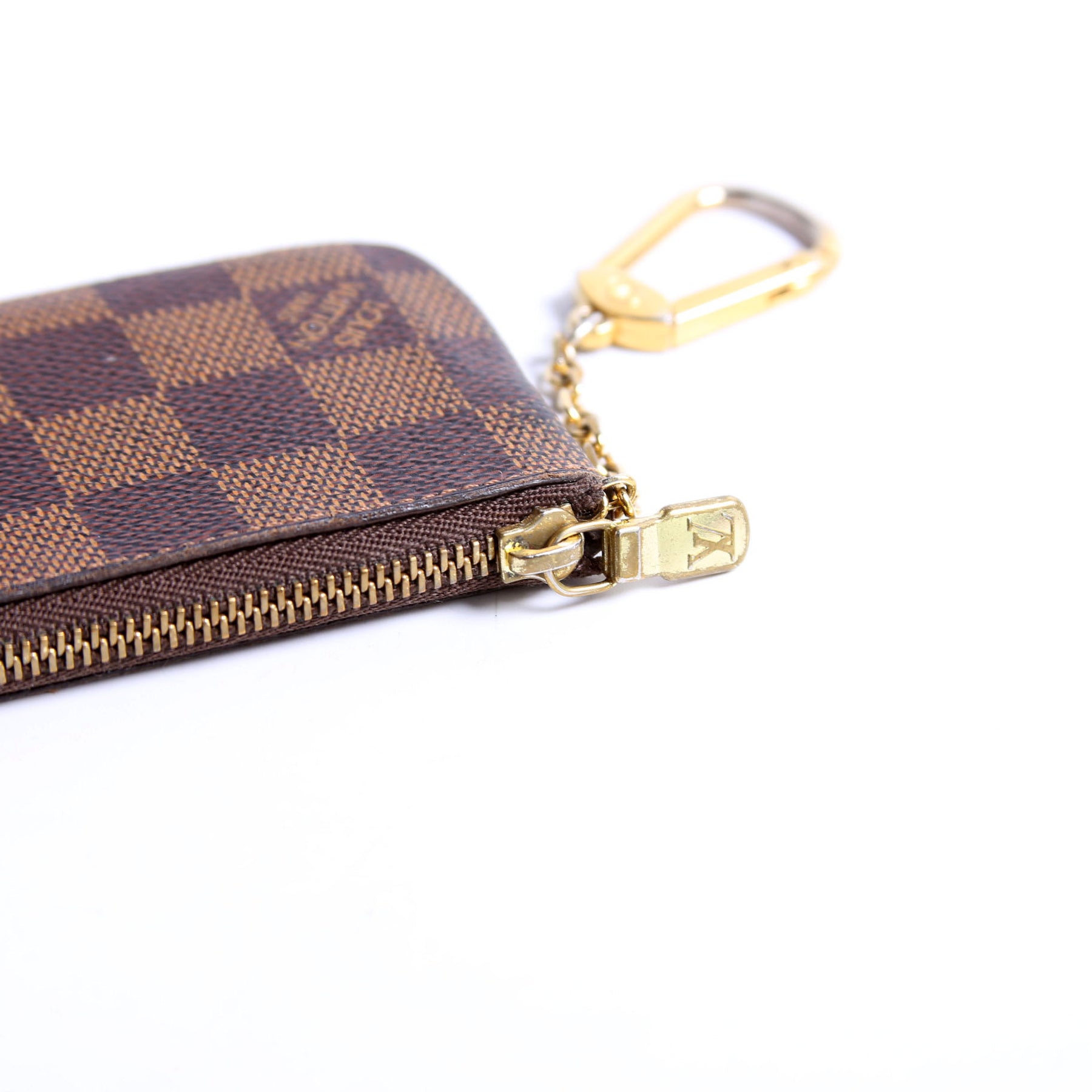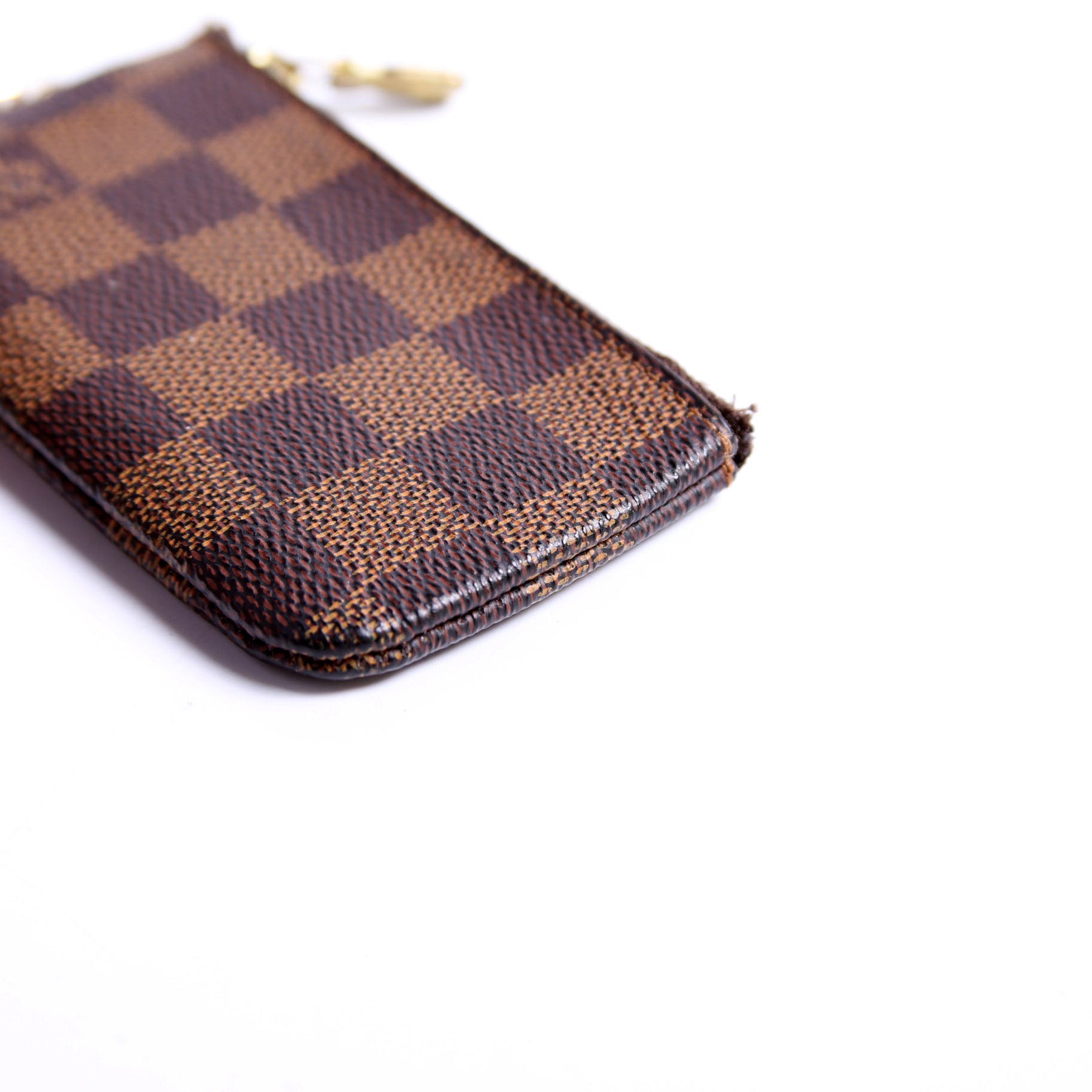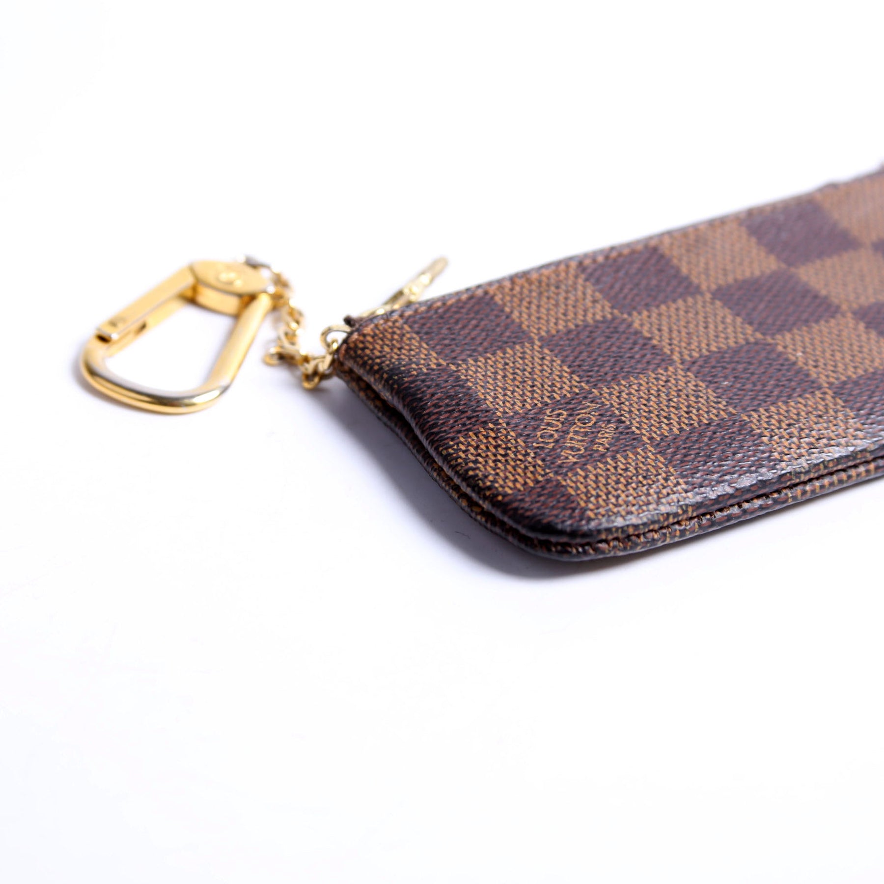 This pre-owned Louis Vuitton Pochette Cles is guaranteed 100% authentic. The exterior is in the classic Louis Vuitton Damier Ebene Coated Canvas.