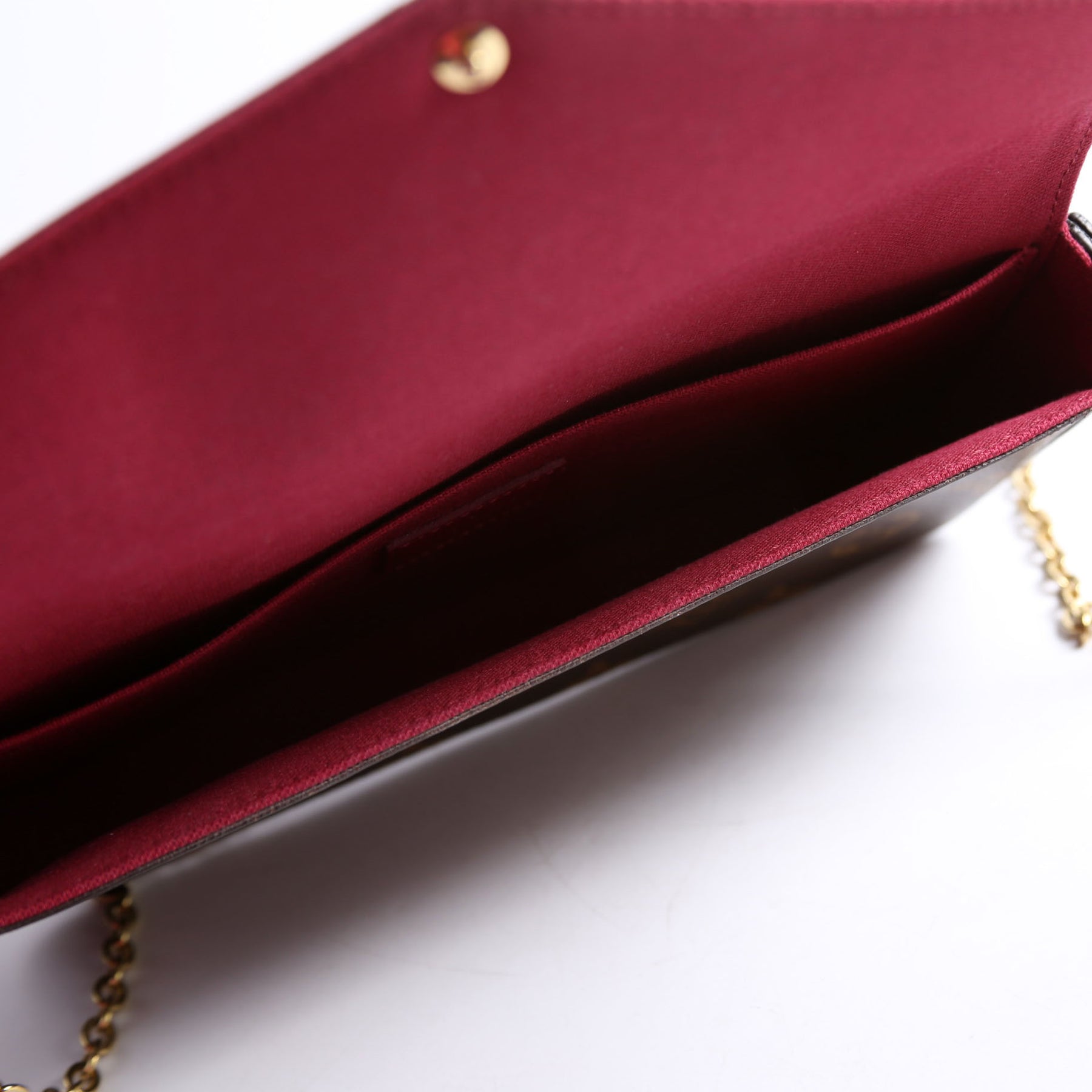 This pre-owned Louis Vuitton Pochette Felicie is guaranteed 100% authentic. The exterior is in the classic Louis Vuitton Monogram coated canvas.