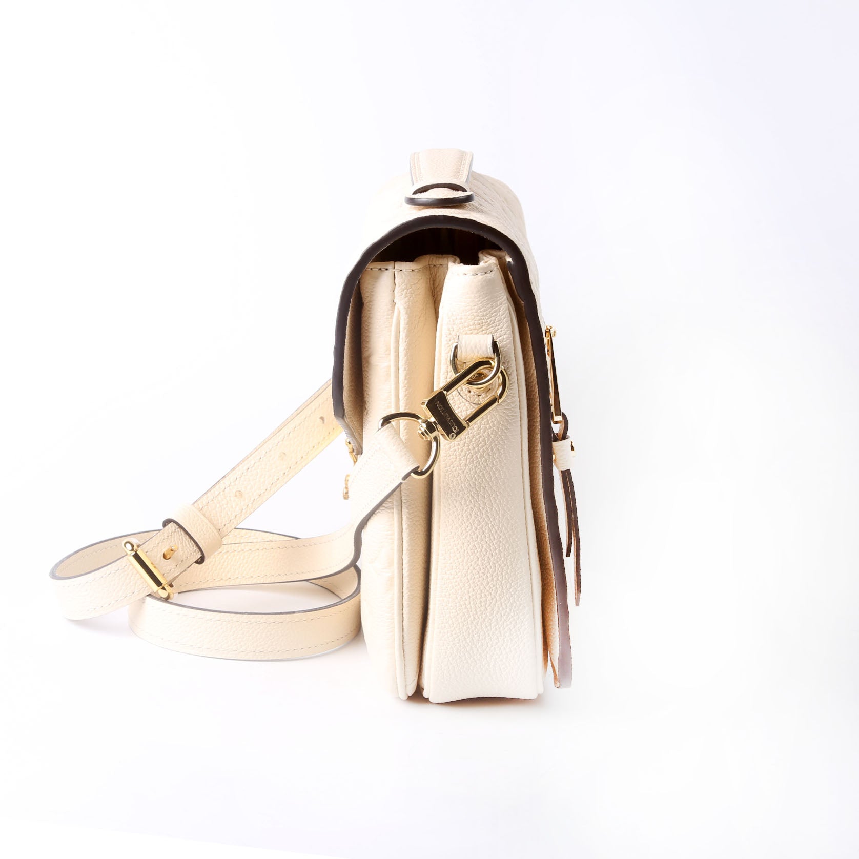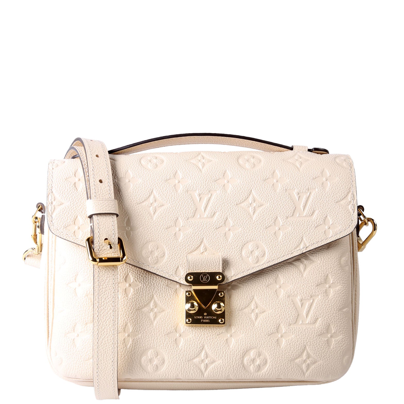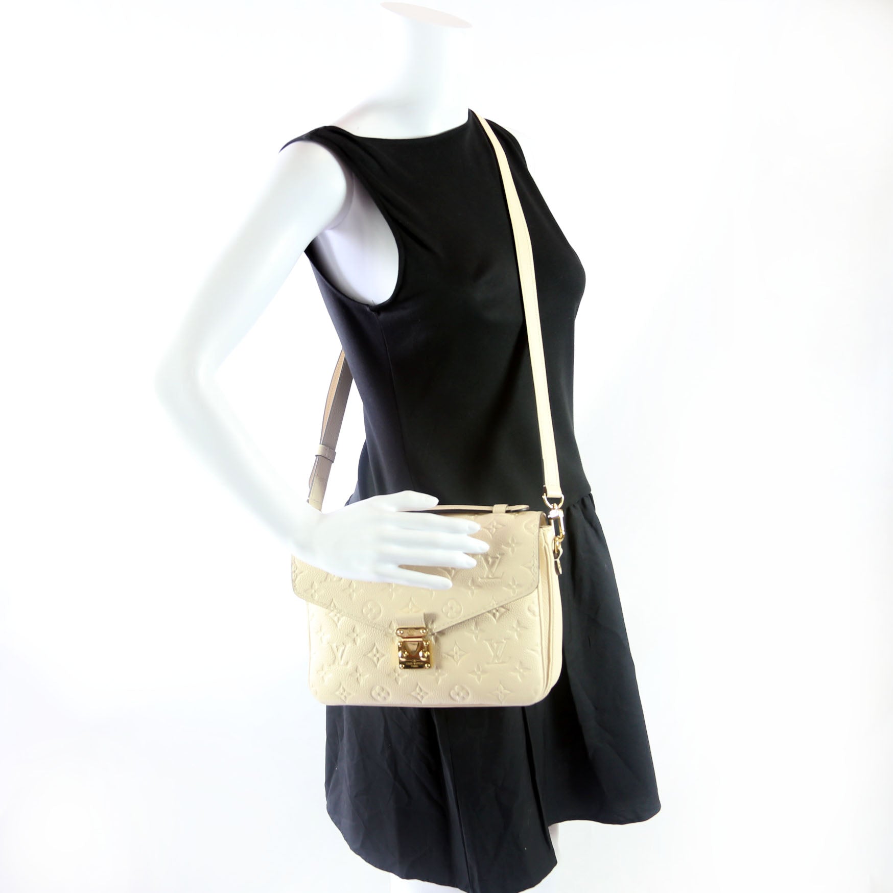 This pre-owned Louis Vuitton Pochette Metis is guaranteed 100% authentic. The exterior is in the classic Louis Vuitton Empreinte leather.
