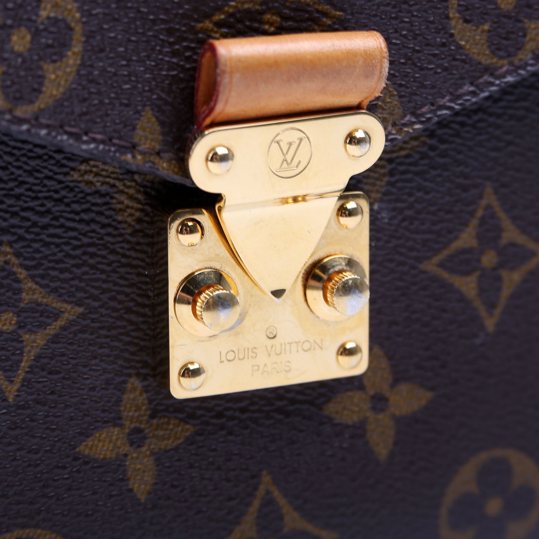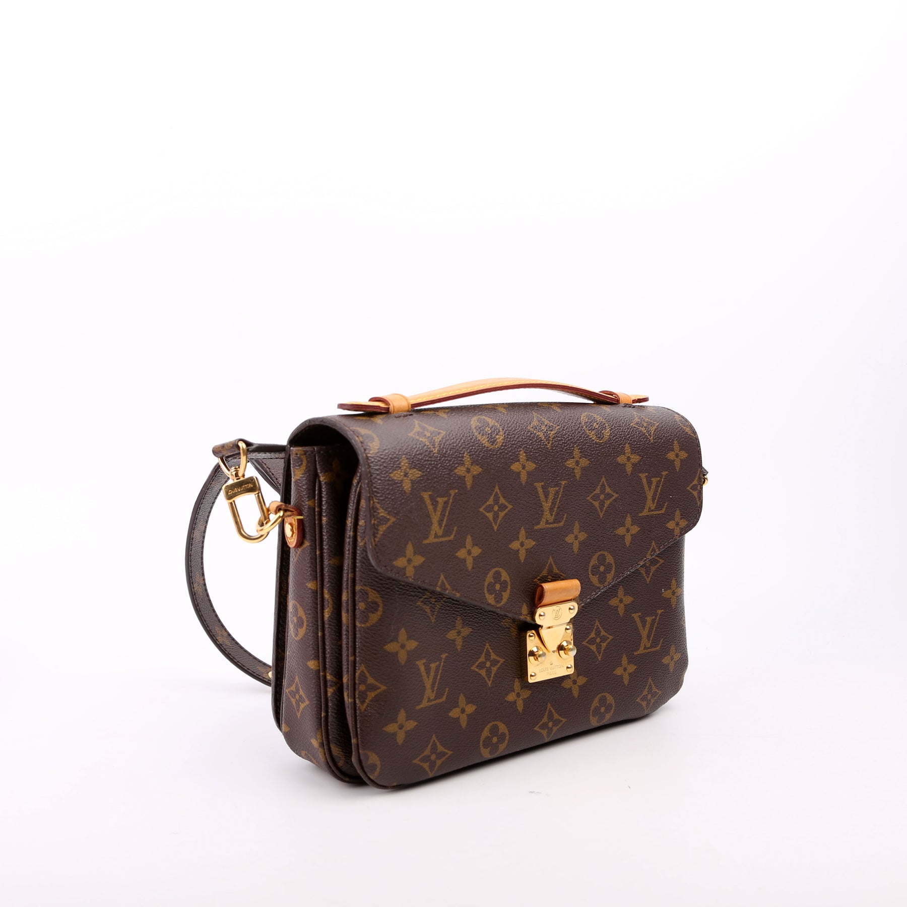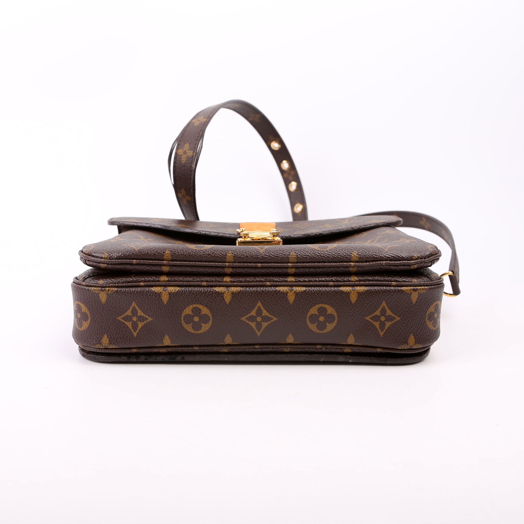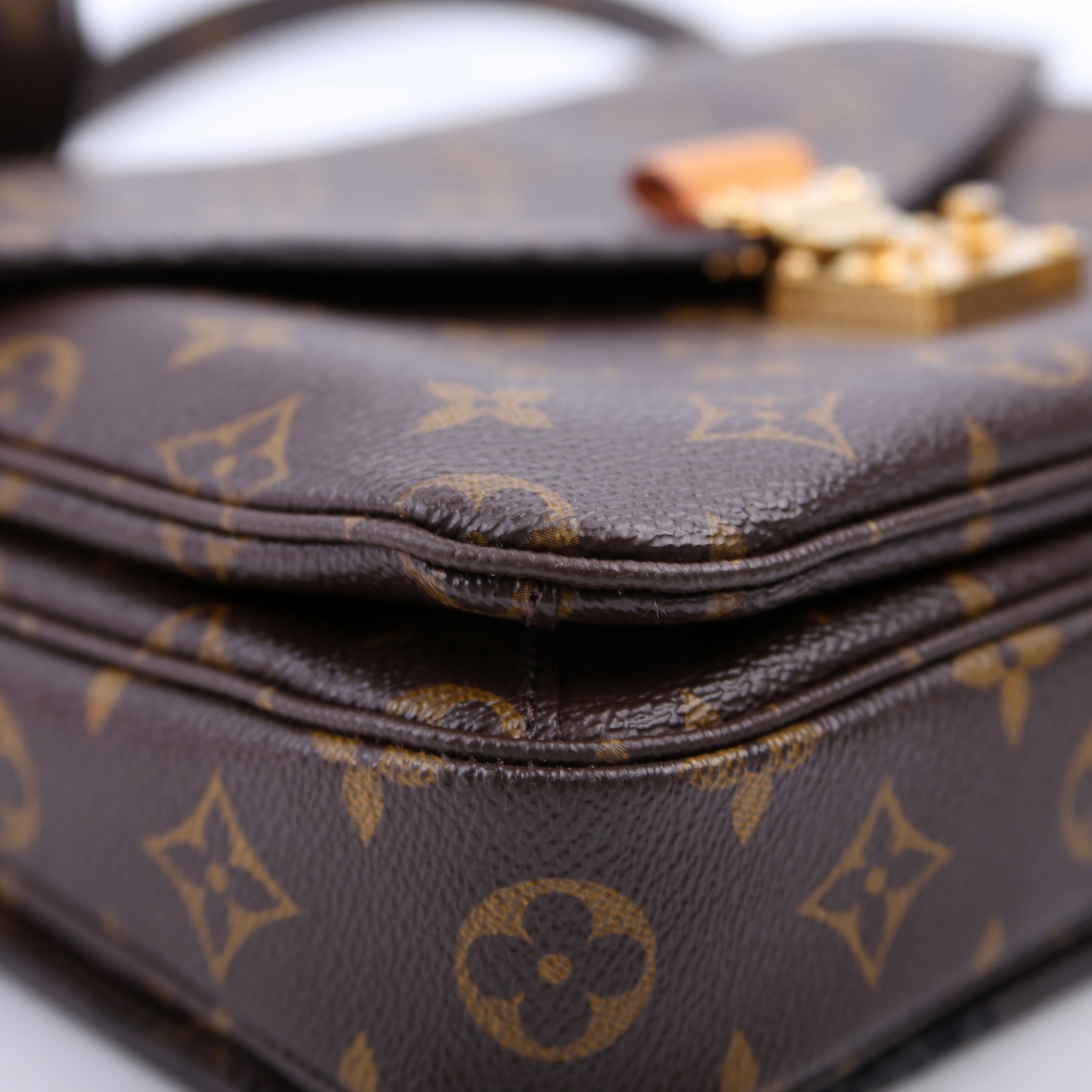This pre-owned Louis Vuitton Pochette Metis is guaranteed 100% authentic. The exterior is in the classic Louis Vuitton Monogram coated canvas.