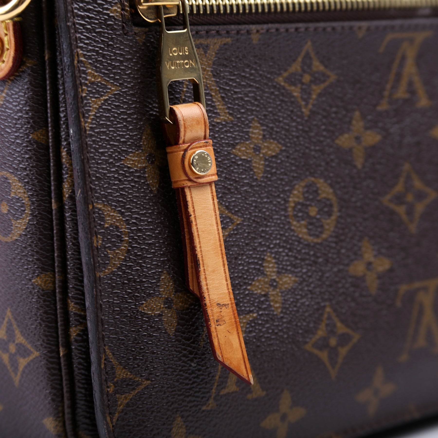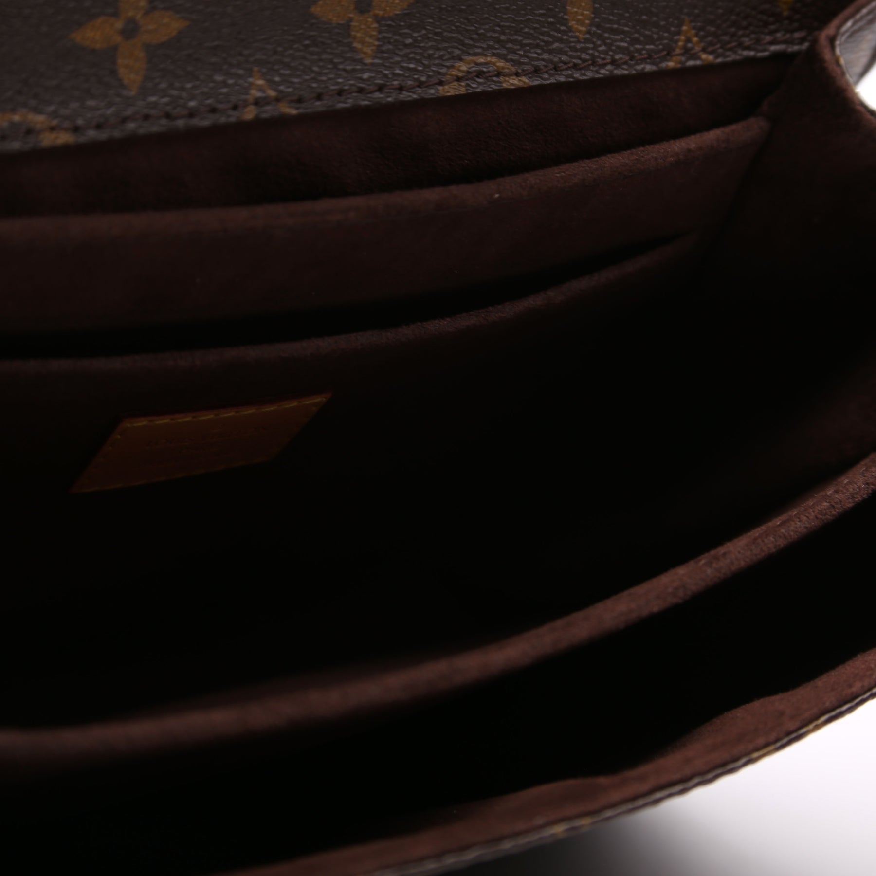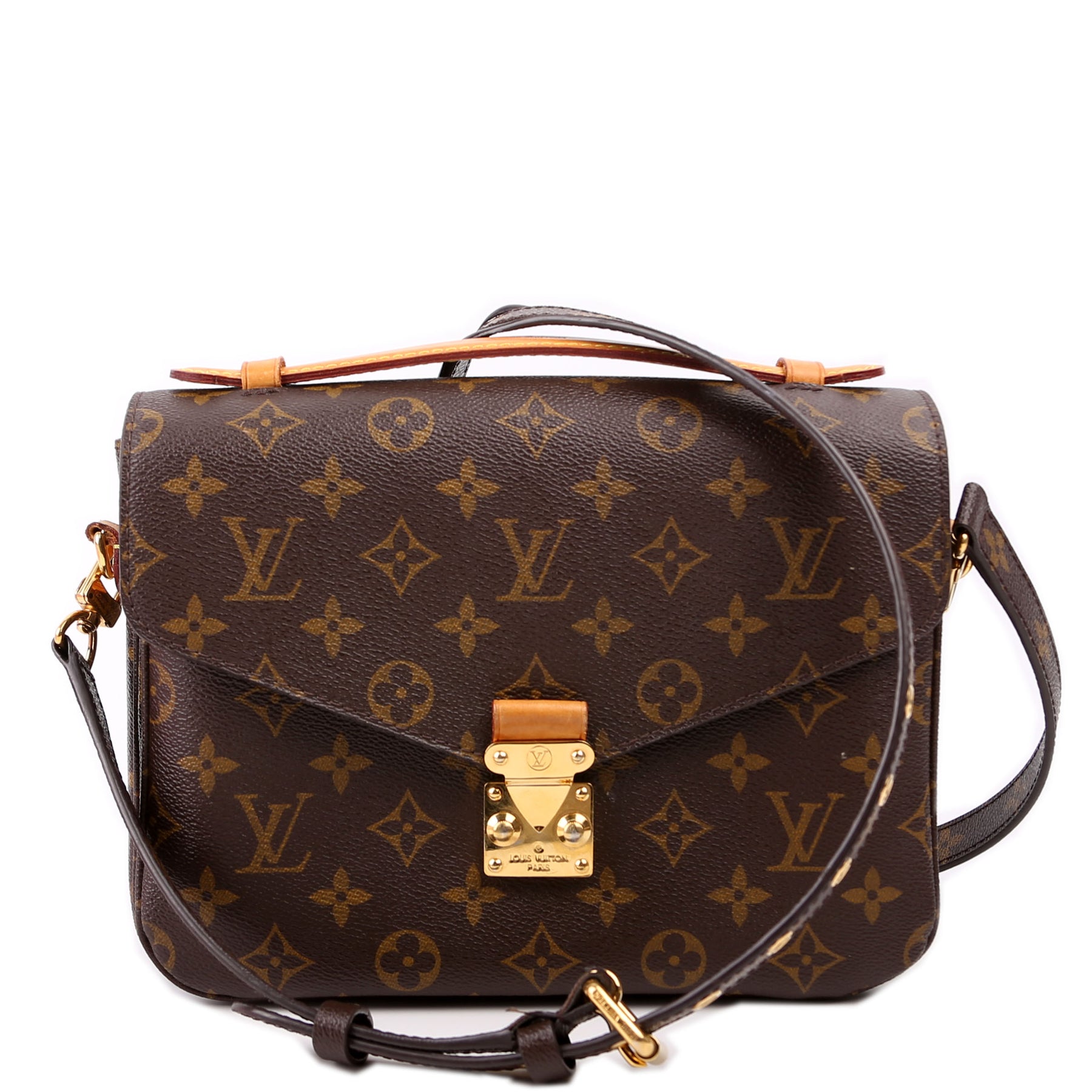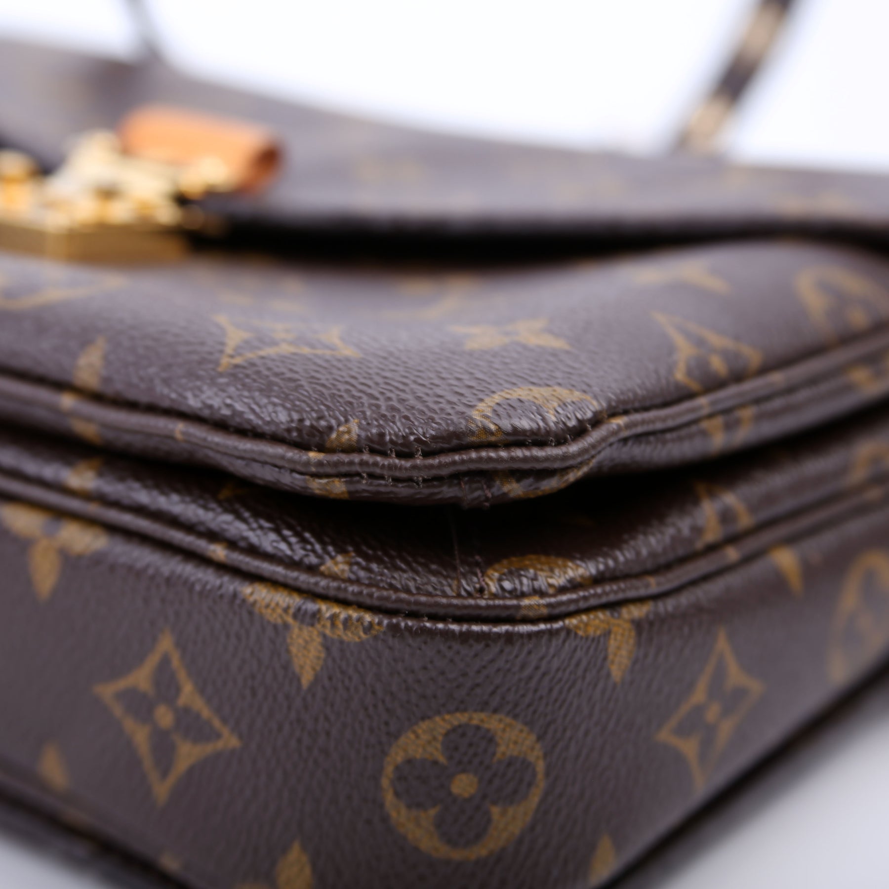 This pre-owned Louis Vuitton Pochette Metis is guaranteed 100% authentic. The exterior is in the classic Louis Vuitton Monogram coated canvas.