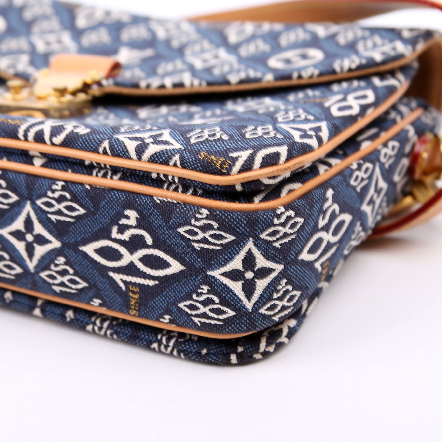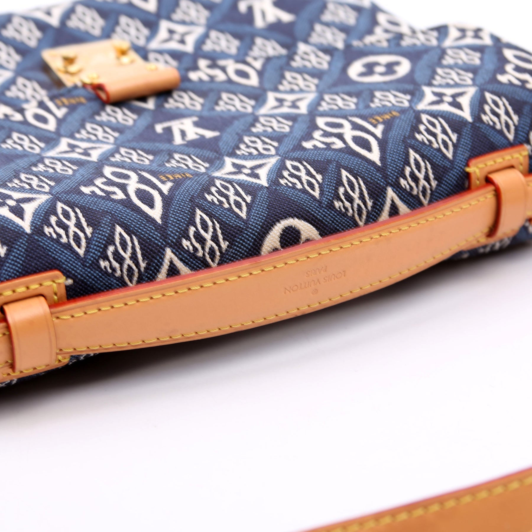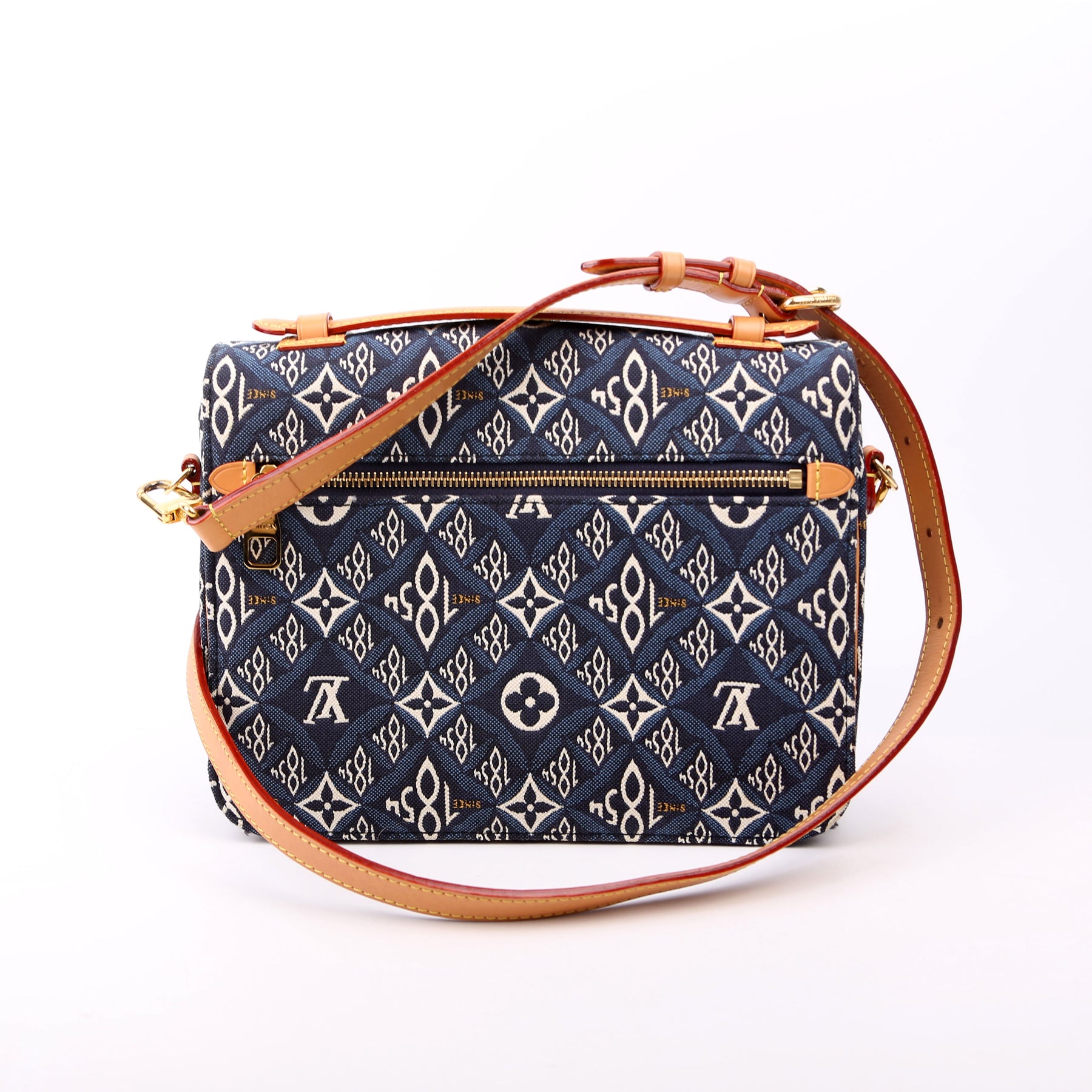 This pre-owned Louis Vuitton Pochette Metis is guaranteed 100% authentic. The exterior is in the Louis Vuitton Since 1854 Jacquard canvas.