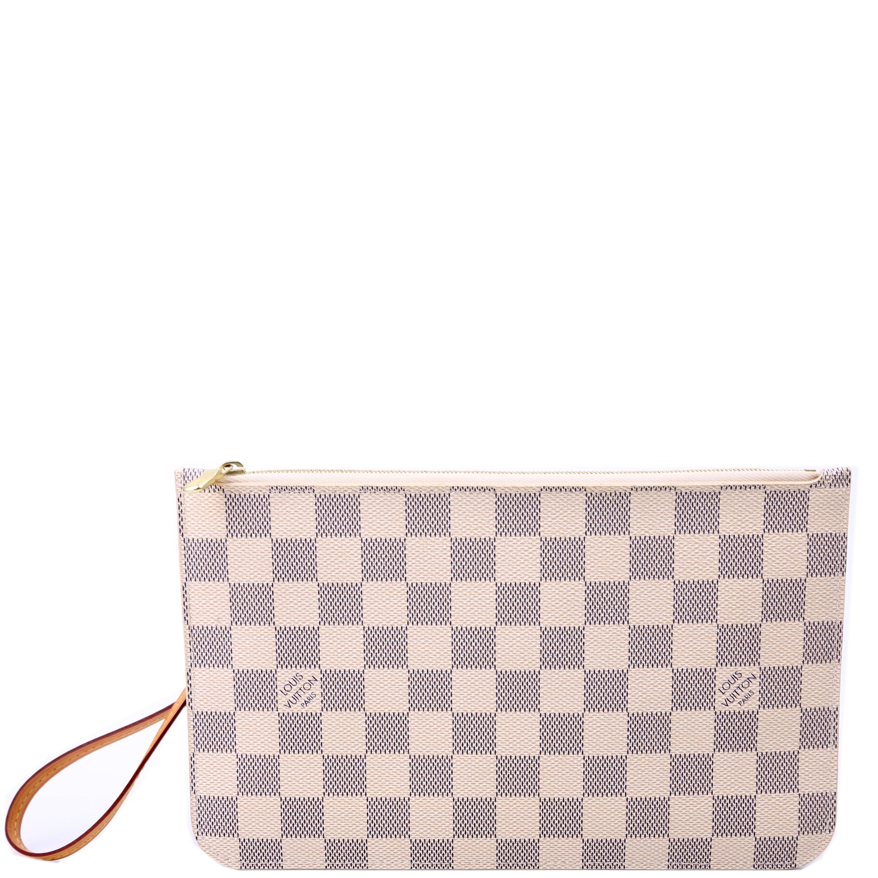 This pre-owned Louis Vuitton Pochette Only Neverfull is guaranteed 100% authentic. The exterior is in the classic Louis Vuitton Damier Azur coated canvas.