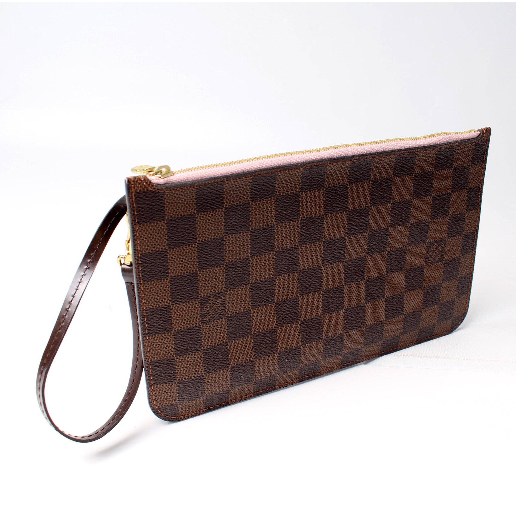 This pre-owned Louis Vuitton Pochette Only Neverfull is guaranteed 100% authentic. The exterior is in the classic Louis Vuitton Damier Ebene coated canvas.
