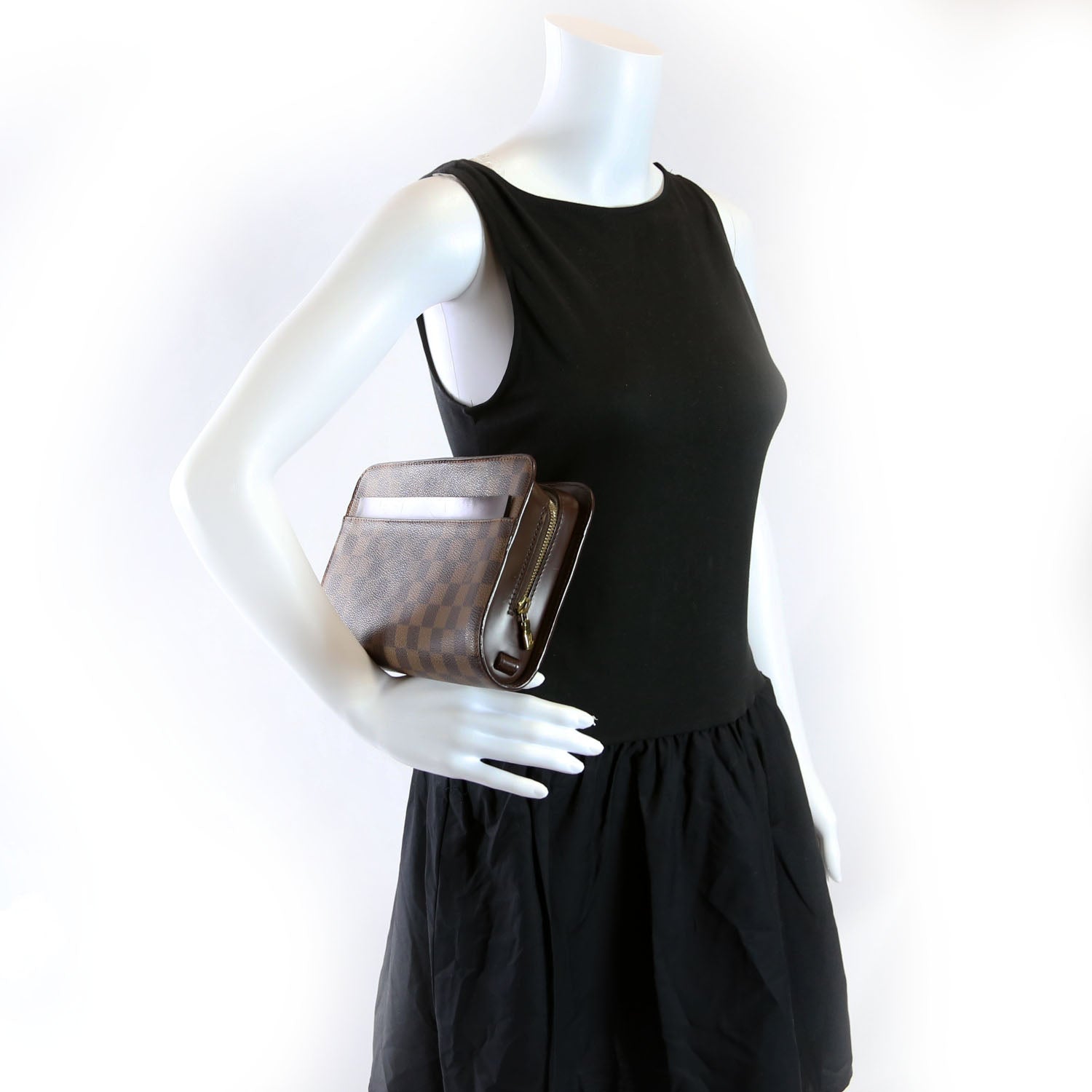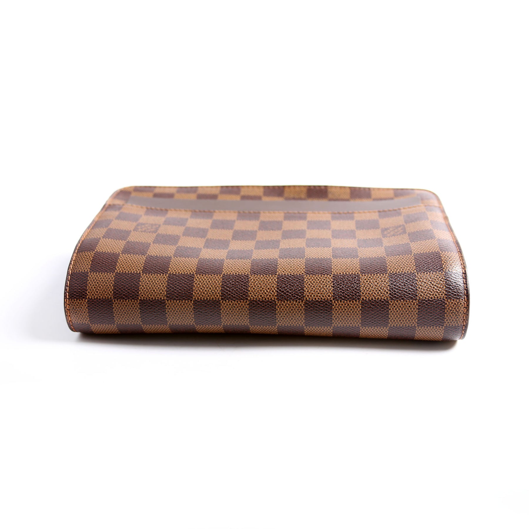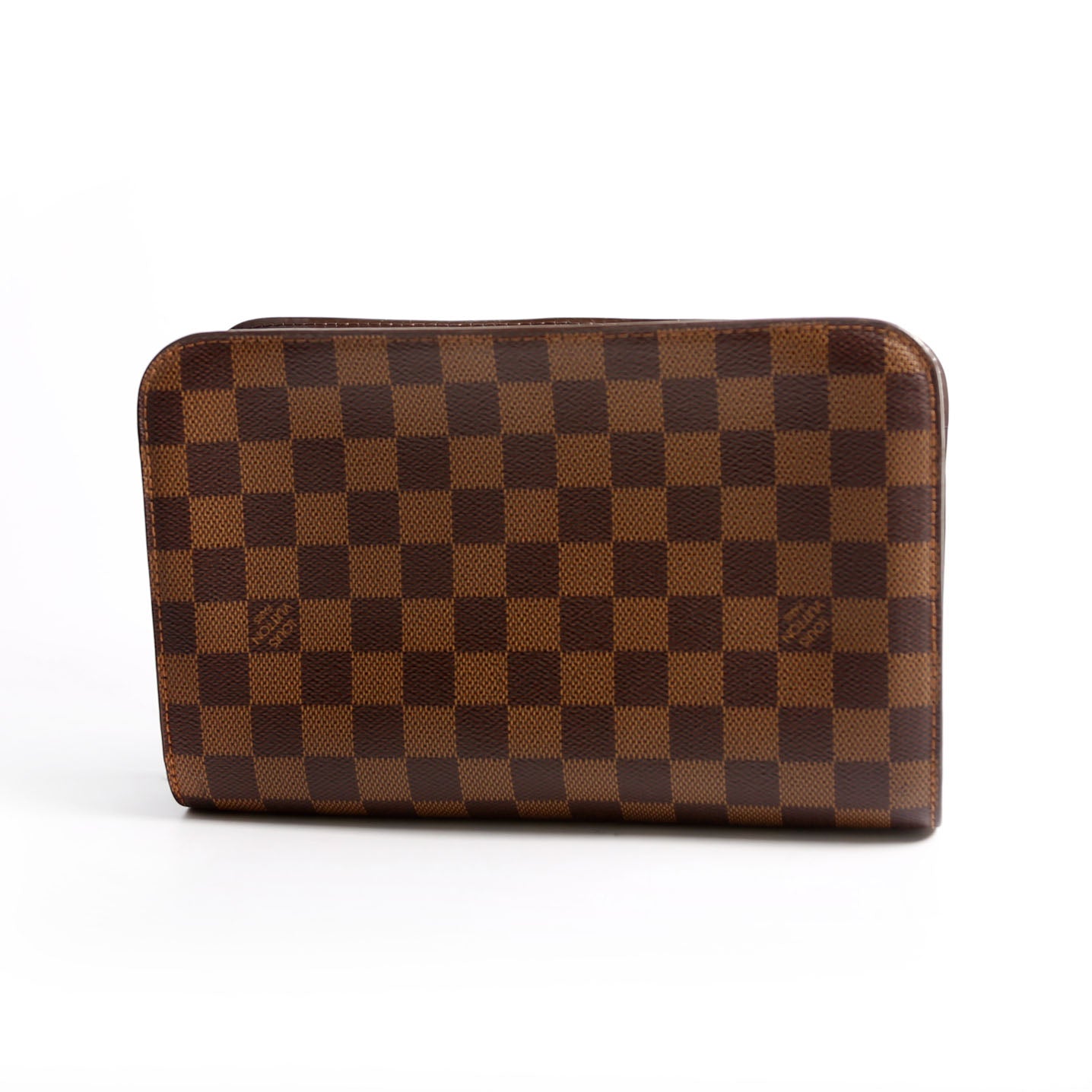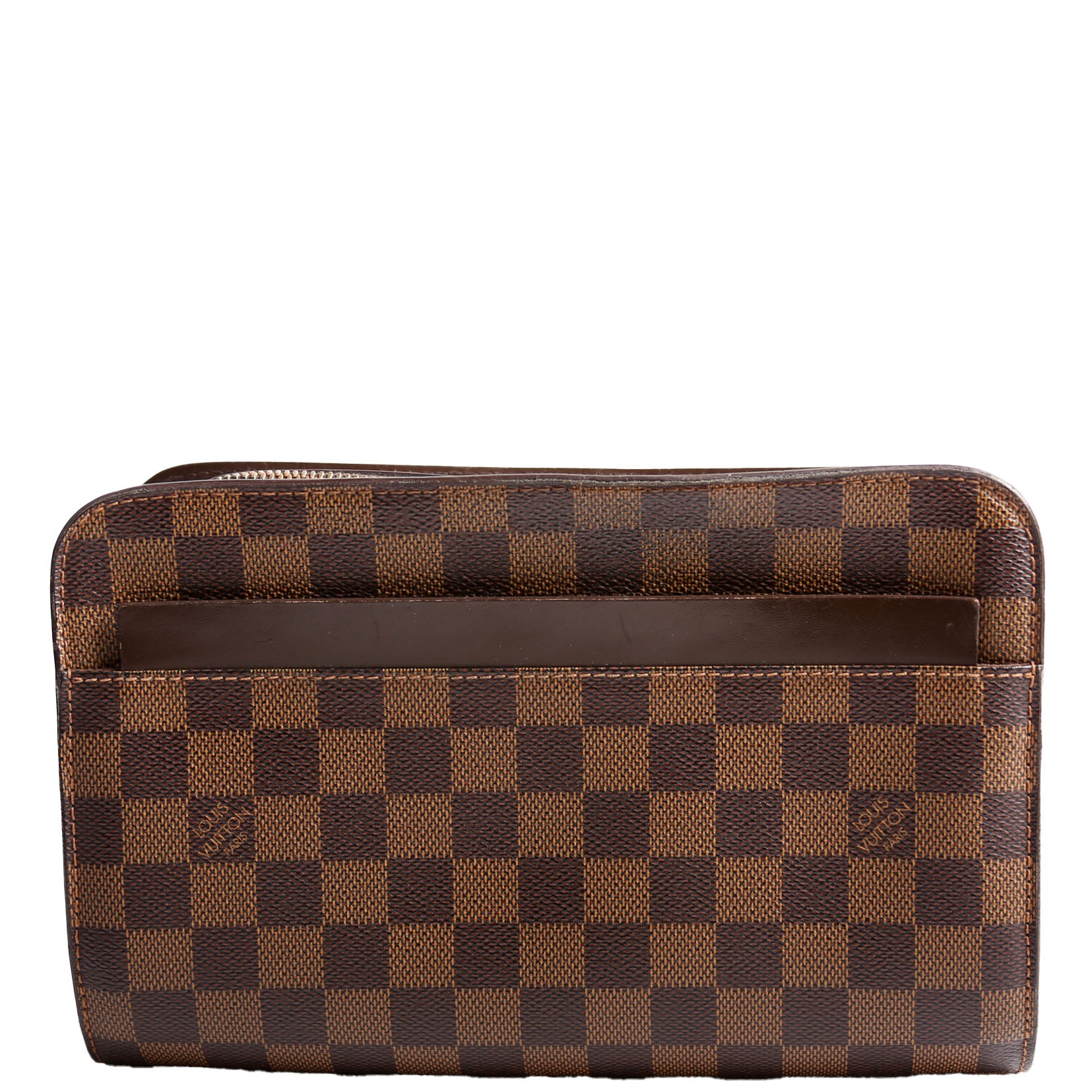 This pre-owned Louis Vuitton Pochette Saint Louis Clutch Ebene is guaranteed 100% authentic. The exterior is in the classic Louis Vuitton Ebene coated canvas material.