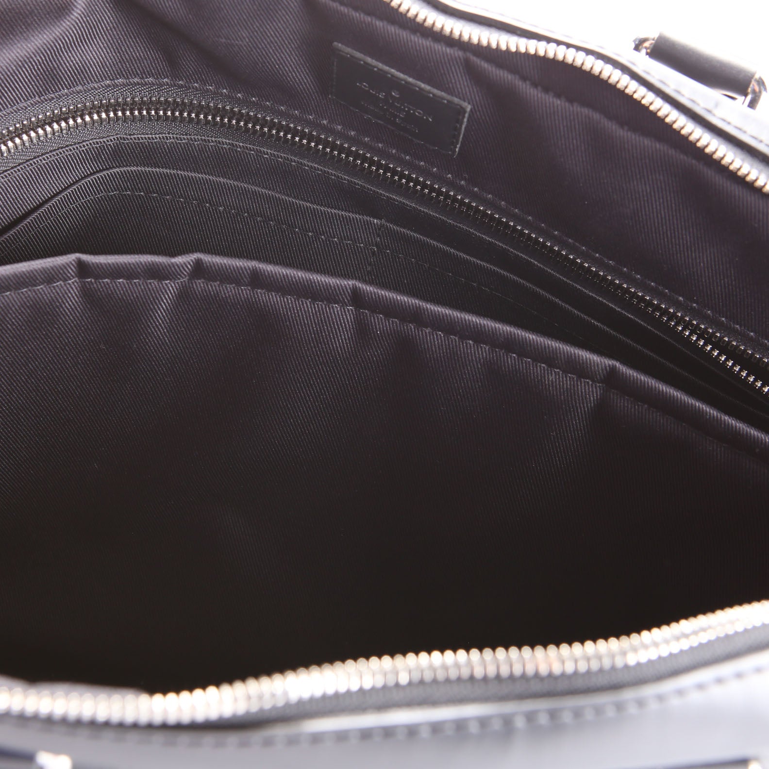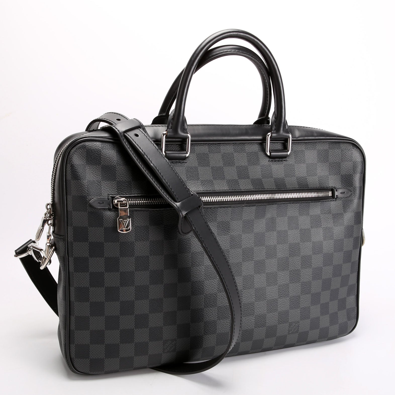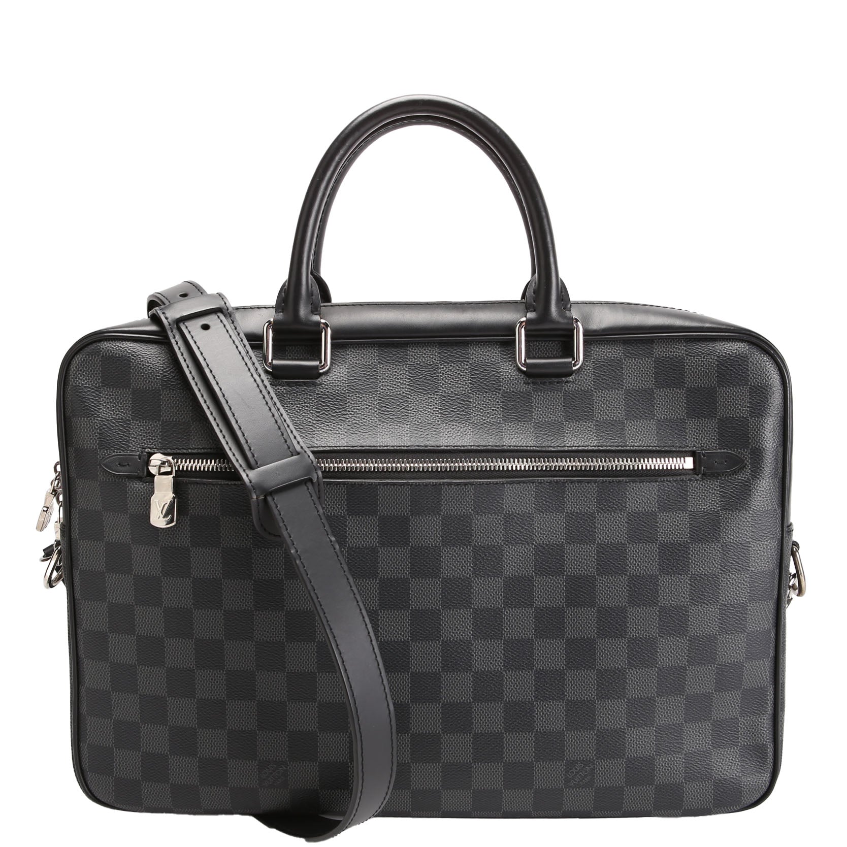 This pre-owned Louis Vuitton Porte Documents Jour is guaranteed 100% authentic. The exterior is in the classic Louis Vuitton Coated Canvas Damier Graphite