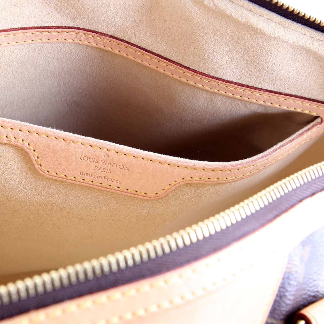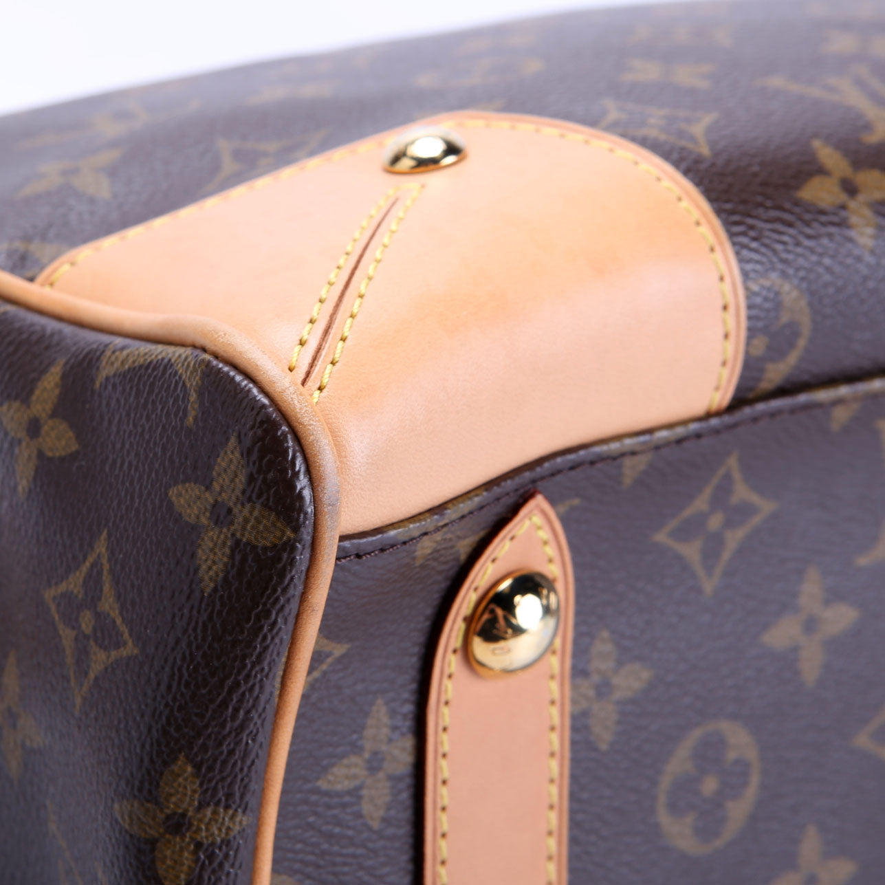 Exterior: The exterior canvas is free from wear. The vachetta leather corners show minor water marks and minor scuff marks.