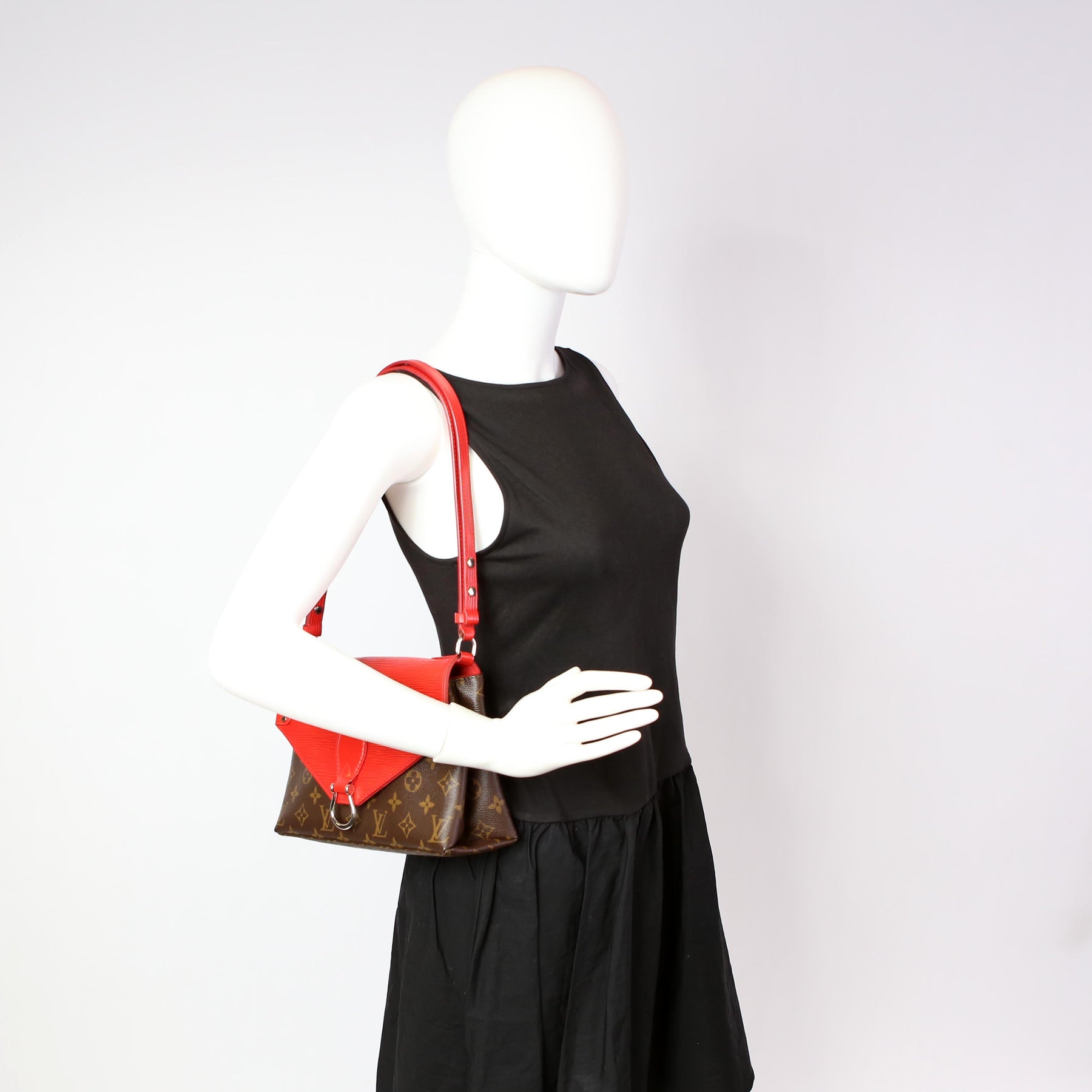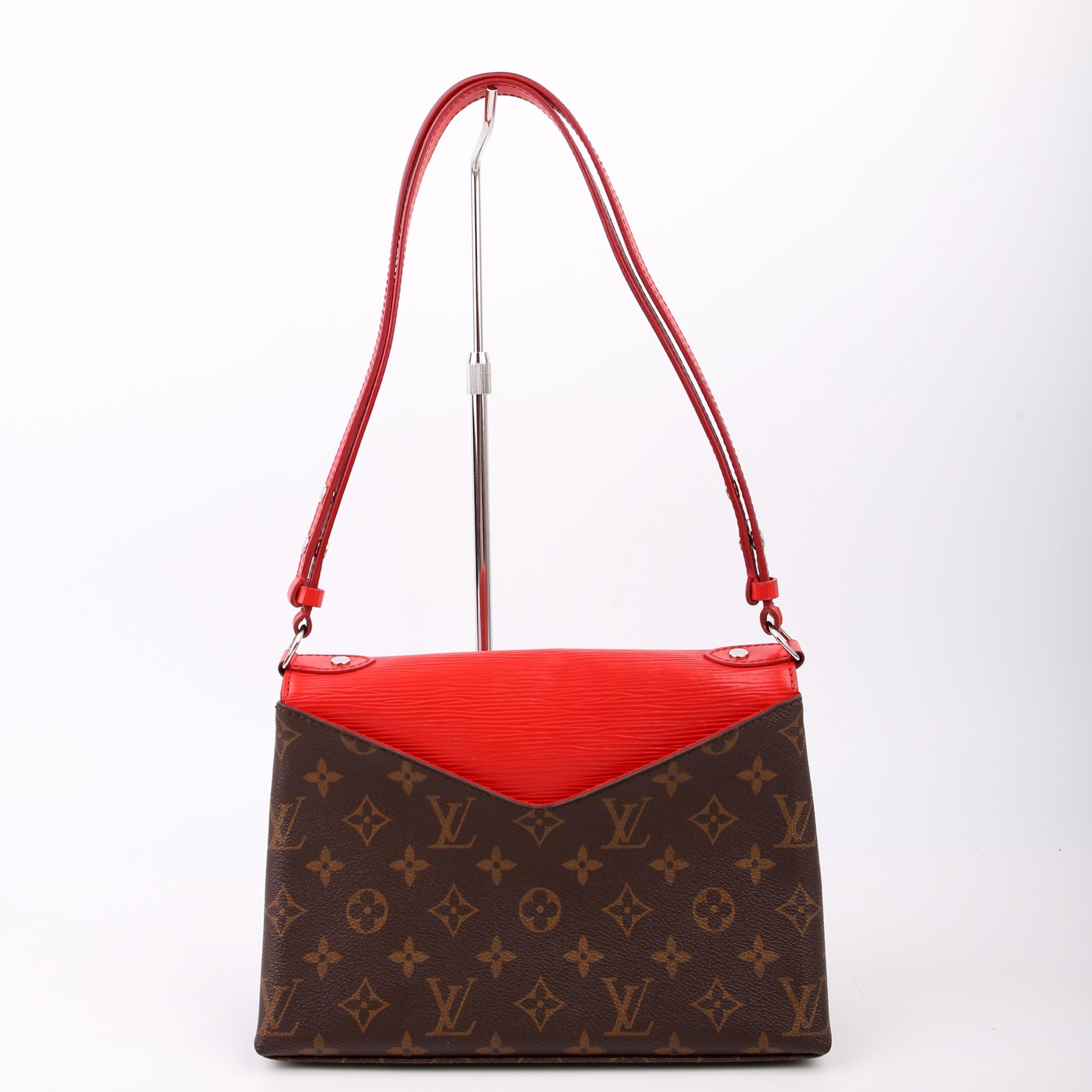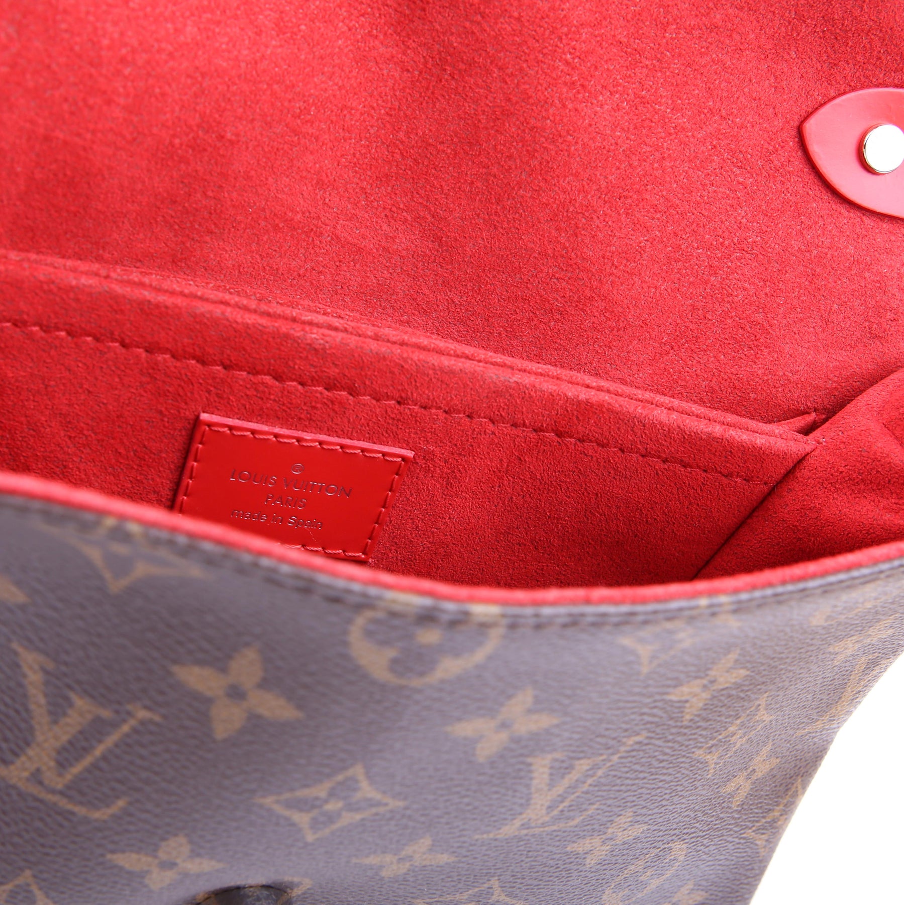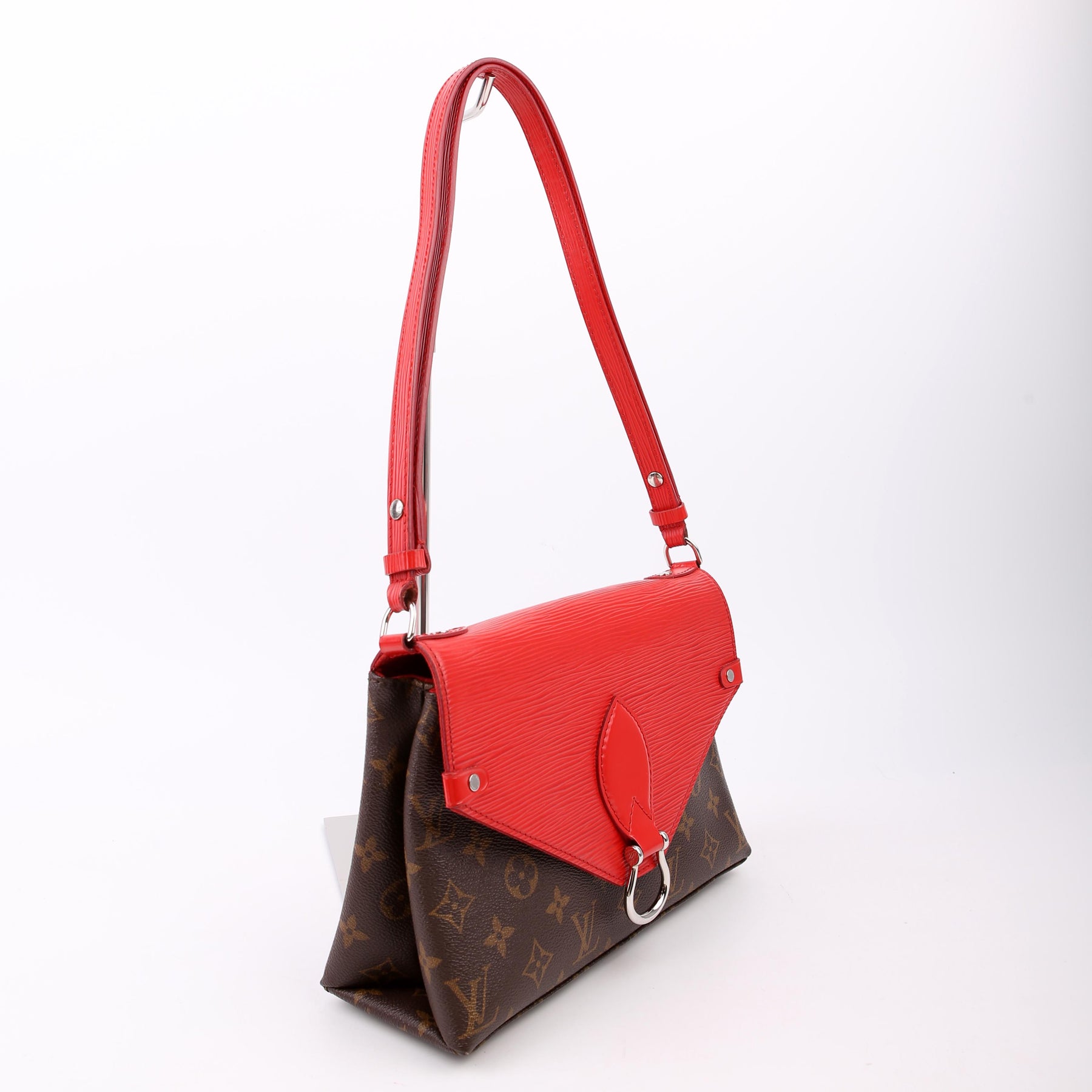 This pre-owned Louis Vuitton Saint Michel is guaranteed 100% authentic. The exterior is in the classic Louis Vuitton Epi leather and Monogram coated canvas.