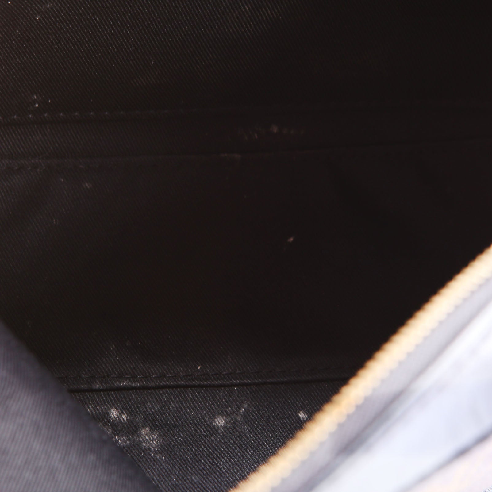 Interior: The interior shows white staining throughout and features one open pocket.