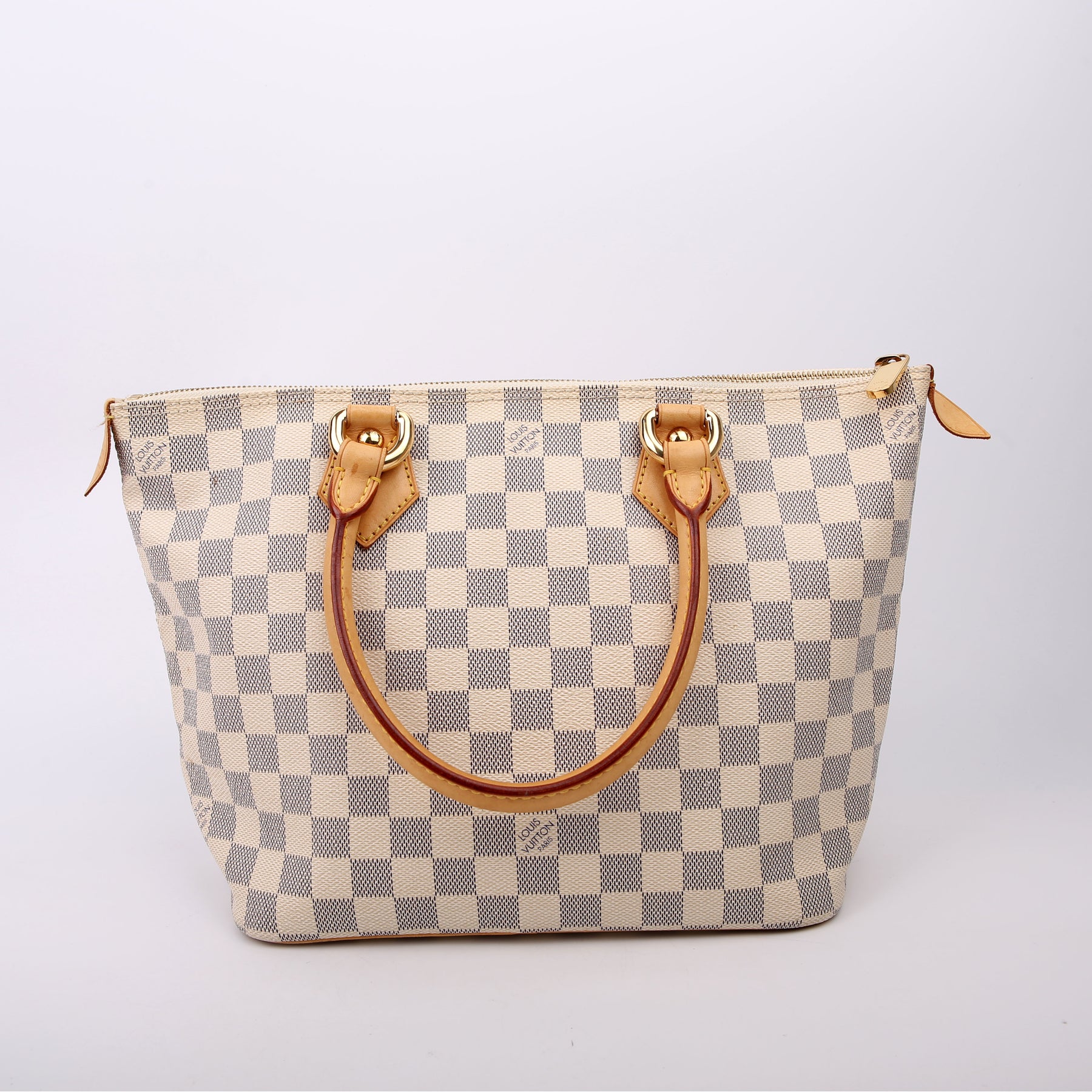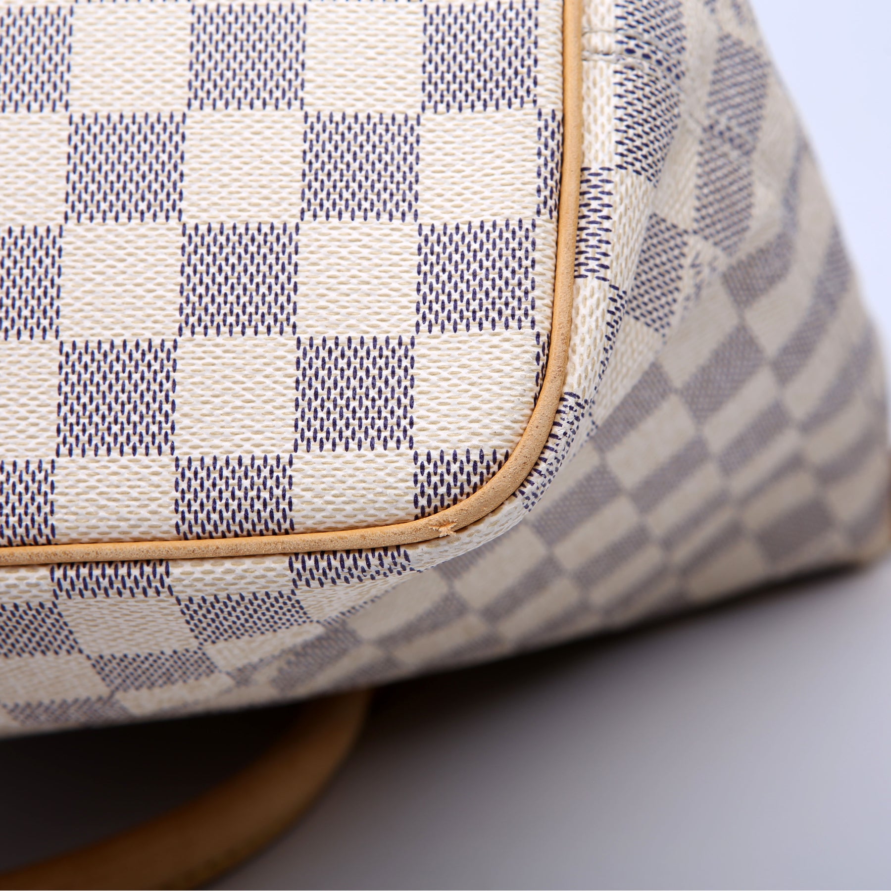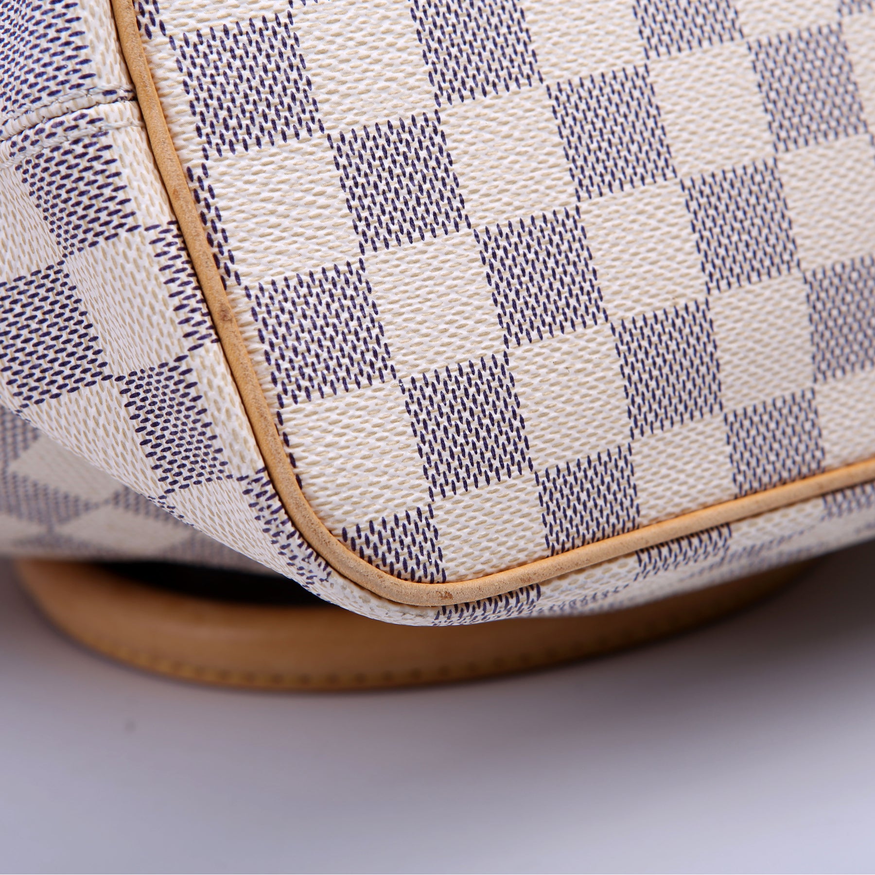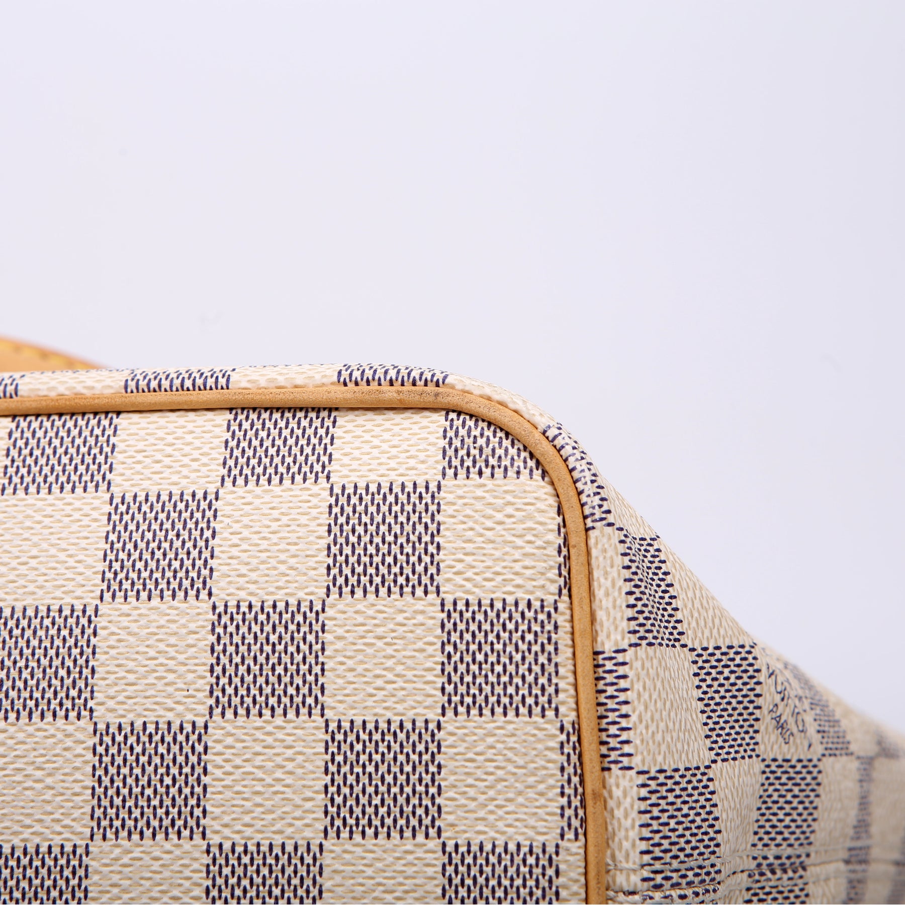 This pre-owned Saleya PM is guaranteed 100% authentic. The exterior is in the classic Louis Vuitton Damier Azur coated canvas.