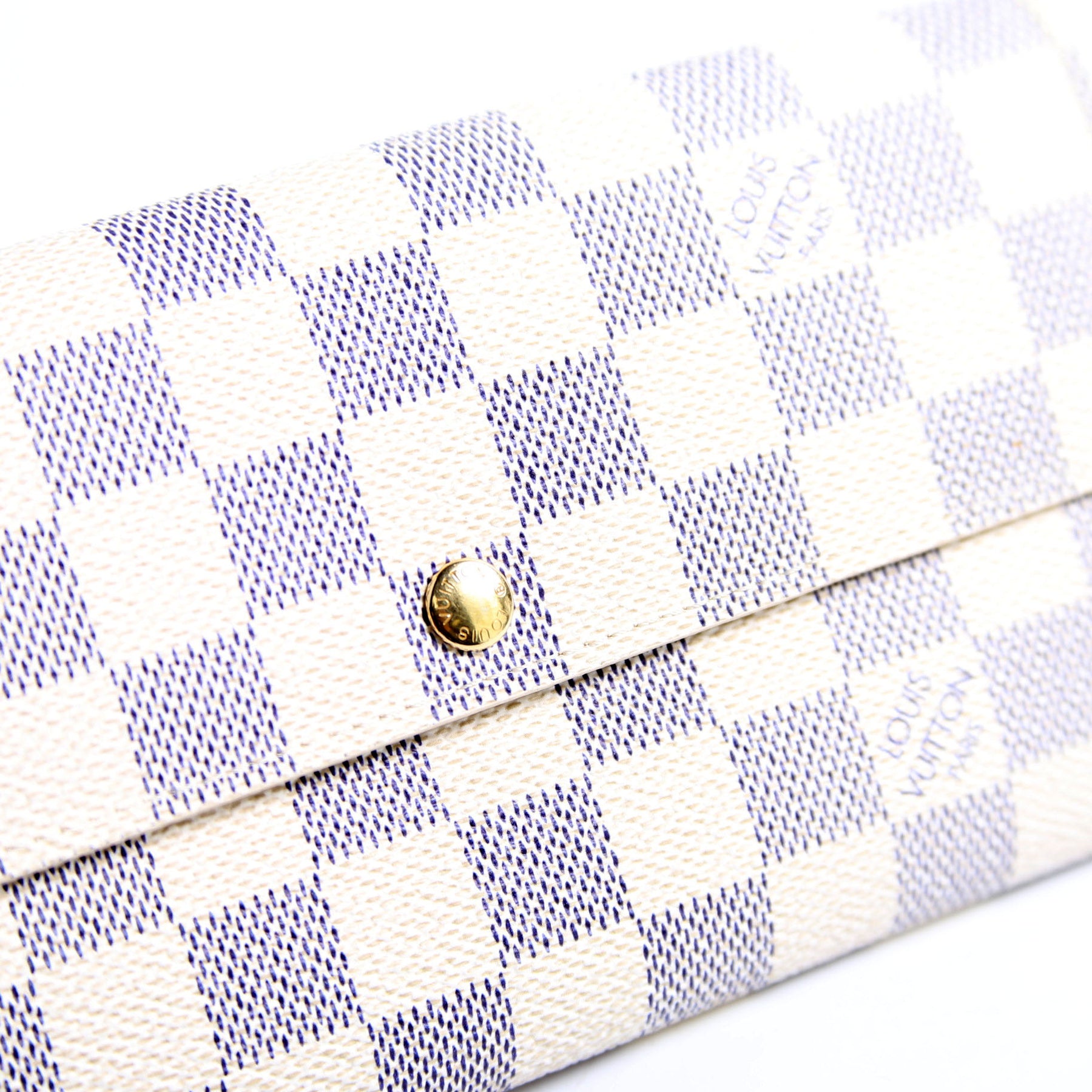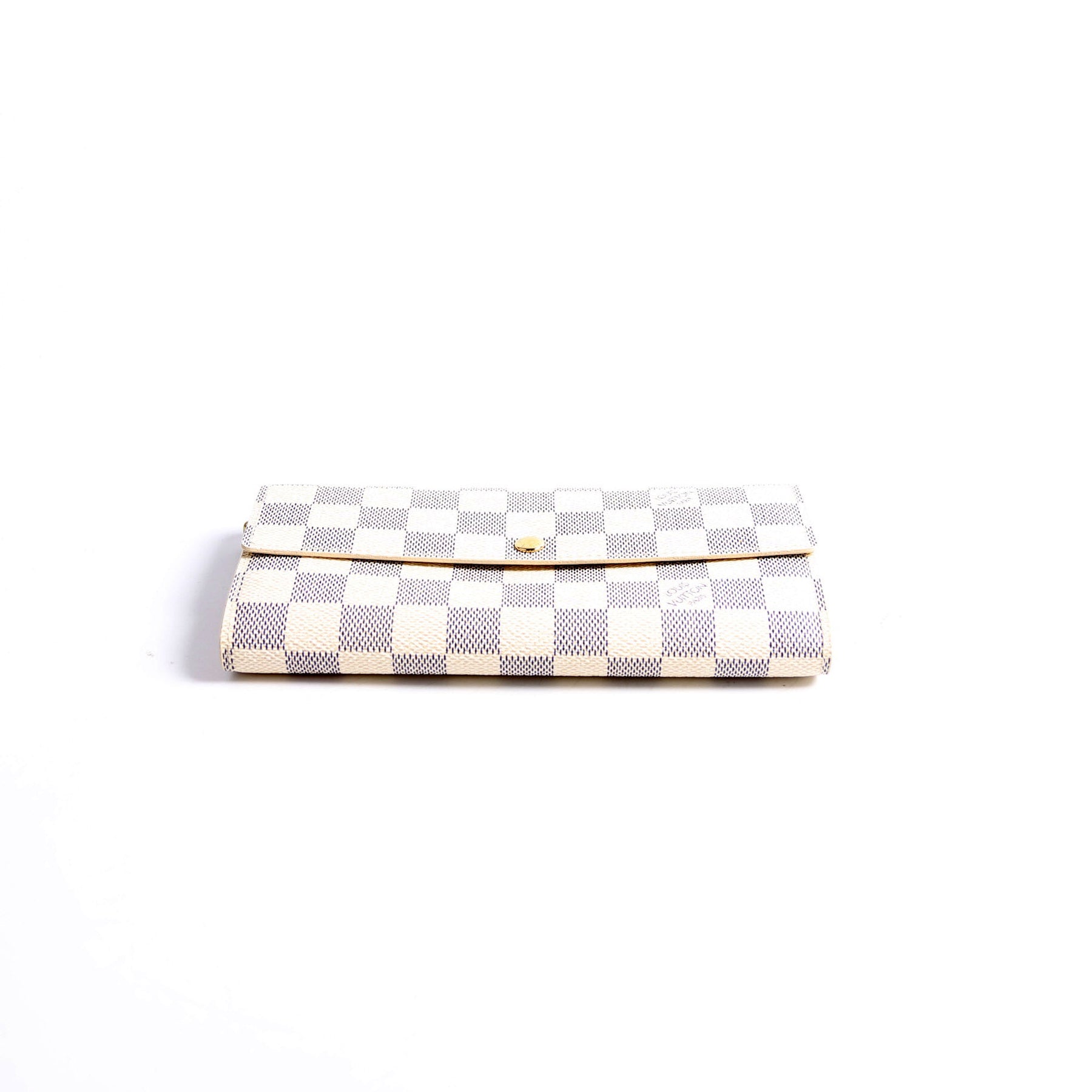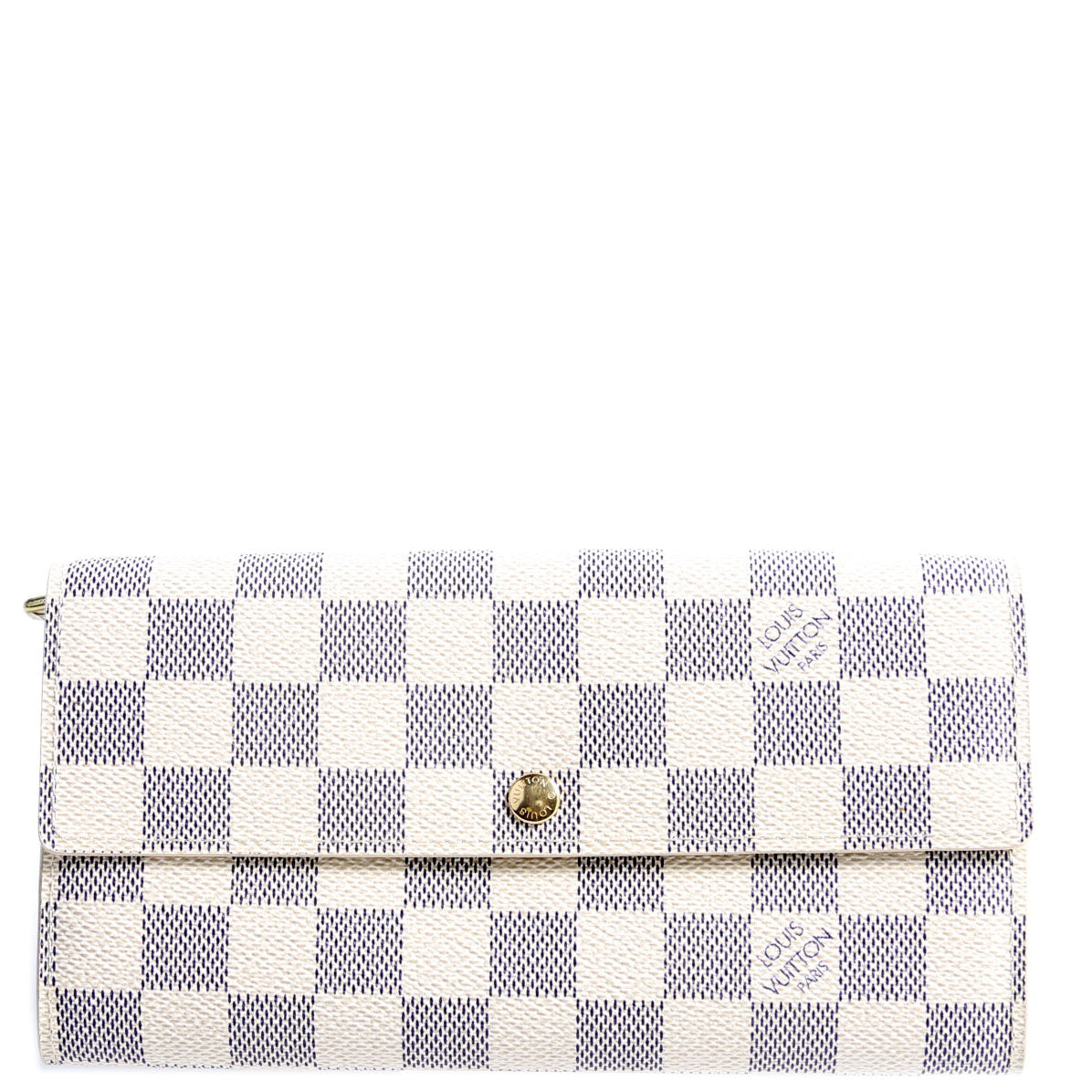 This pre-owned Louis Vuitton Sarah Wallet is guaranteed 100% authentic. The exterior is in the classic Louis Vuitton Damier Azur coated canvas.