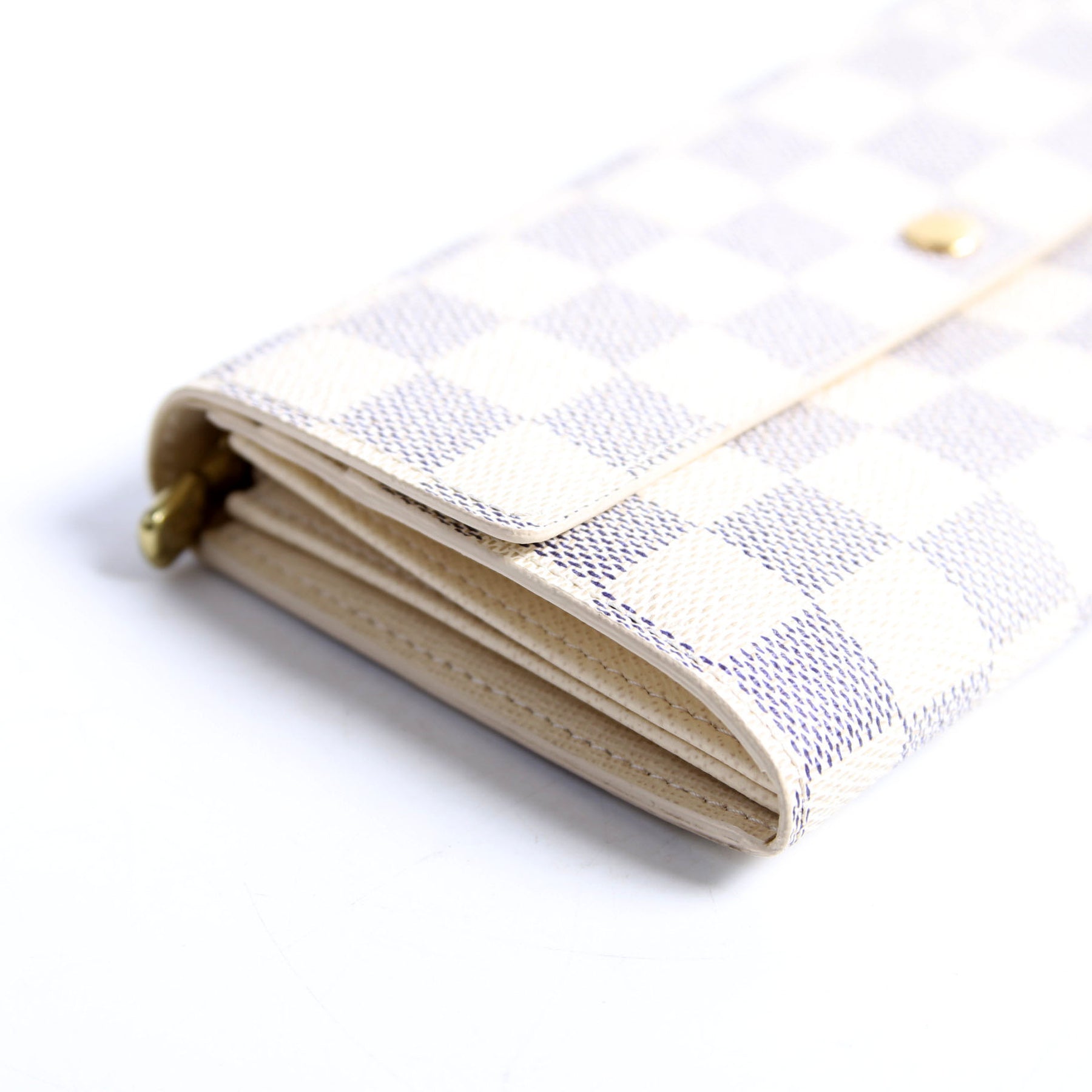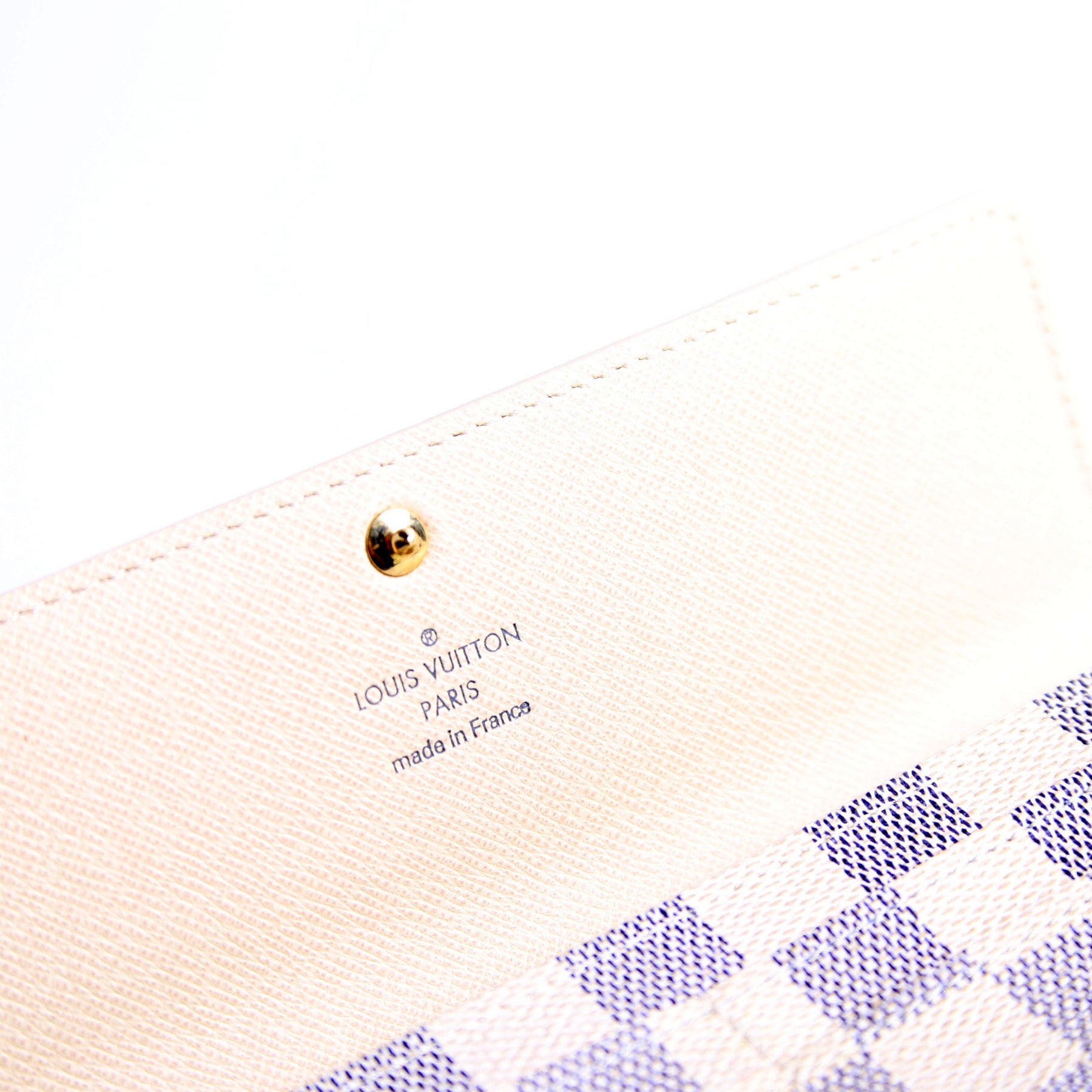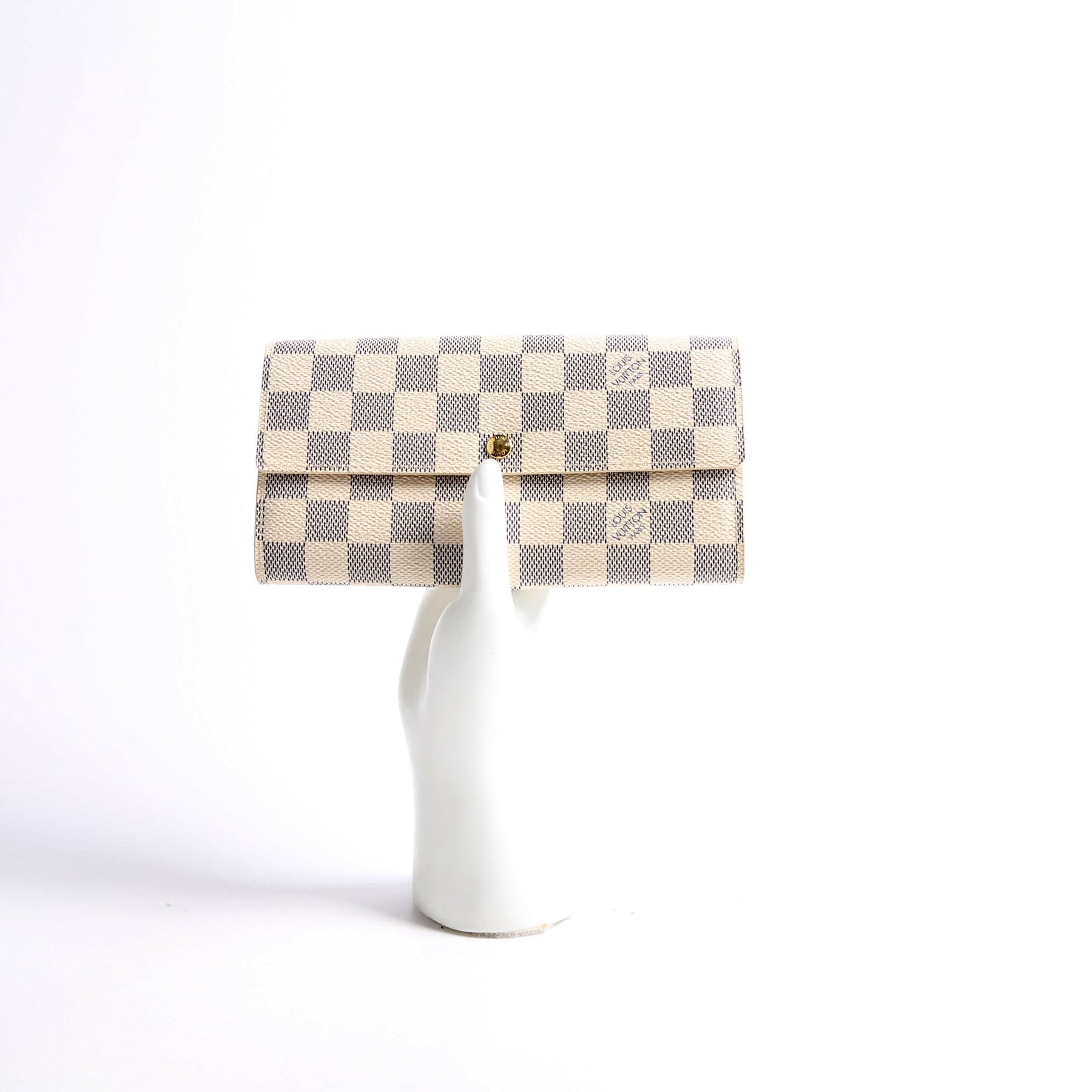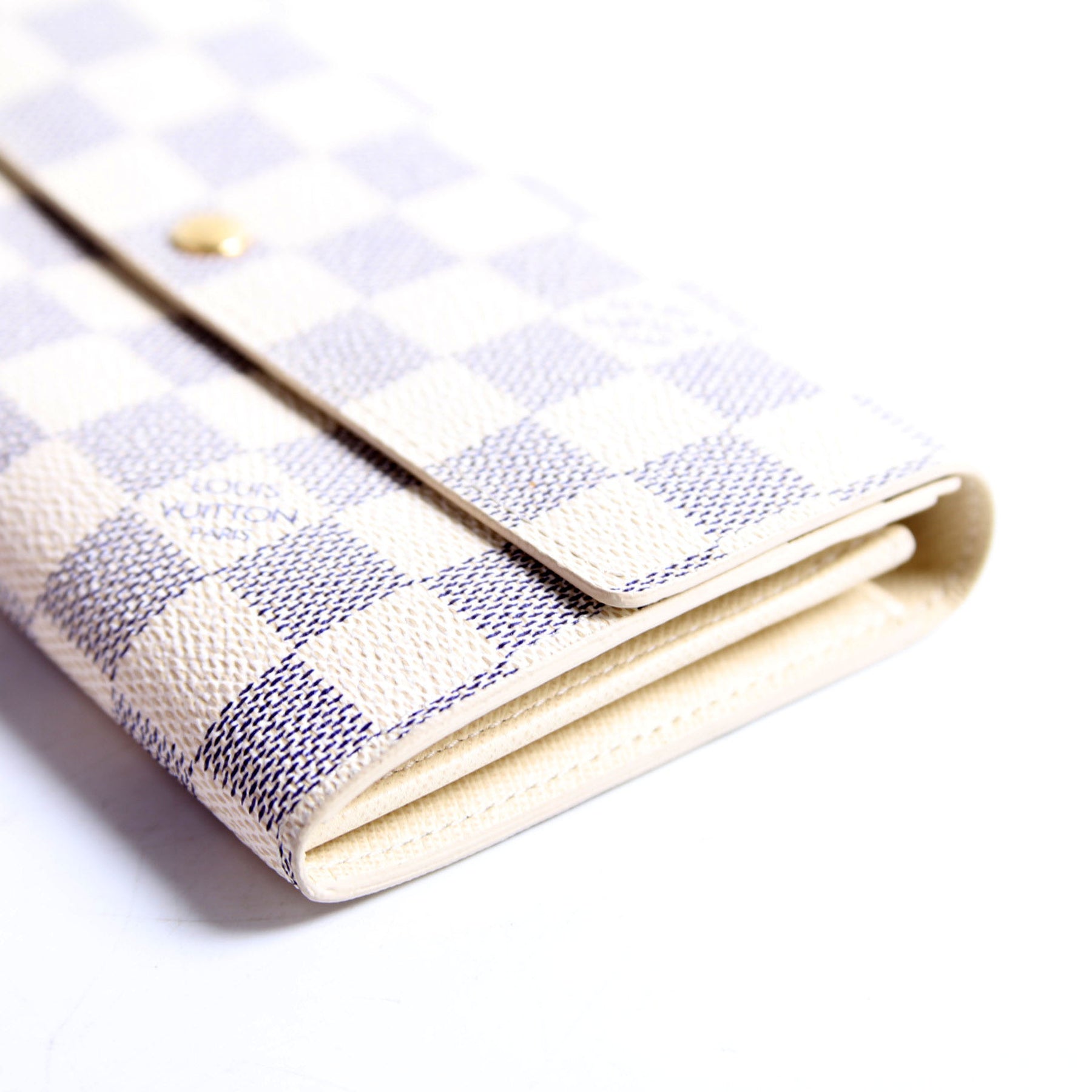This pre-owned Louis Vuitton Sarah Wallet is guaranteed 100% authentic. The exterior is in the classic Louis Vuitton Damier Azur coated canvas.