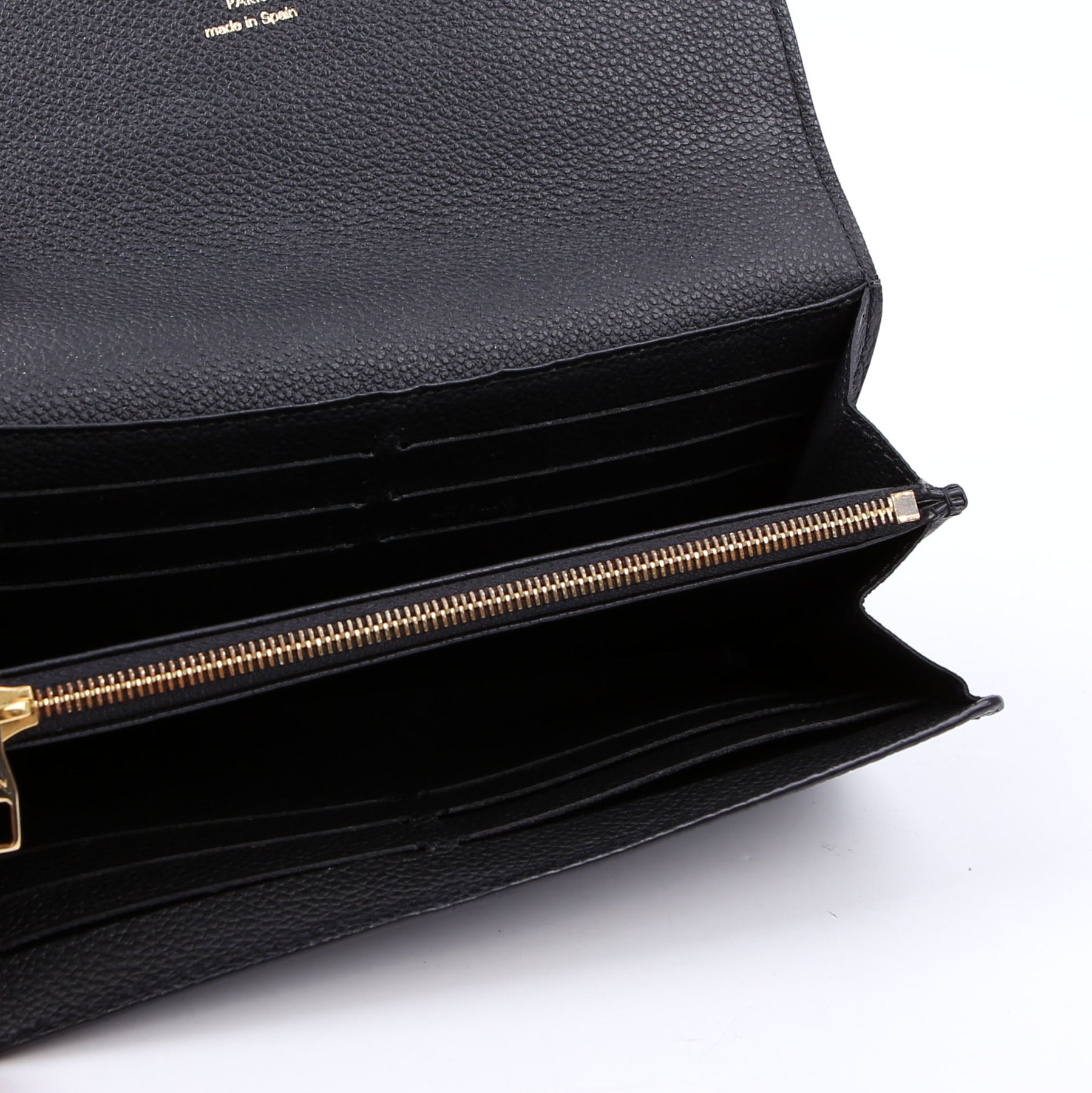 Interior: The interior is clean and free of rips or tears. The interior features sixteen card slots, one zip coin pouch, and three bill slots.