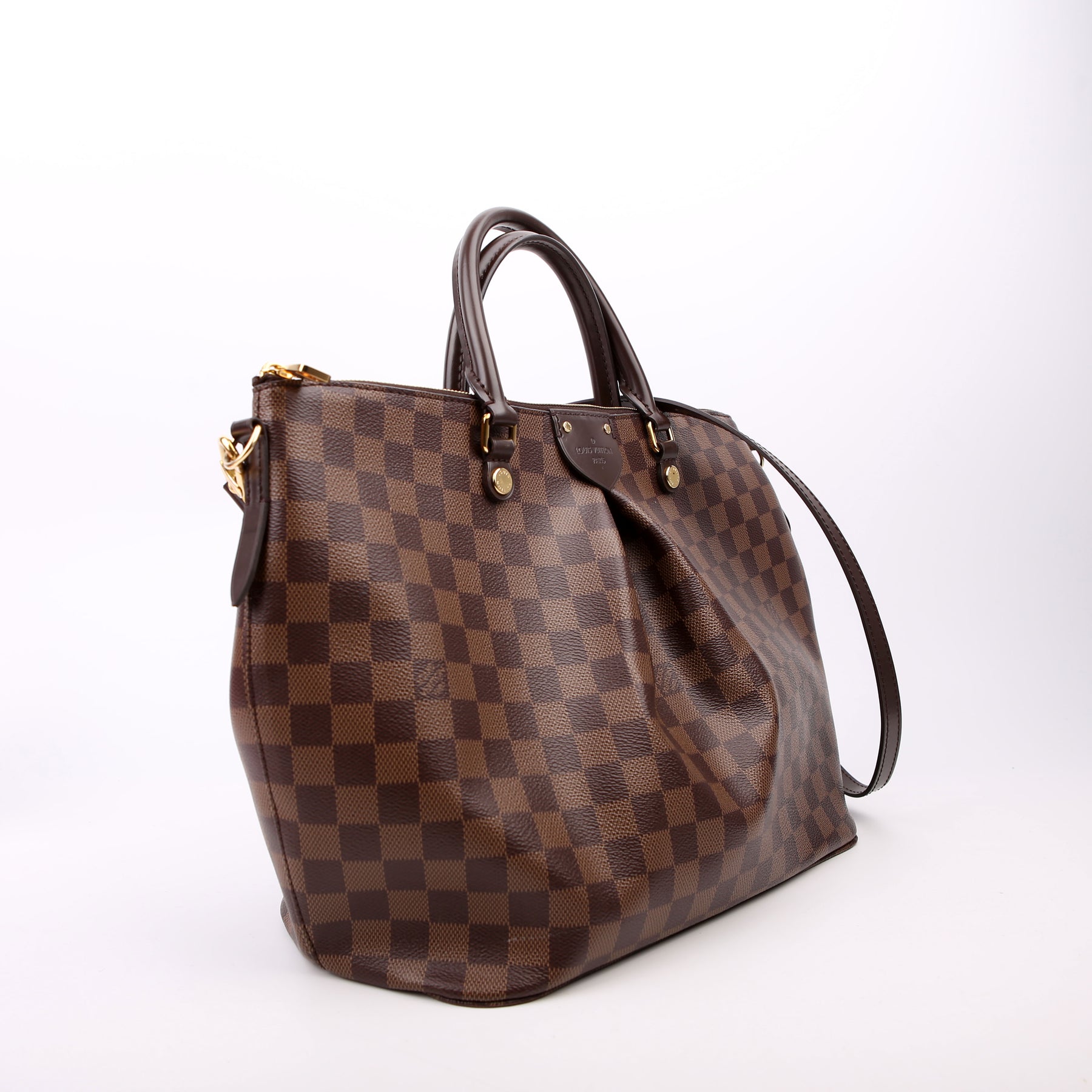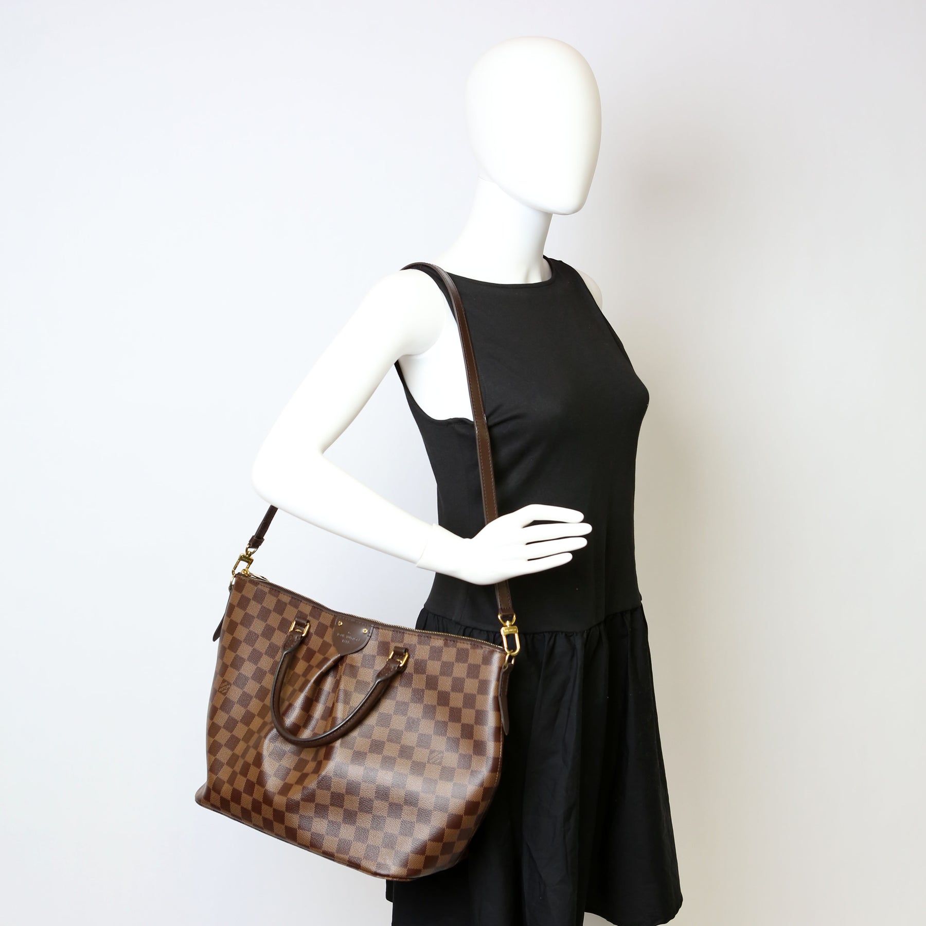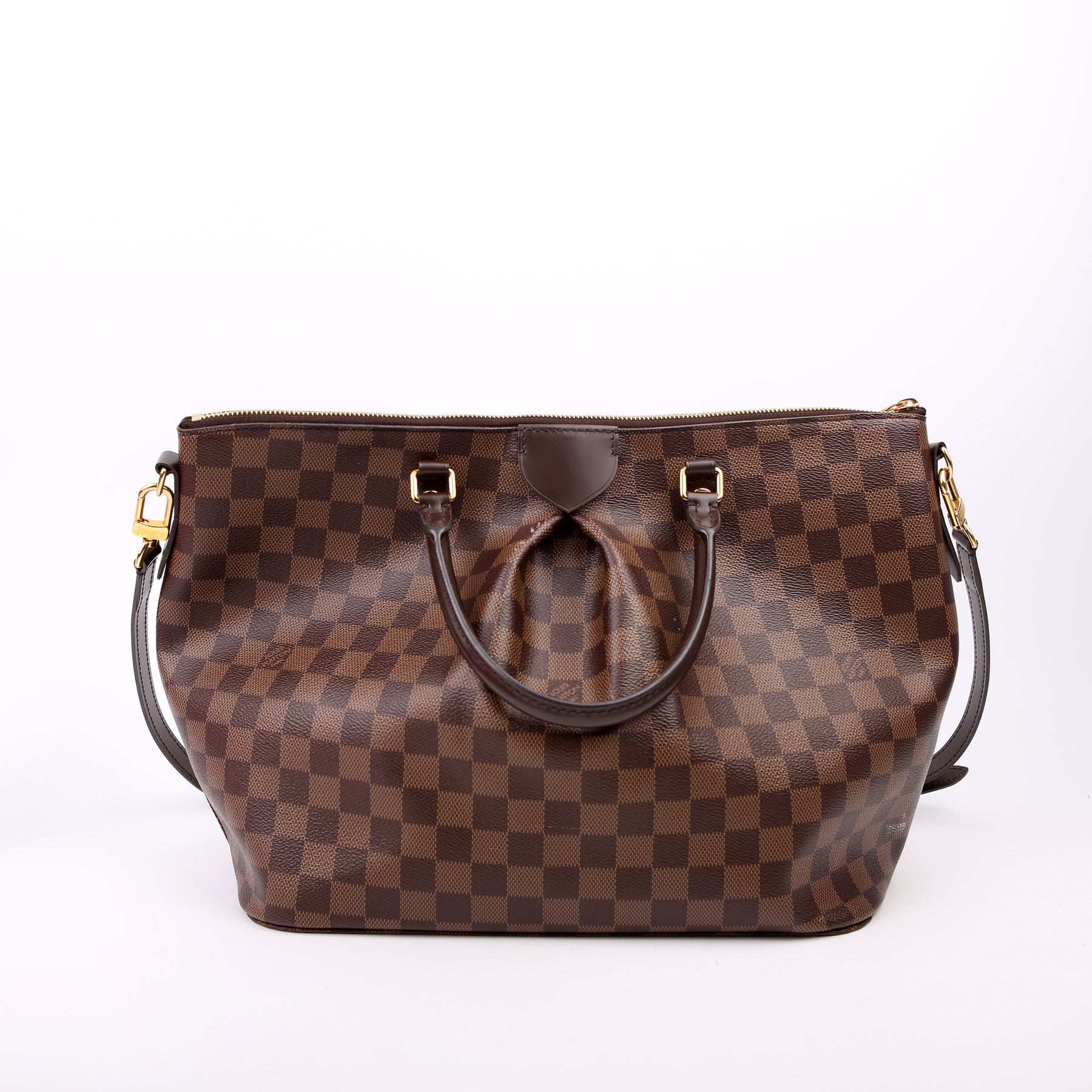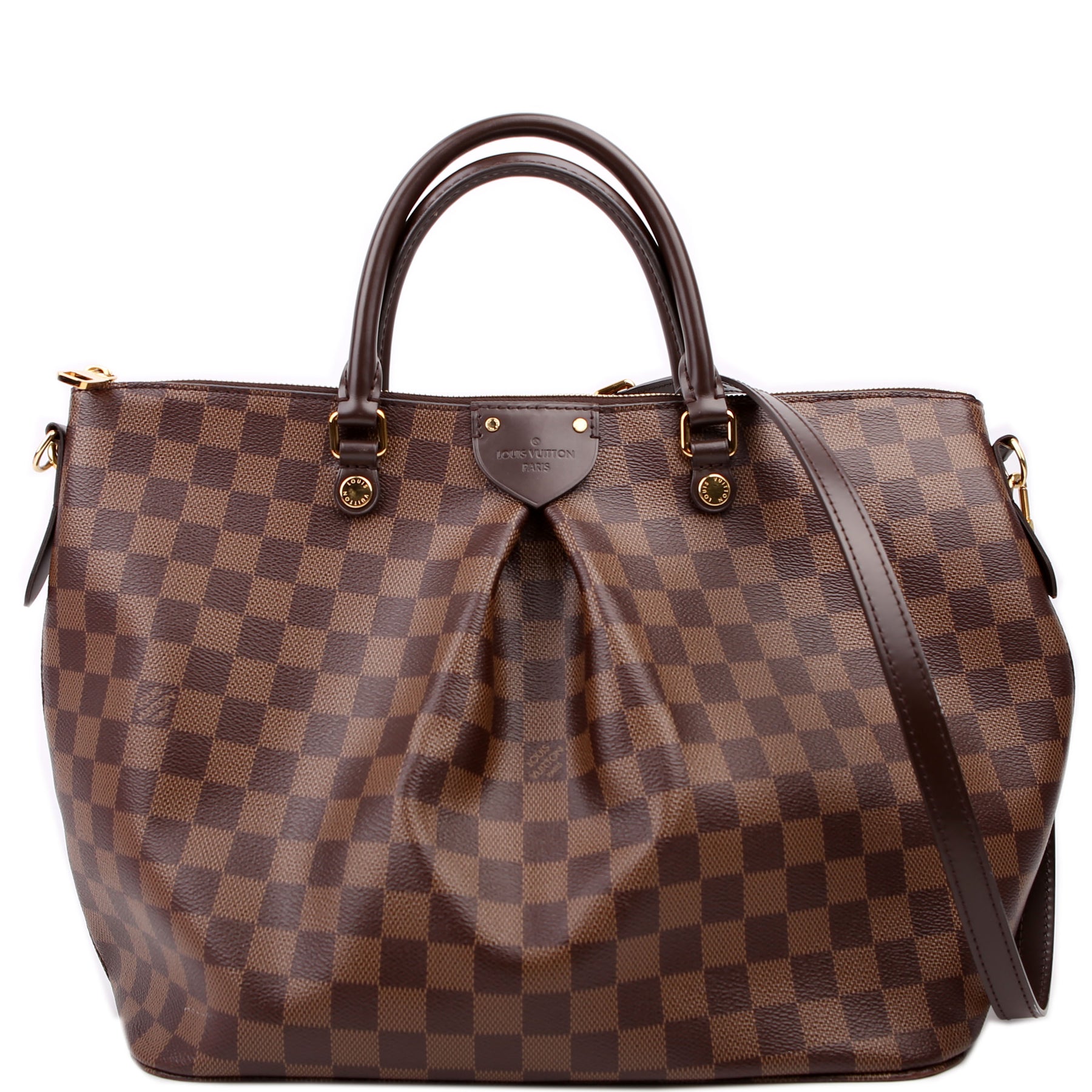 This pre-owned Louis Vuitton Siena GM is guaranteed 100% authentic. The exterior is in the classic Louis Vuitton Damier Ebene coated canvas.