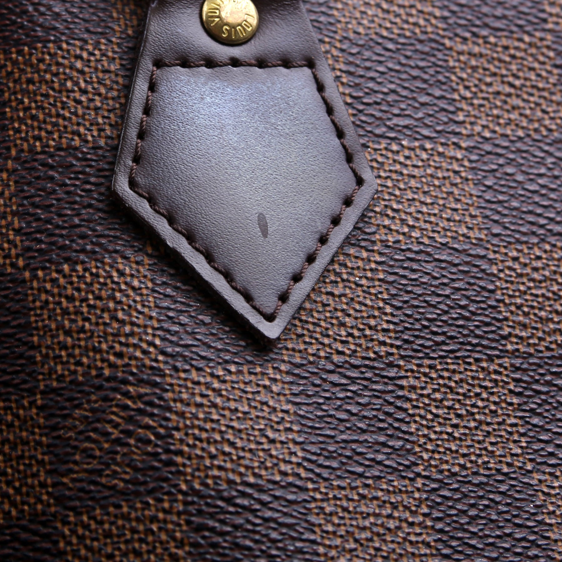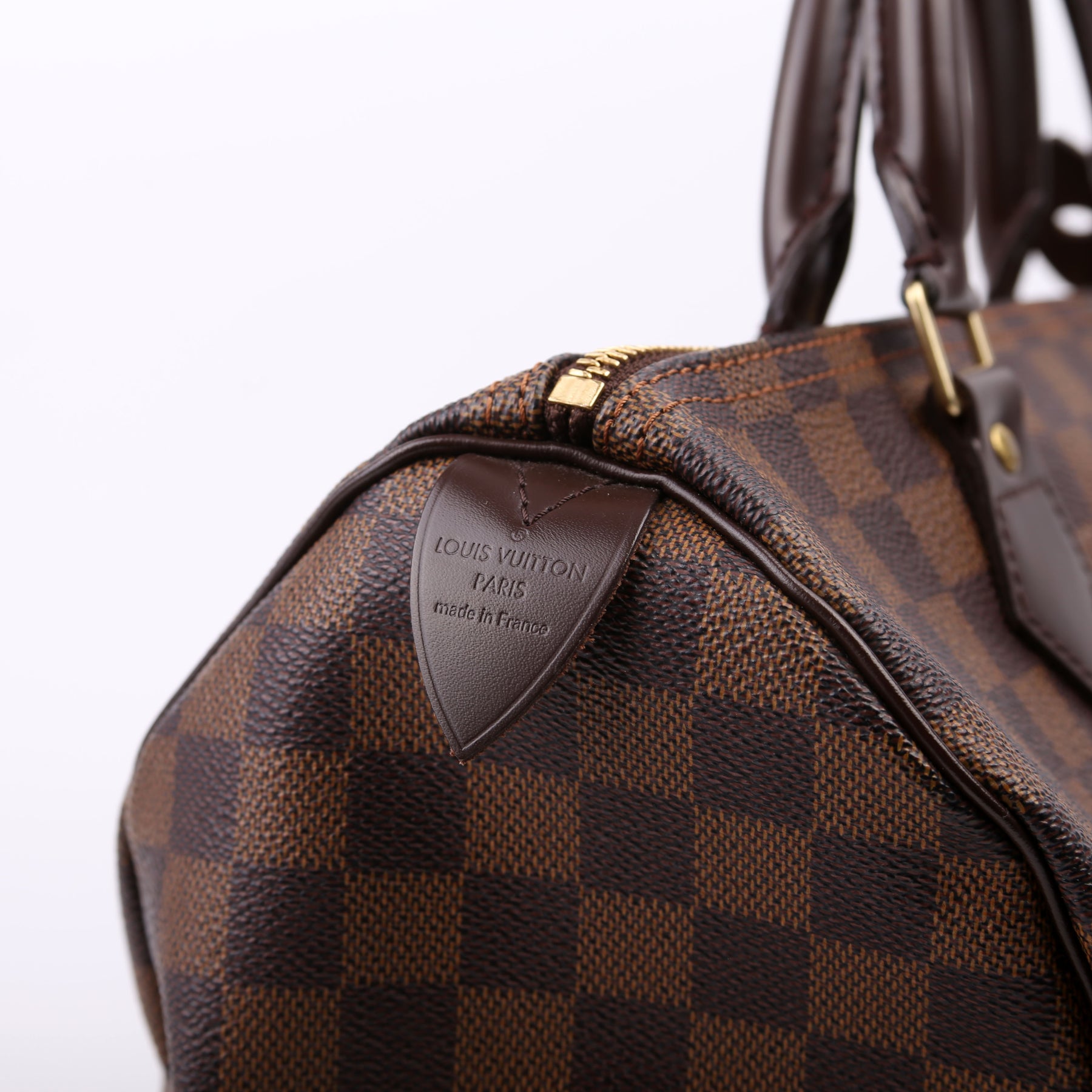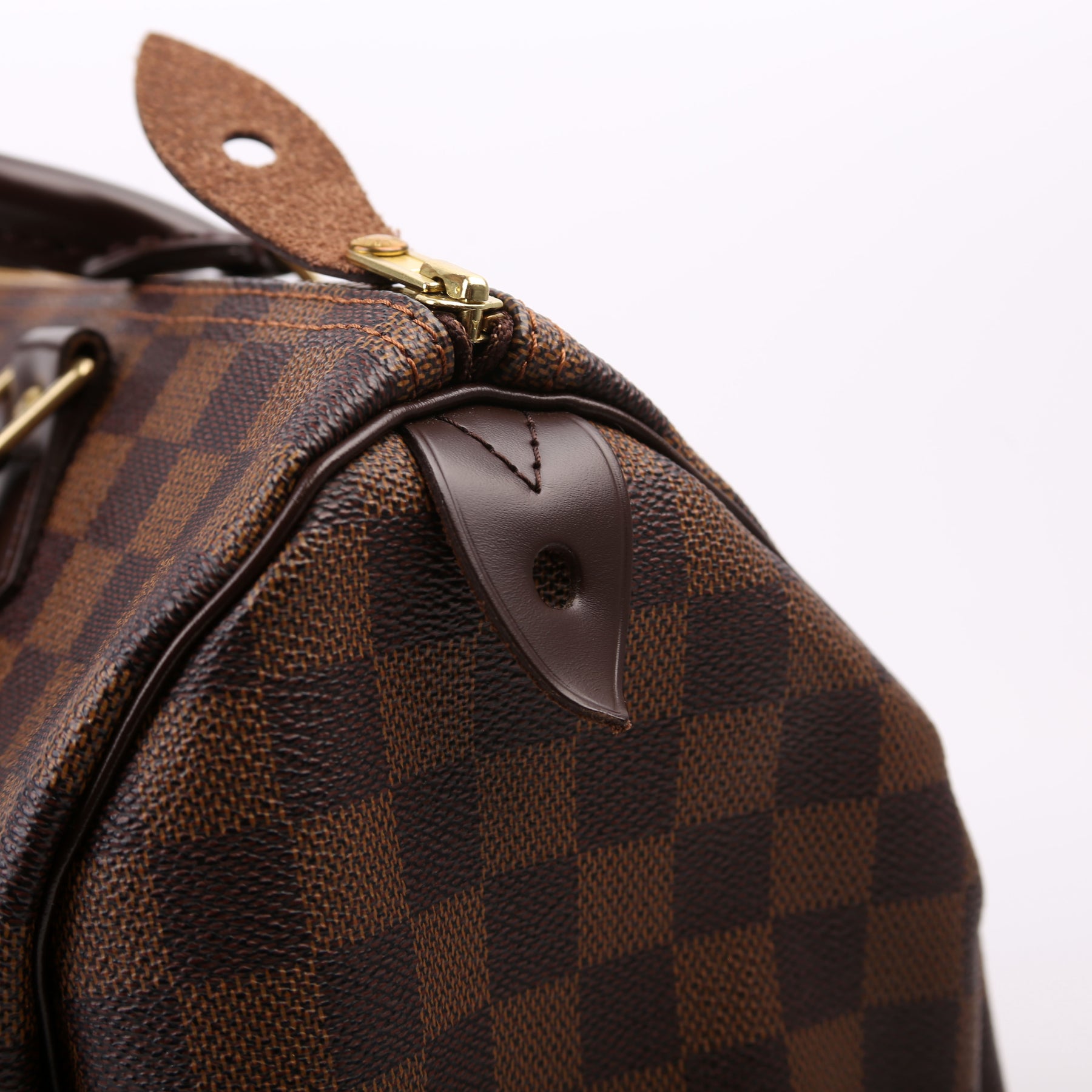 This pre-owned Louis Vuitton Speedy 30 is guaranteed 100% authentic. The exterior is in the classic Louis Vuitton Damier Ebene coated canvas.