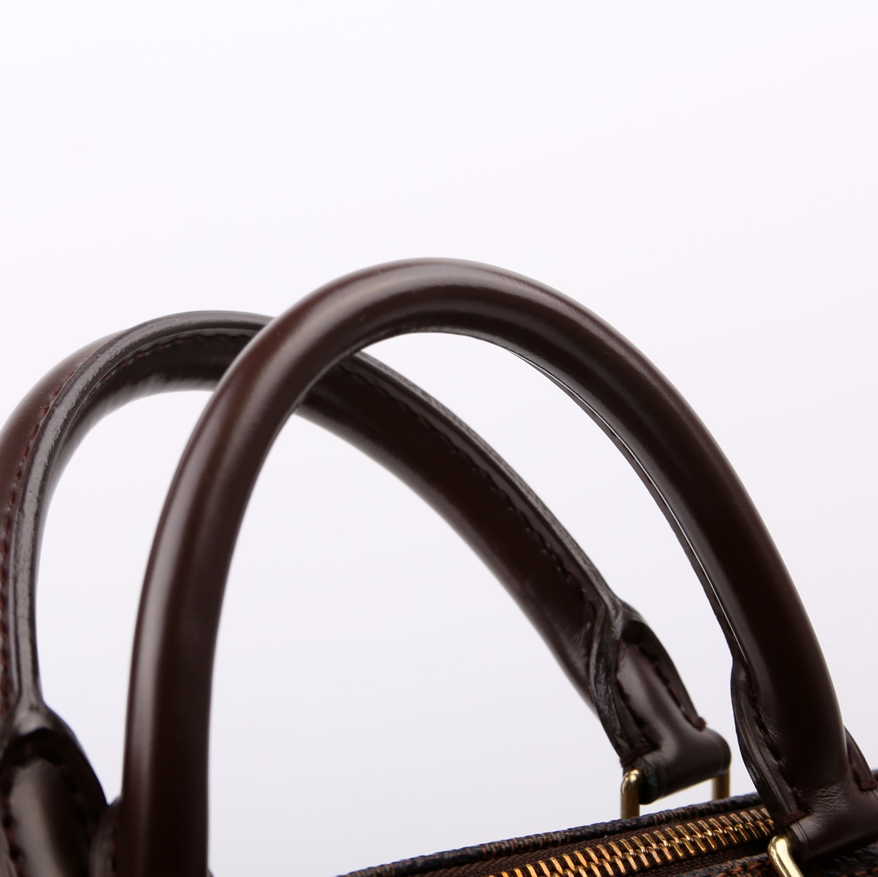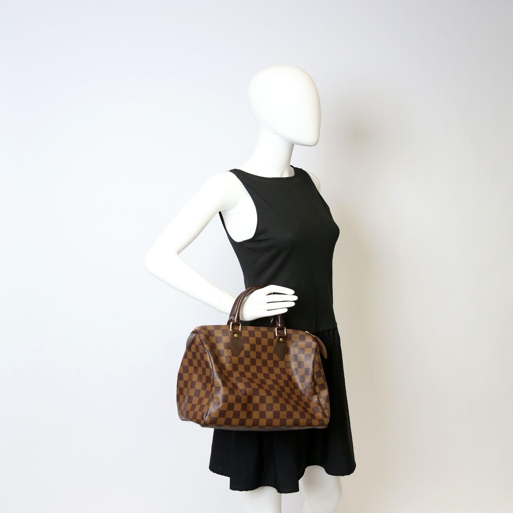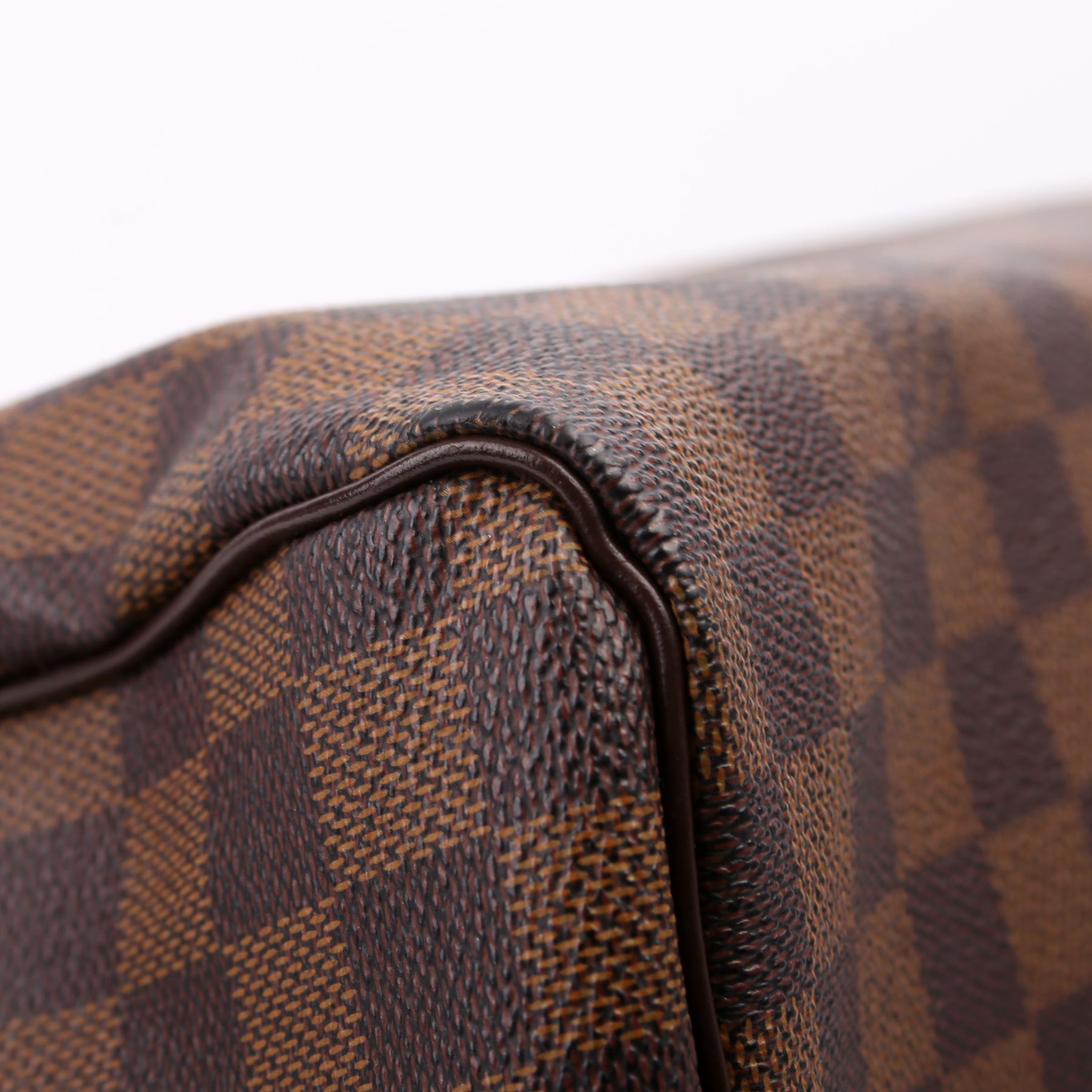 This pre-owned Louis Vuitton Speedy 30 is guaranteed 100% authentic. The exterior is in the classic Louis Vuitton Damier Ebene coated canvas.