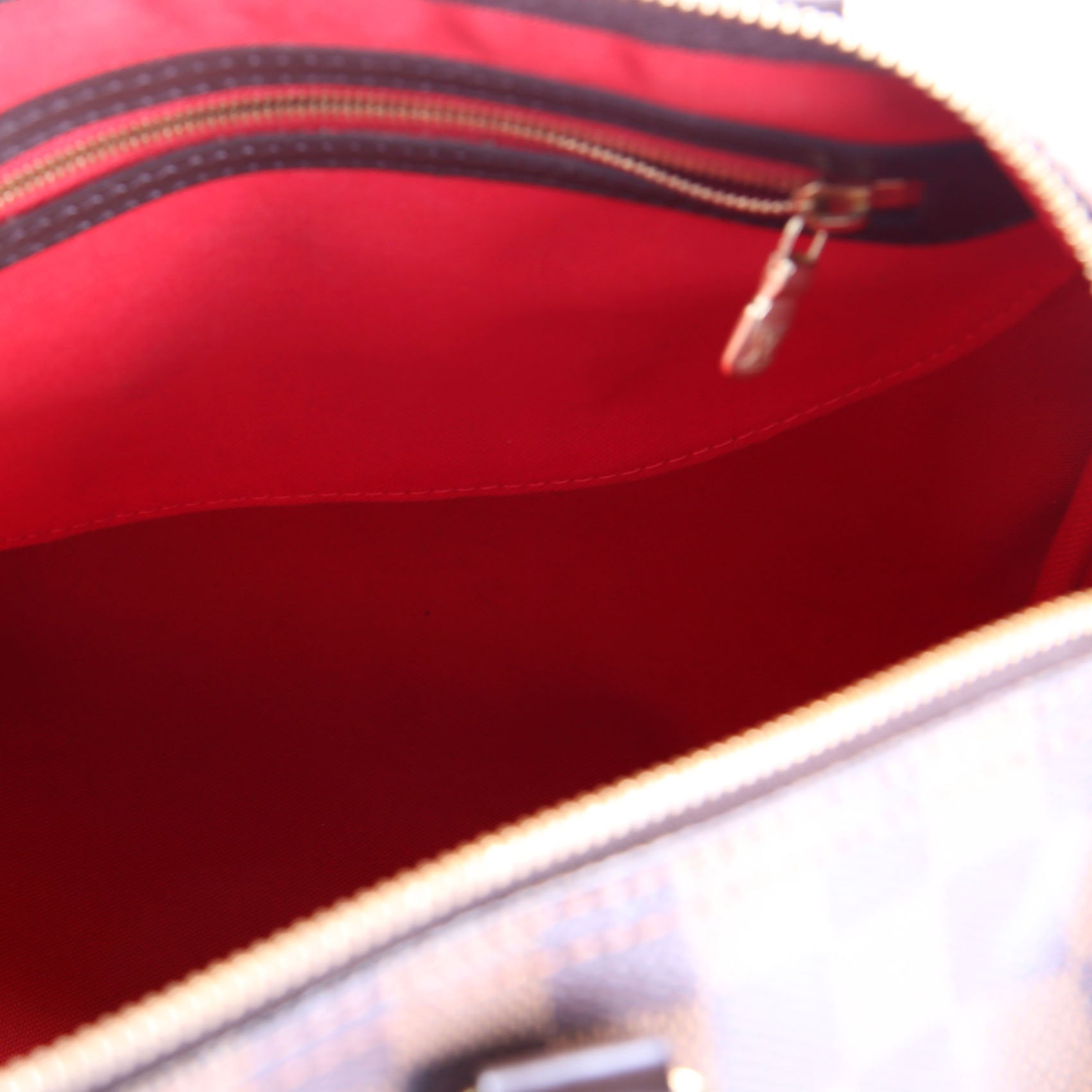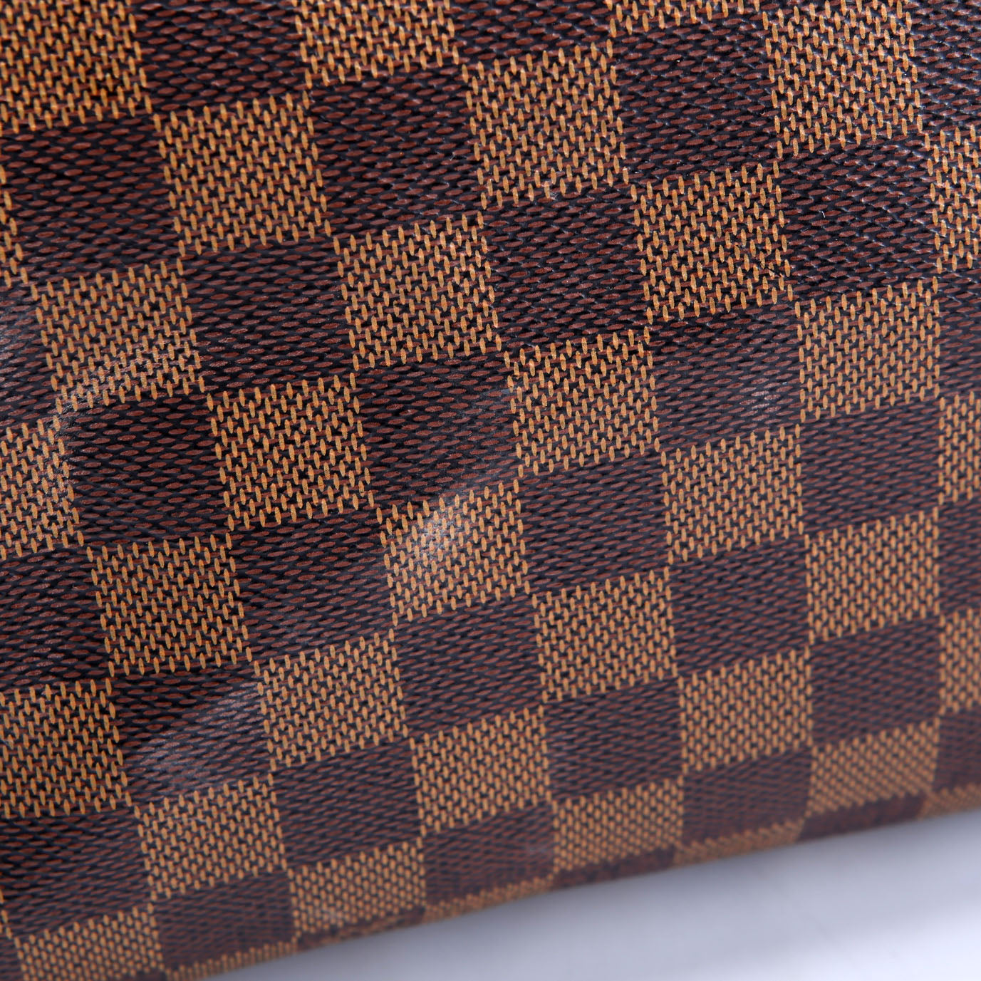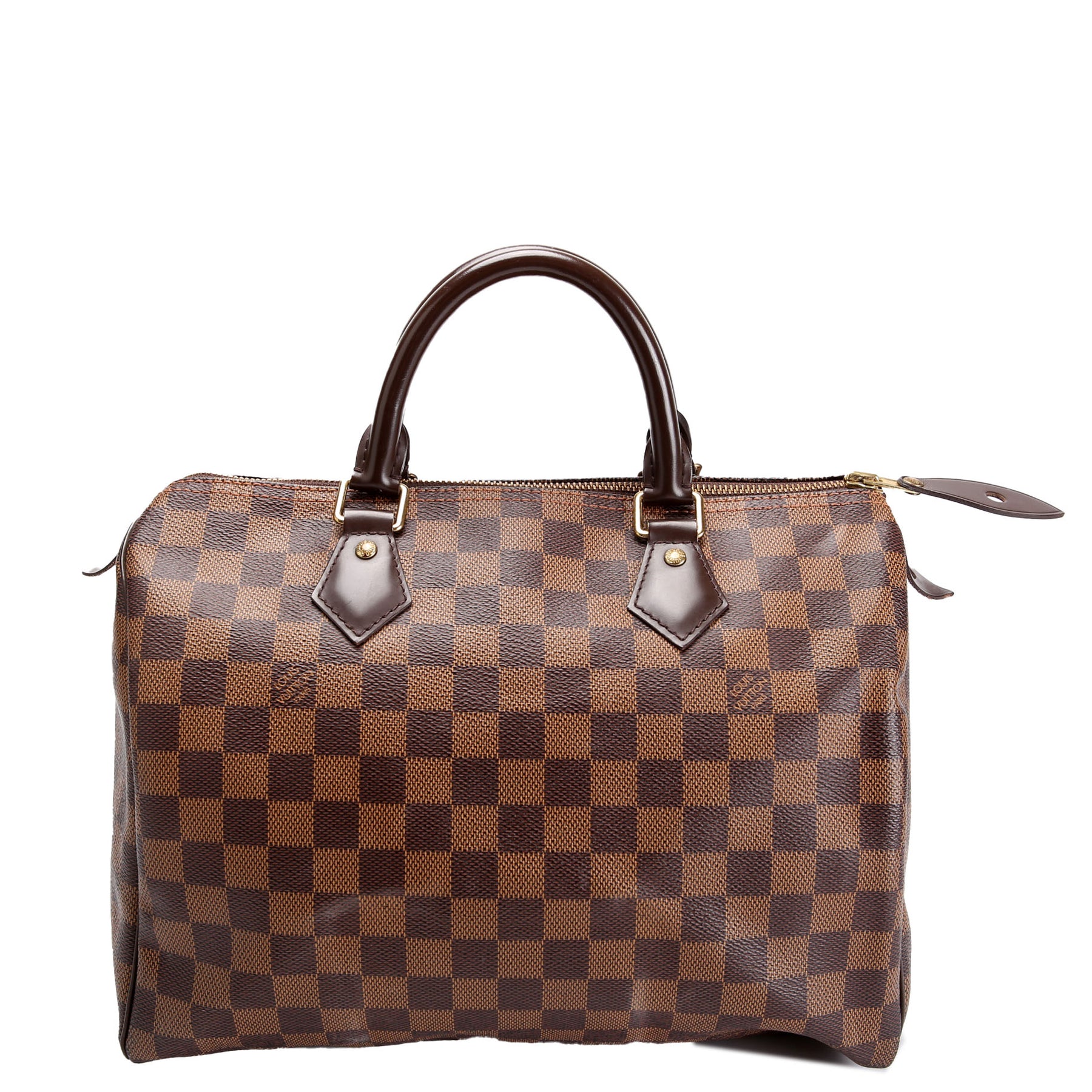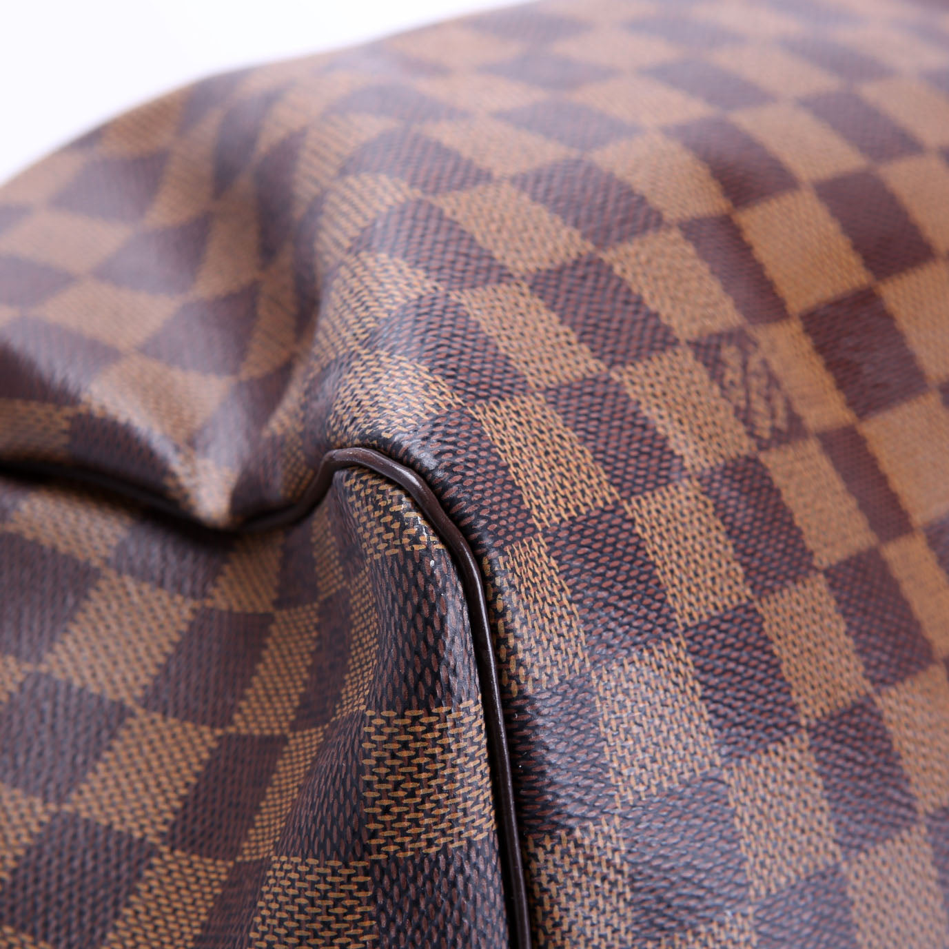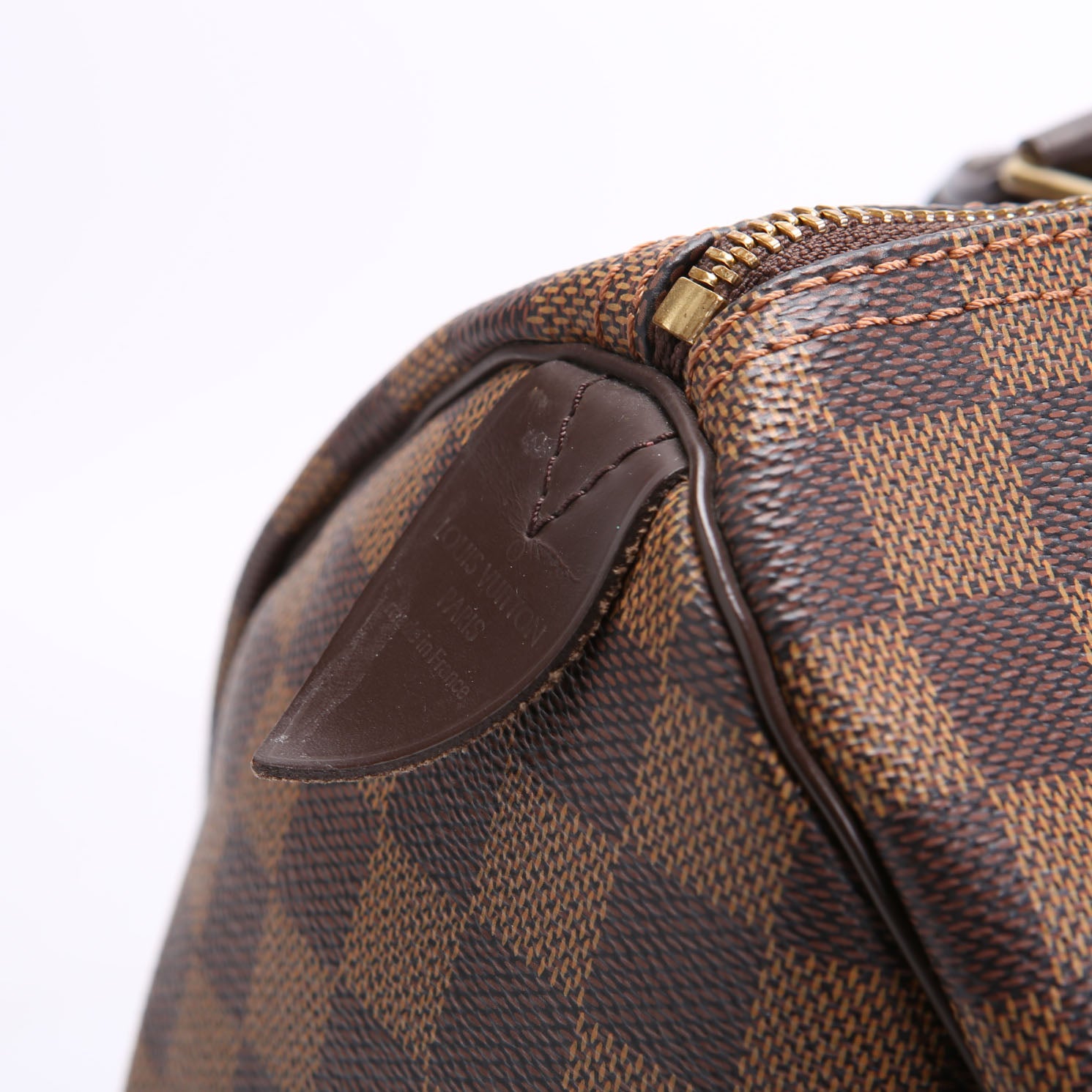 This pre-owned Louis Vuitton Speedy 30 is guaranteed 100% authentic. The exterior is in the classic Louis Vuitton Damier Ebene coated canvas.