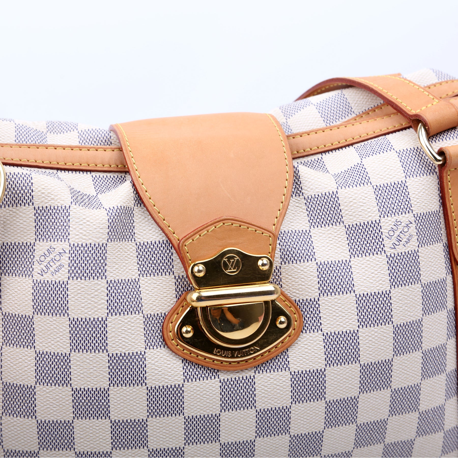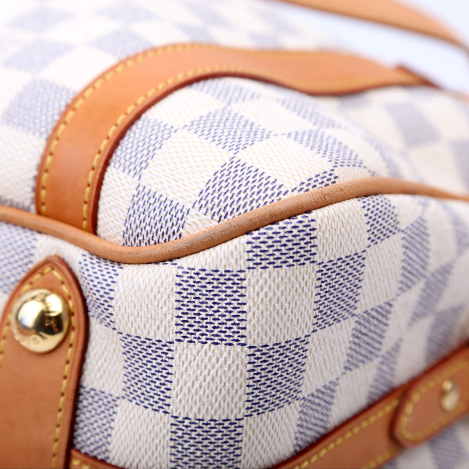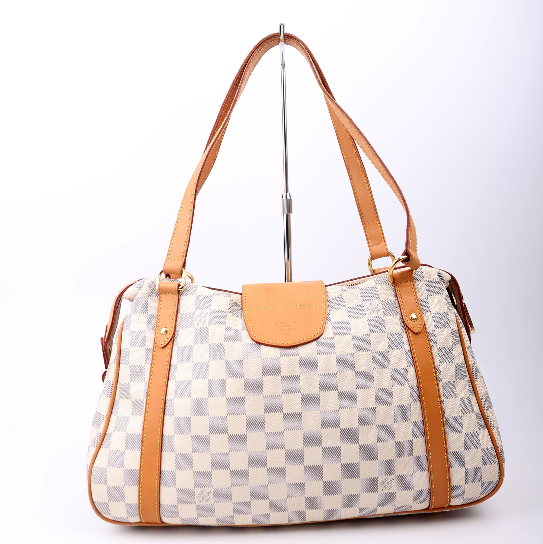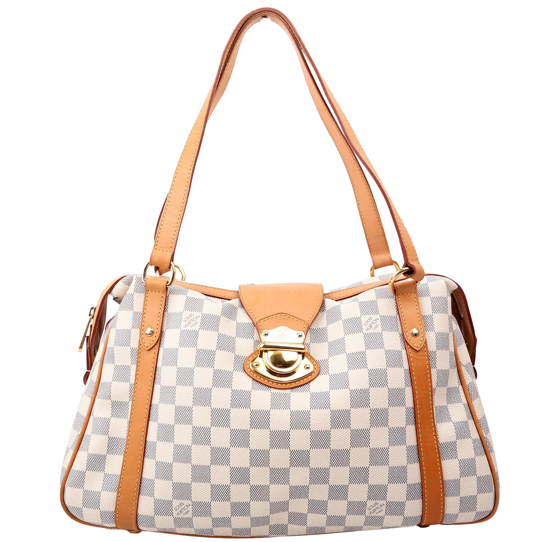 This pre-owned Louis Vuitton Stresa PM is guaranteed 100% authentic. The exterior is in the classic Louis Vuitton Damier Azur coated canvas.