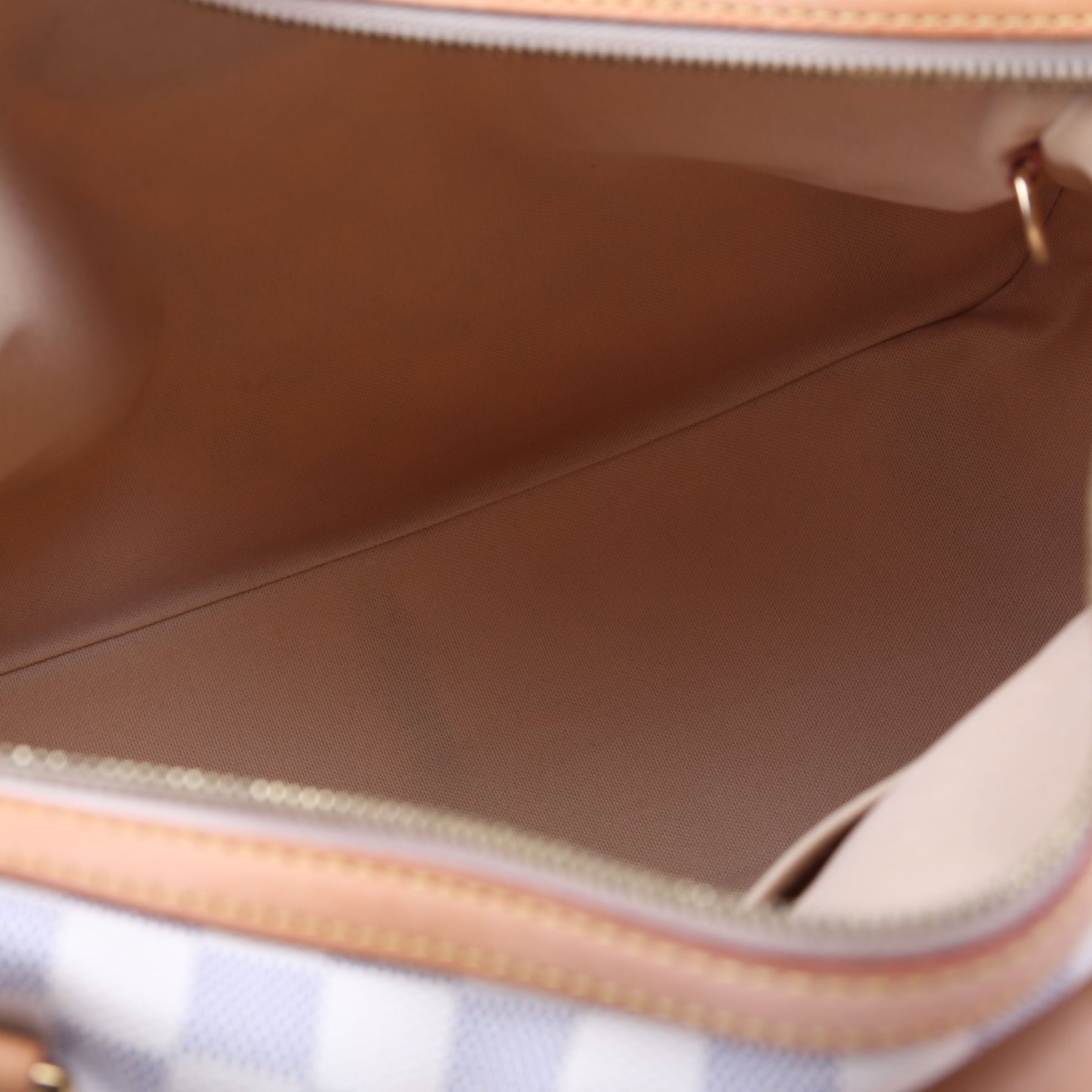 Exterior: The exterior coated canvas is free of any rips or cracks. The corners and leather details show minor wear and discoloration throughout.