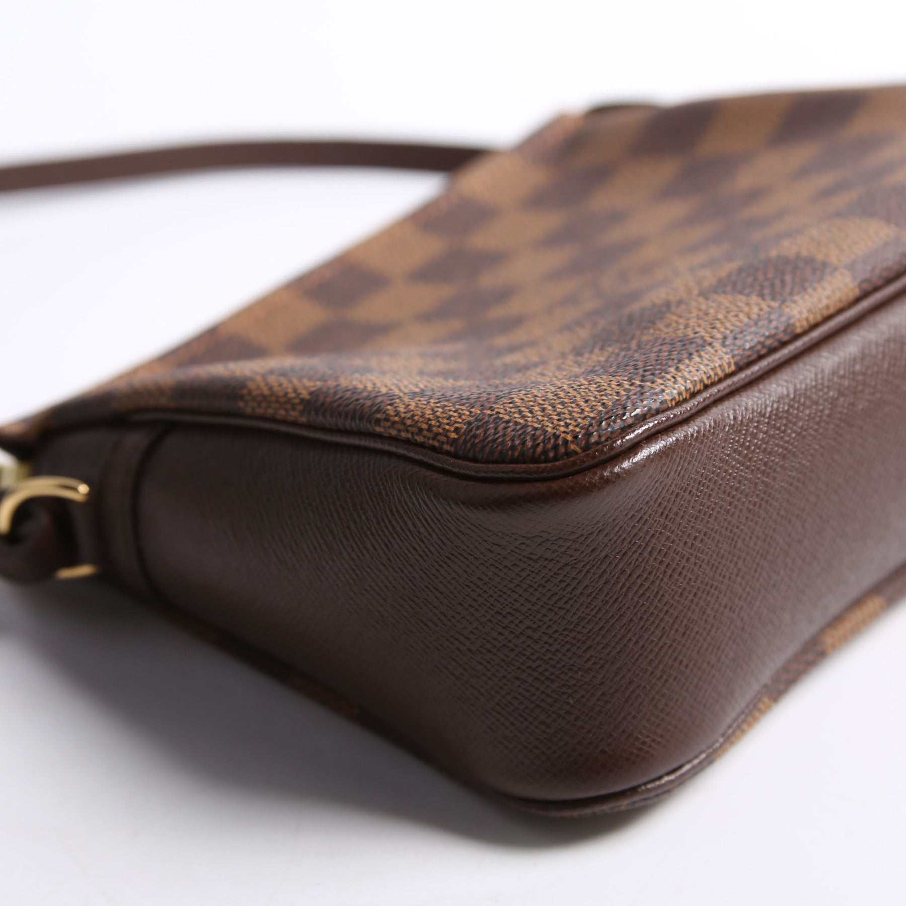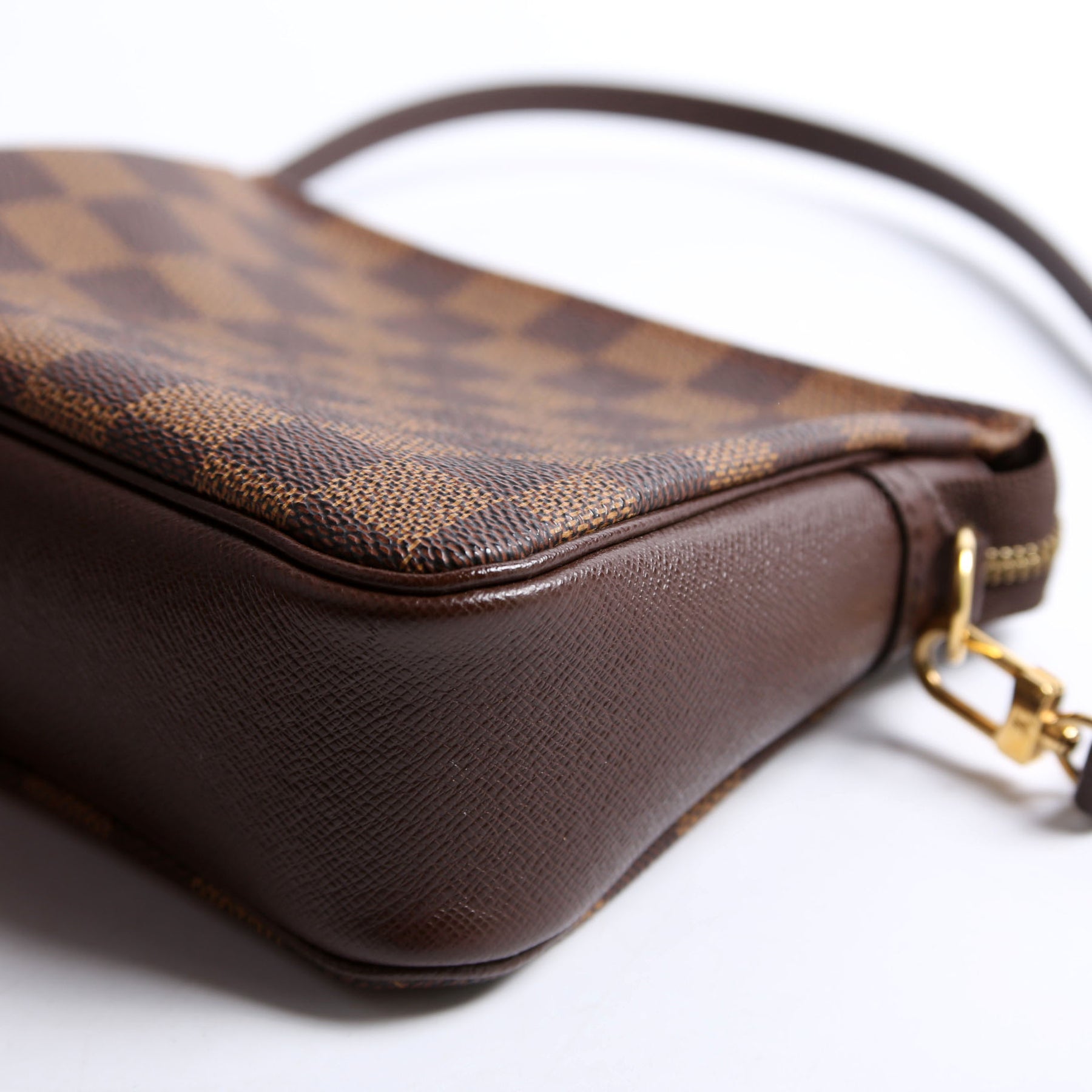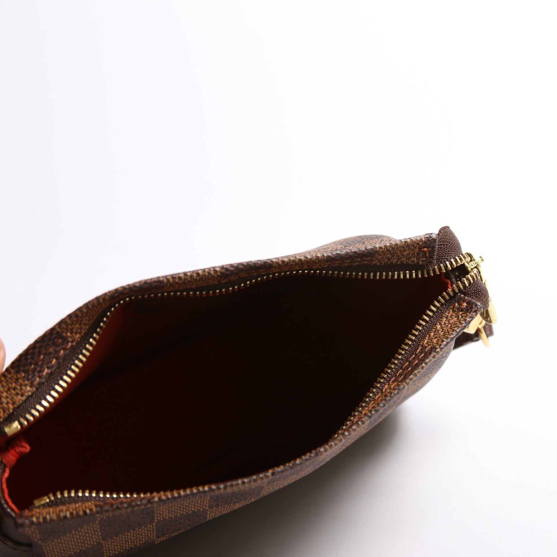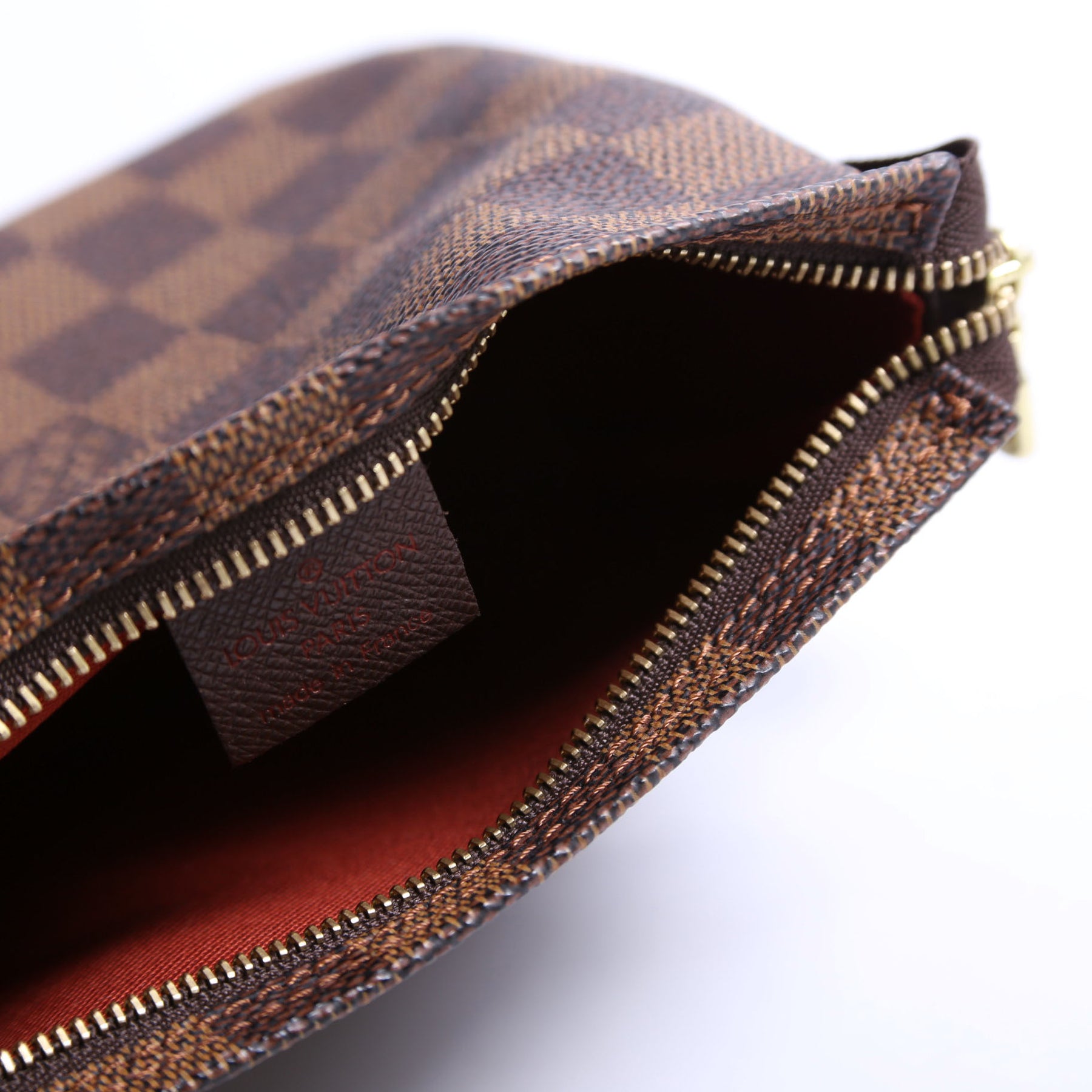 This pre-owned Louis Vuitton Trousse Makeup Pouch is guaranteed 100% authentic. The exterior is in the classic Louis Vuitton Damier Ebene coated canvas.