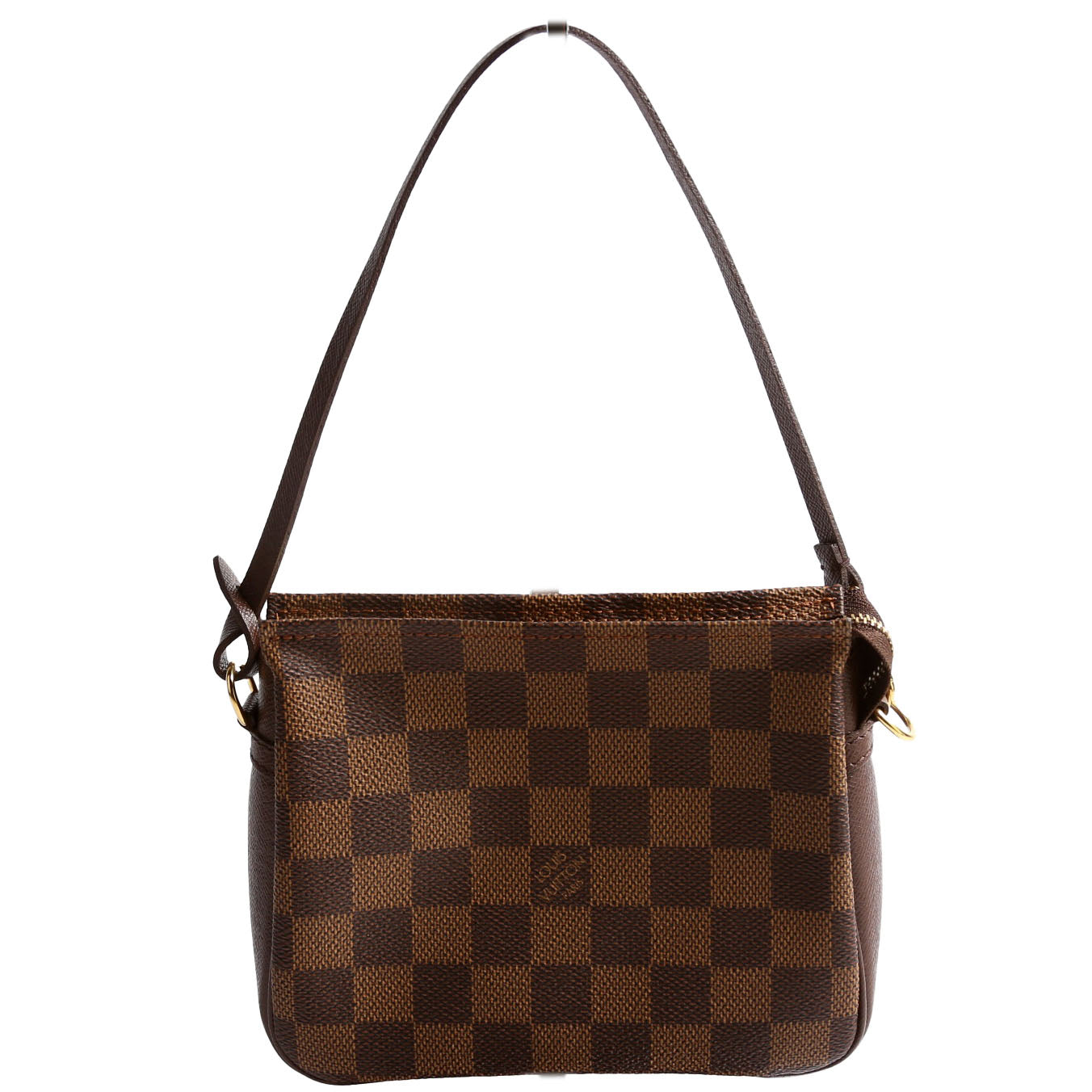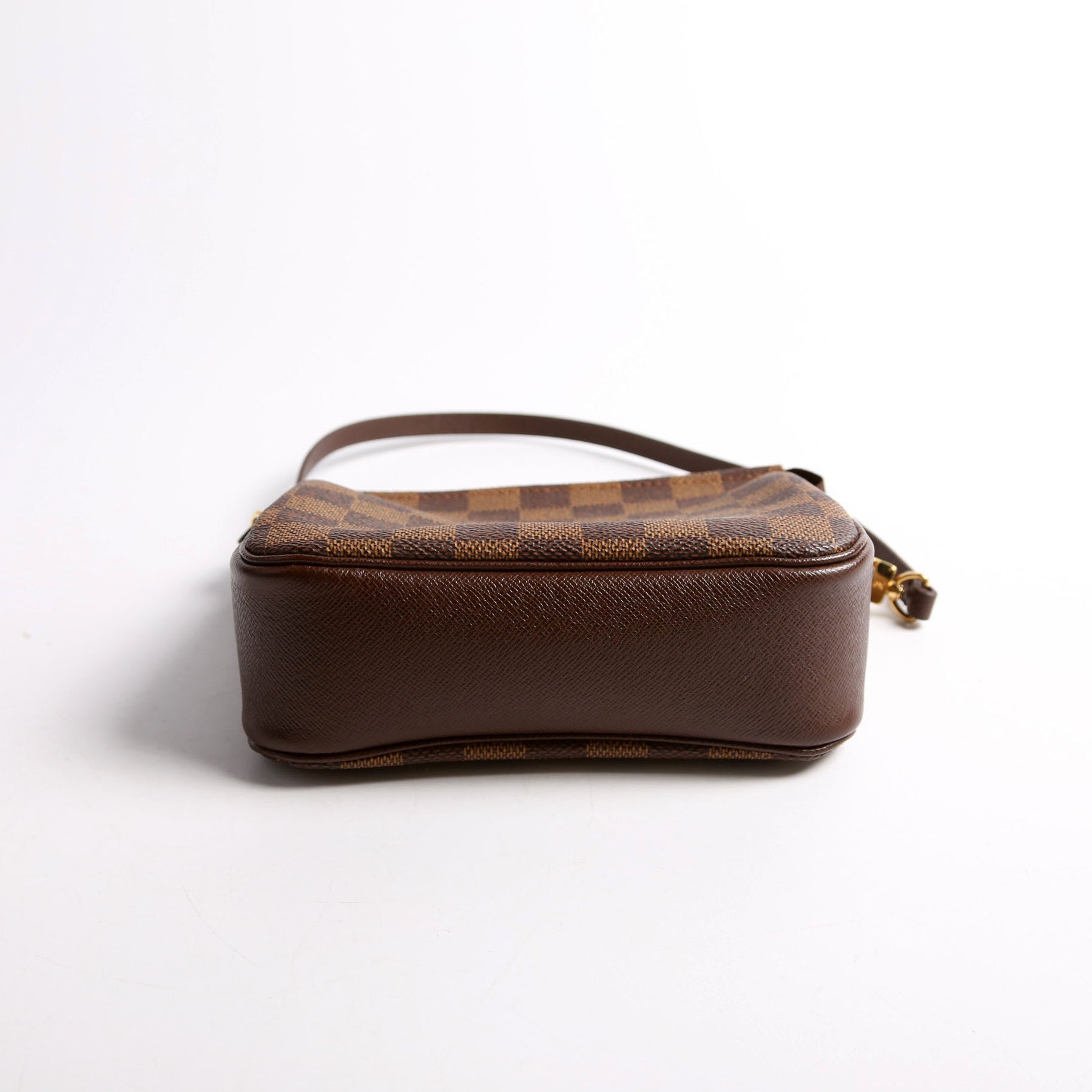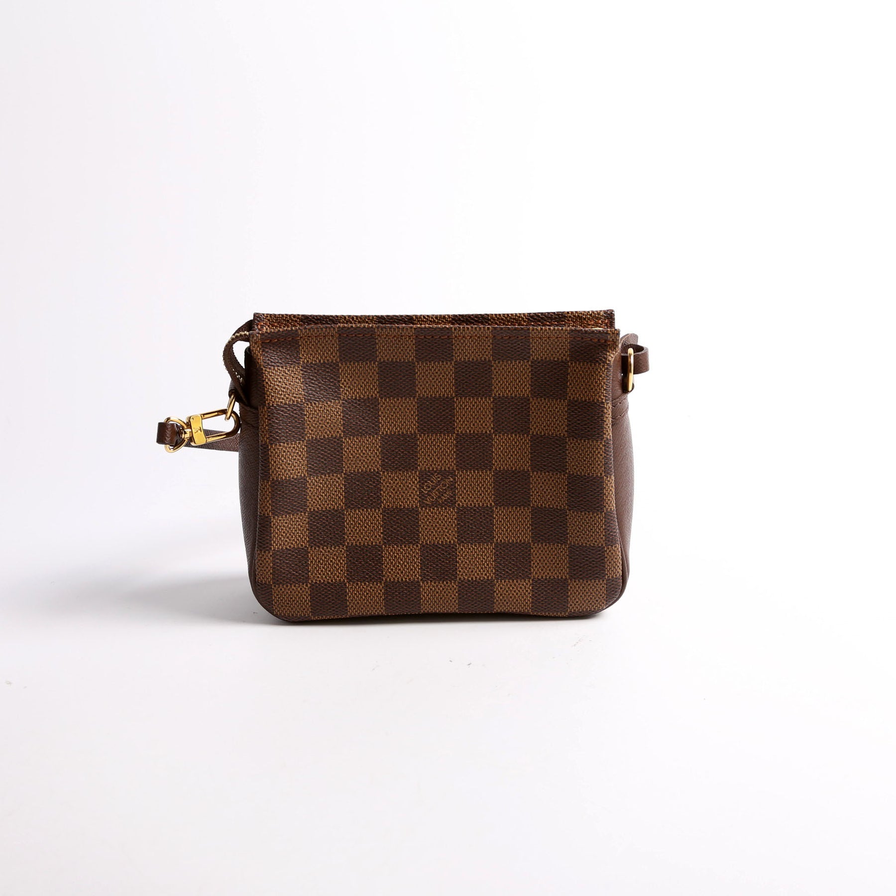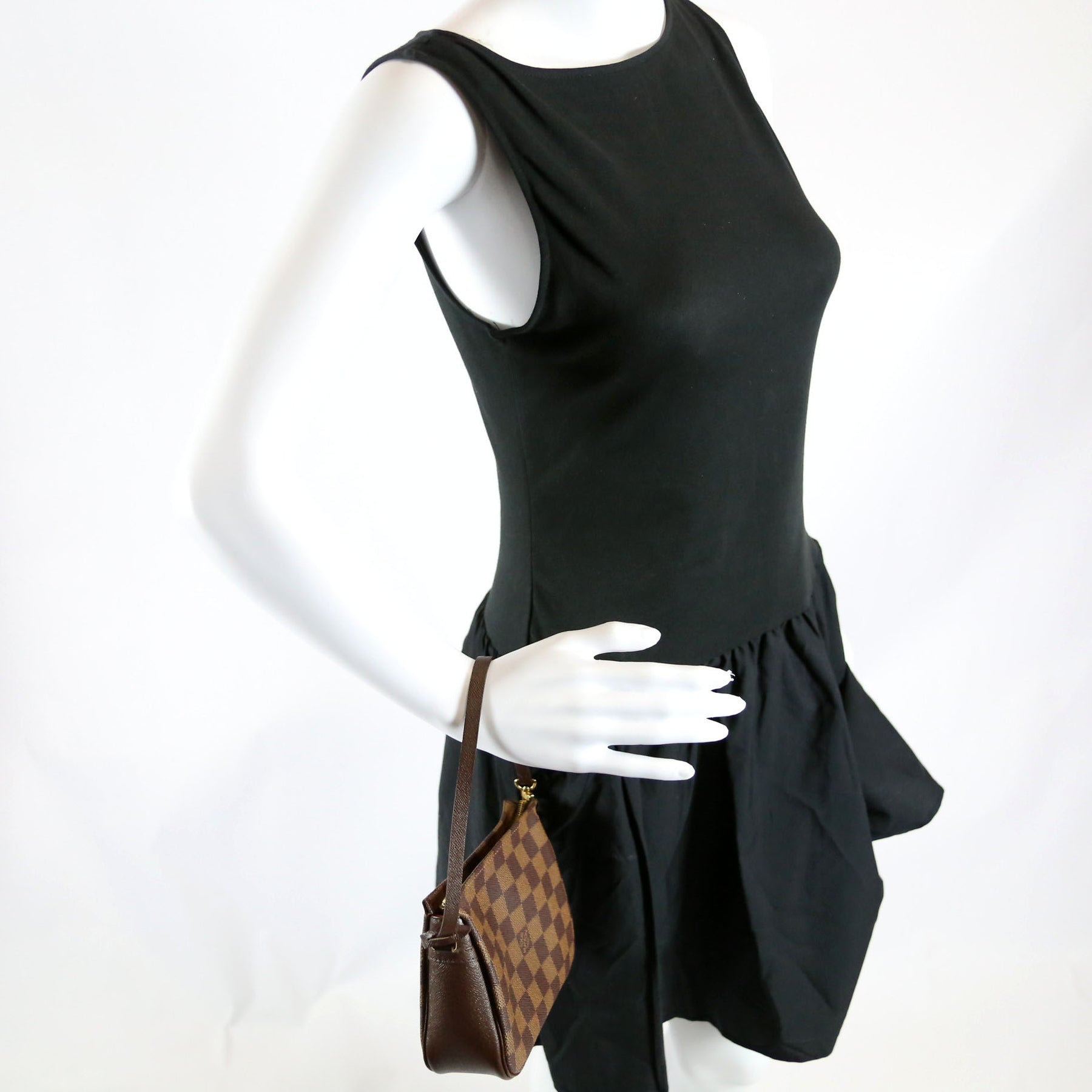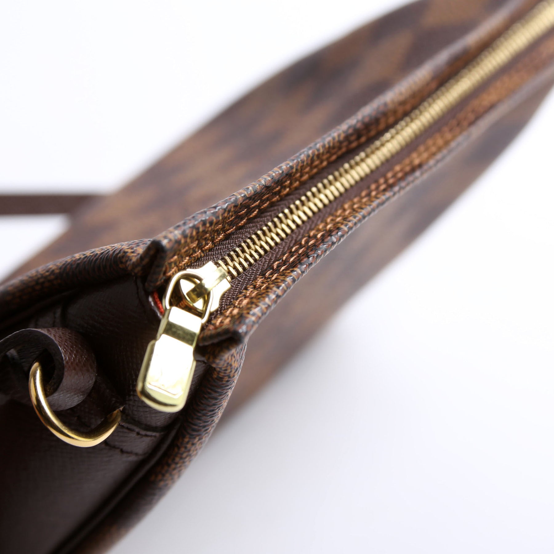 This pre-owned Louis Vuitton Trousse Makeup Pouch is guaranteed 100% authentic. The exterior is in the classic Louis Vuitton Damier Ebene coated canvas.